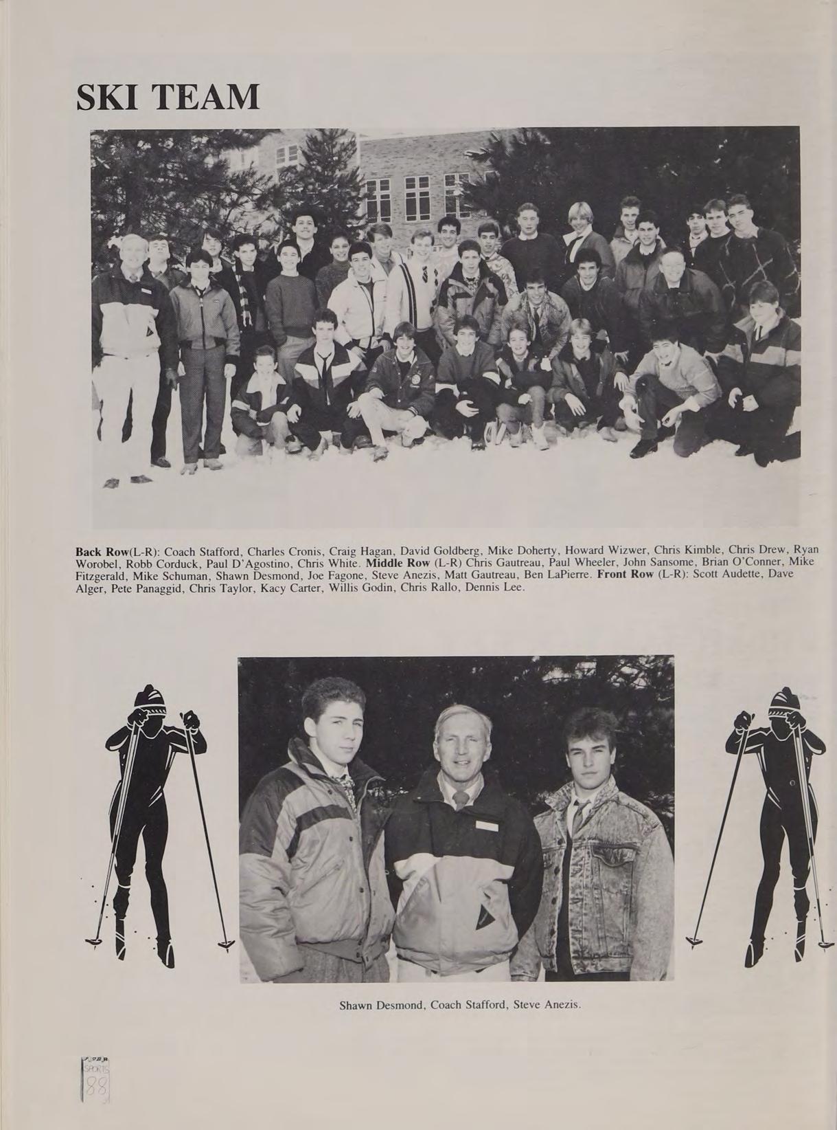 Football 2,3; Soccer 1; Ski Team 3,4 (Capt.); Track 2,4; Spanish Club 3,4; French Club 4; SADD 3; Orientation Committee 3,4; Class Secretary 3; Intramural Softball 4 Remembers: Sugarloaf ‘*85,’’ Crue Concert **87,’’ Sugarbush “*86,’’ Apple’s Party “‘87,’’ Krynox ‘*87,’’ Sunday River ‘‘87,”’ Colorado **86 & 87,’’ Goph’s Party ‘‘87,’’ Nelson’s New Years “*87 & 88,’’ M.C. vs. A.P. Football *‘84,’’ 10/16/87, Shebaco, Transportation “‘86 & 87,’’ Carpa’s Party ‘*87,’’ P.H.S. Girl’s locker room *‘86,’’ Bradford ‘*87, 88.’’ Good times with Ted, Coach, Matt, Lel, Heather, Bill, Rod, Clint, Phil, Paul, Pokey, Bill P., & my Family. Favorites: Skiing, w-skiing, biking, & girls; Led Zep, The Who & The Stones. Special thanks to: & B, V &E, S, J, my yia ya’s (family), & G Zolotes, Miss Barletta & good friends (my escape); Mostly to Mom and Dad, love you both, thanks for putting up with my skata. Cheers to Nathaniel — “Tl miss you Austin, I appreciate it, but get out of my face. guess I'll keep ramblin’ on.