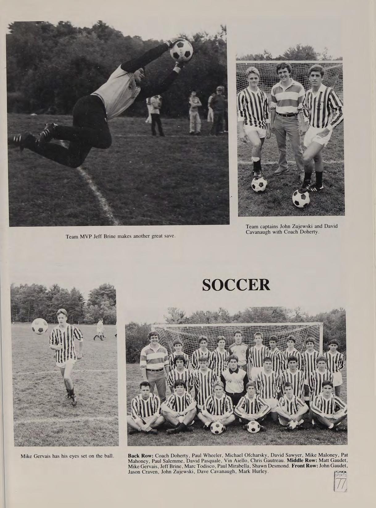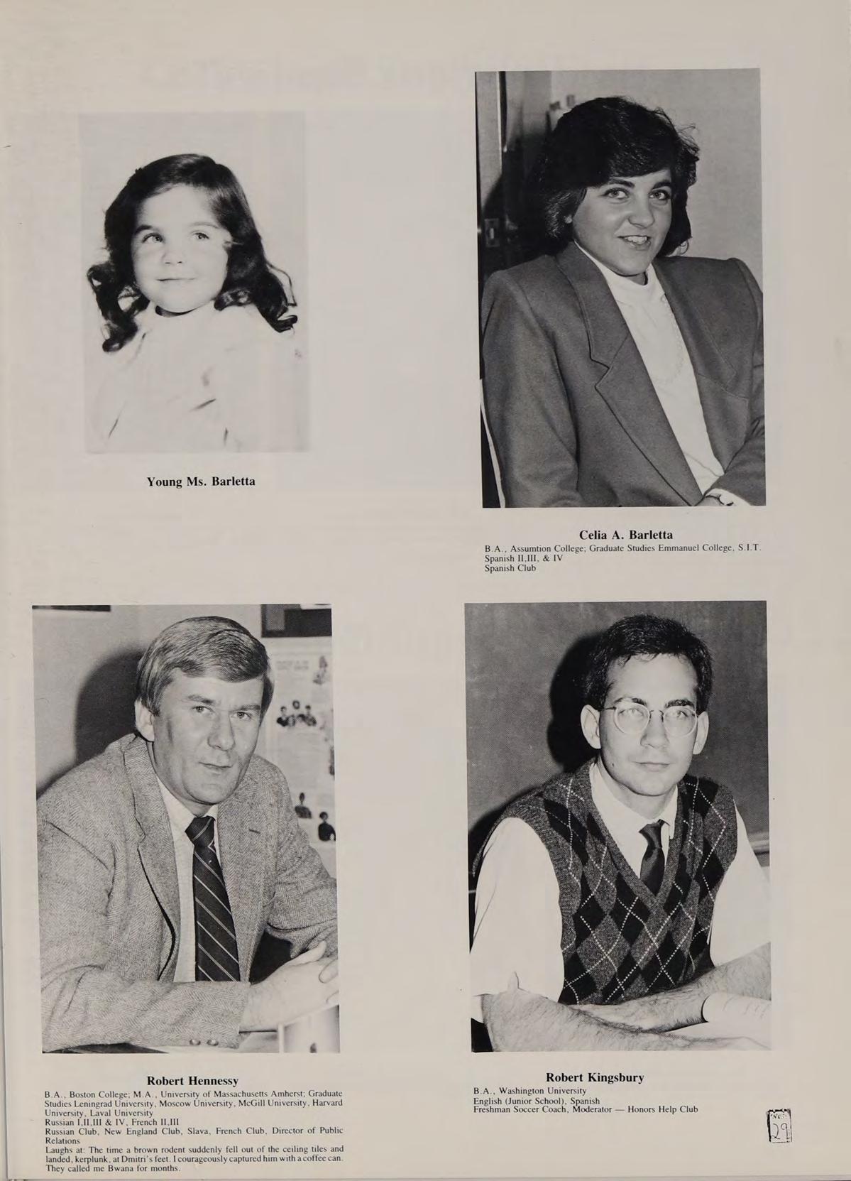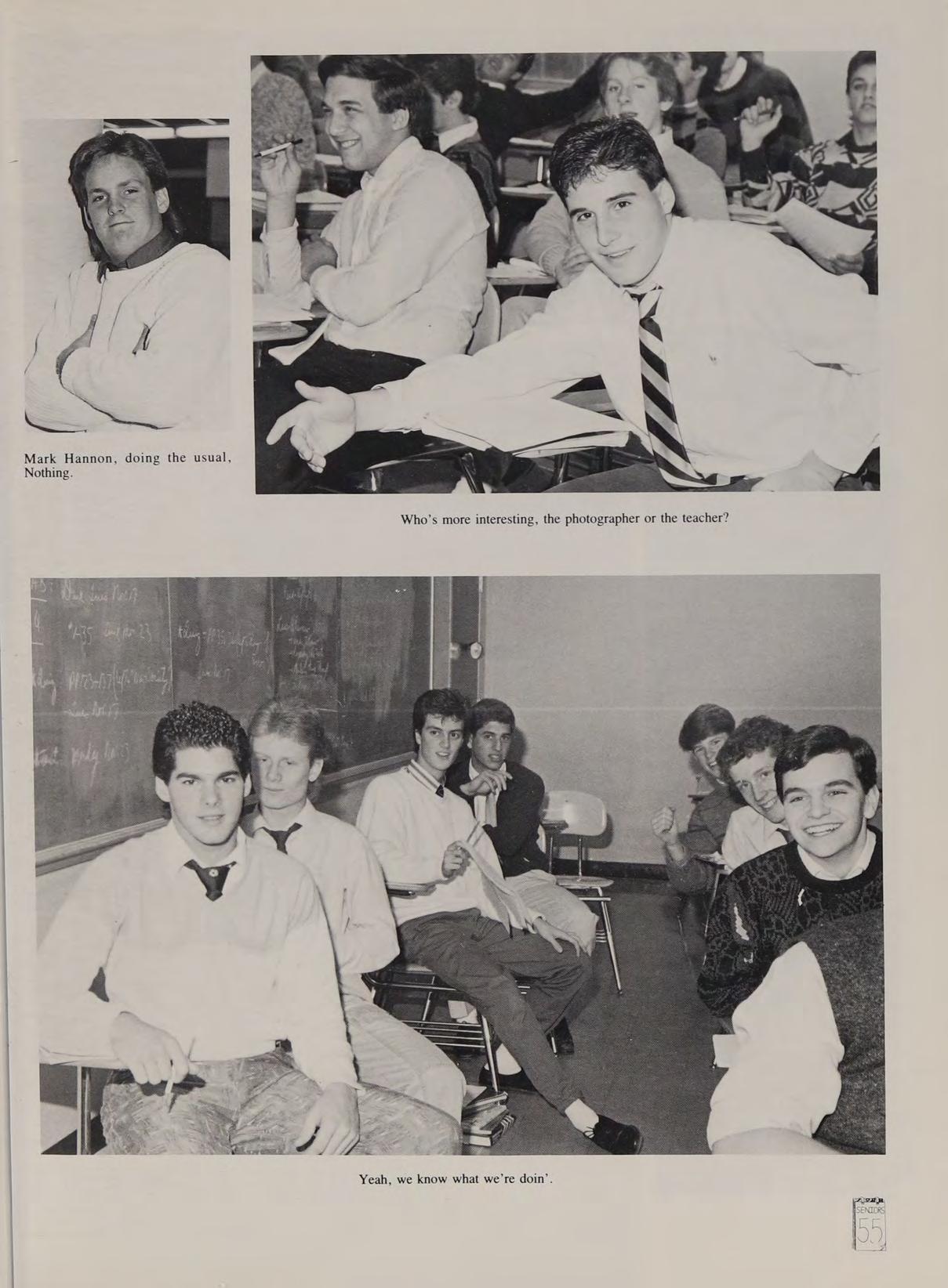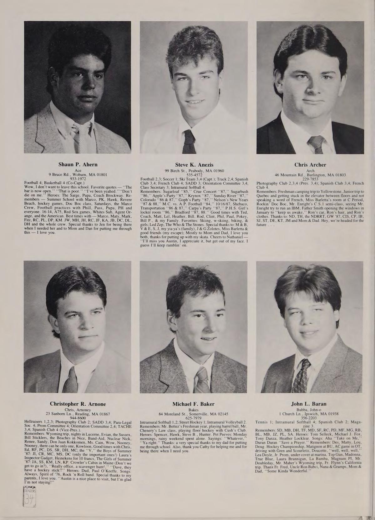 Tennis 1; Intramural Softball 4; Spanish Club 2; Magazine 3 Remembers: SD, MB, DH, TF, MD, SF, RC, PD, MF, MG, RB, BL, MB, JZ, PL, SA. Heroes: Tom Selleck, Michael J. Fox, Tony Danza, Heather Locklear. Songs: Aha *‘Take on Me,” Duran Duran ‘‘Save Prayer.’” Remembers: Des, Matty, Lou, Doug. Hockey Championship, Matignon at BU, AC game in OT, driving with Gren and Scourletis, Doucette, ‘‘well, well, well,” Lea Doyle, Jr. Prom, under cover at marina, Top Gun, Madonna, True Blue, Laura Brannigan, La Bamba, Magnum PI, Mr Doubleday, Mr. Maher's Wyoming trip, Fr. Flynn’s California trip. Thanx Fr. Fred, Uncle Ron Babci, Nana & Gramps, Mom & Dad, ‘*Some Kinda Wonderful.”’