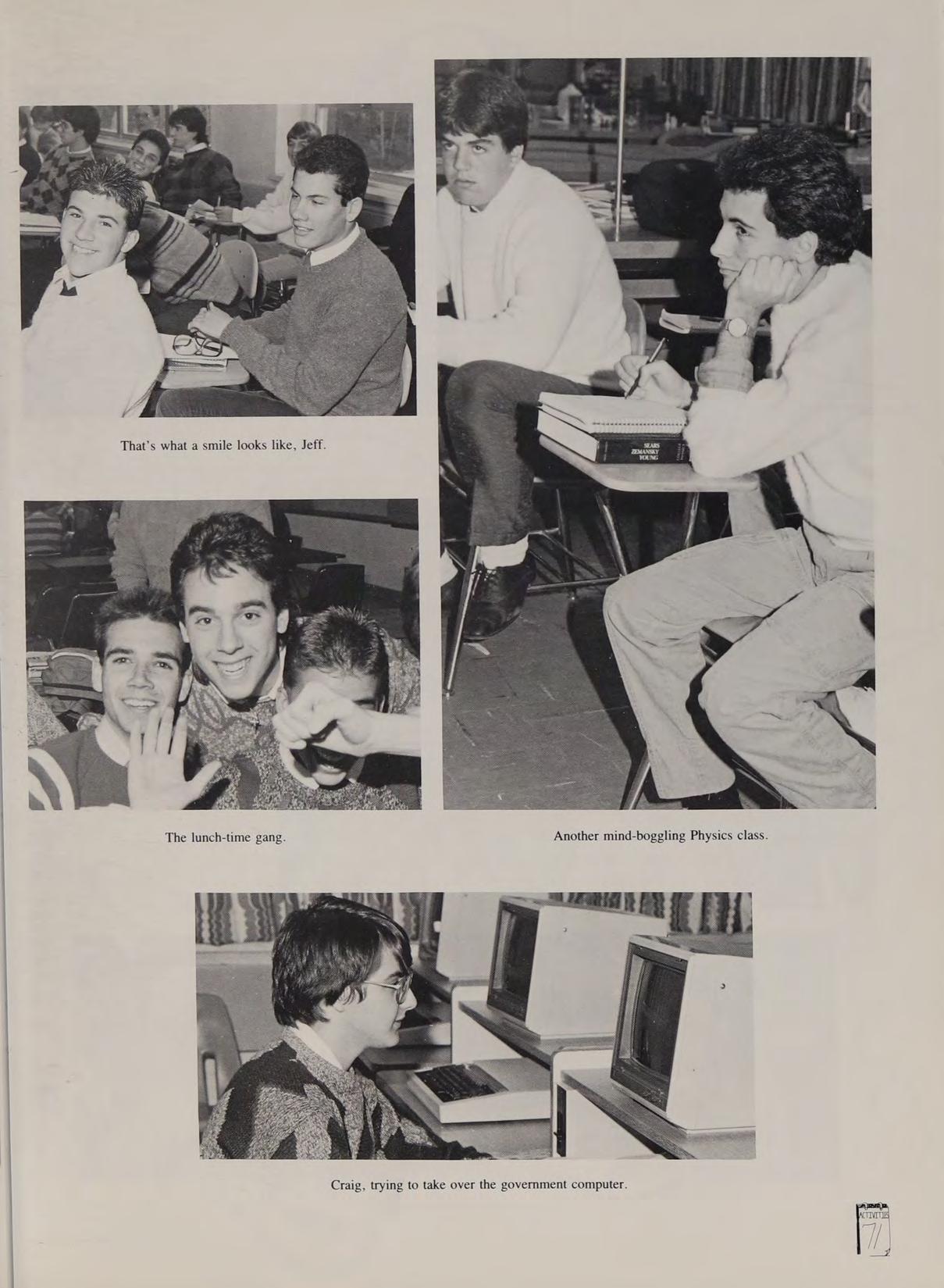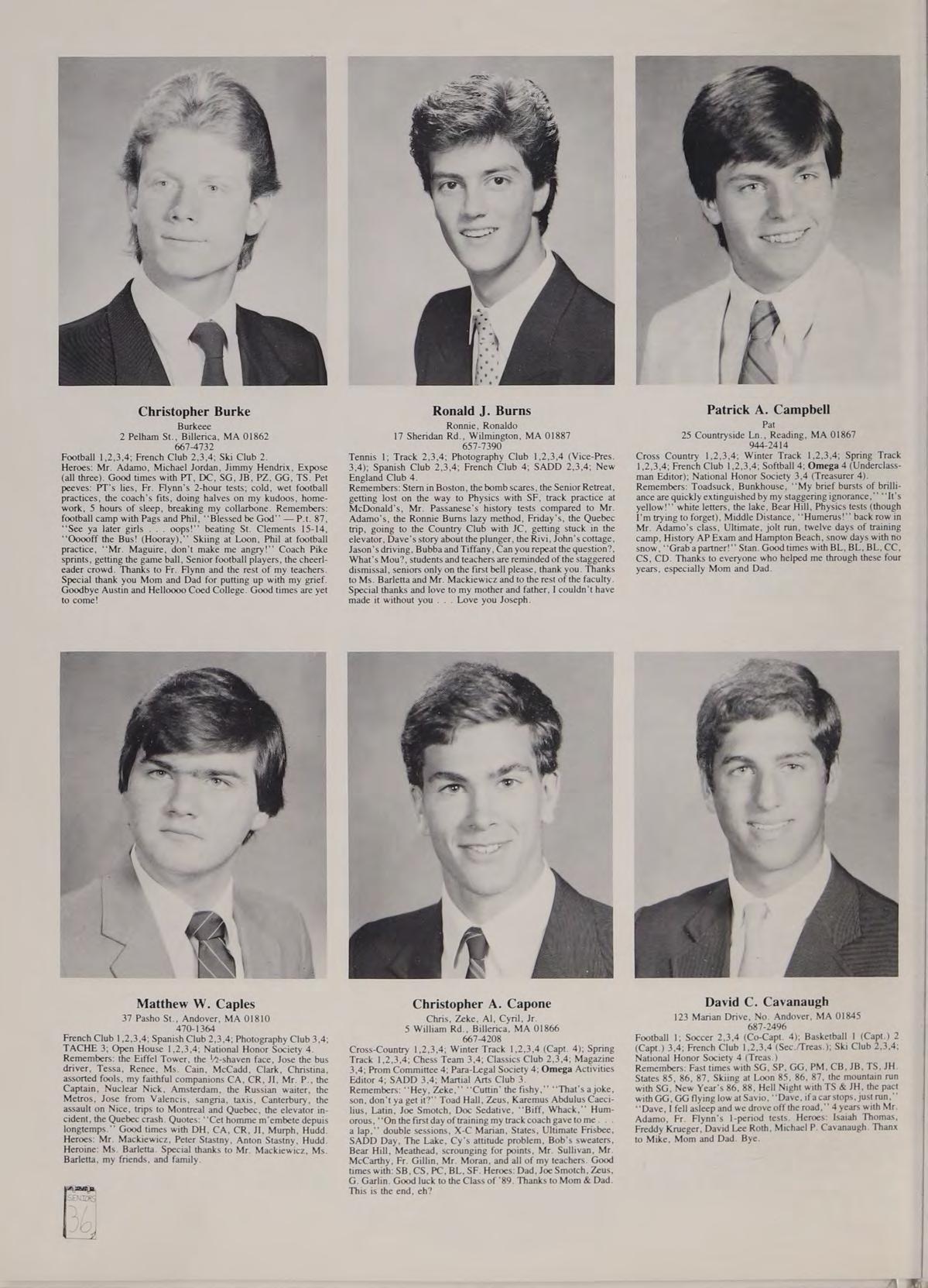 Cross-Country 2,3; Spanish Club 3,4. Remembers: RF, PO, PC, CA, DS, BC, SR, DM, AC, TM, SR, GG, SF, JI, JP. Thanks Dad and Bonnie. Boston in the car, Boston, Heart concerts, taking attendance, MacWongs, Well officer, it isn’t mine, some kid just gave it to me, Providence College trip, command you, Halloween, Hey move over, MMs card, Where are we? 216-IMO, the silver Camaro, the Green Machine, cruising in the boat, wave jumping, straighten out! the Square, New Year’s Eve, So do you like her? Hey, what did do? Thanks Thea, potato chips in the pool, that whole weekend, the lake at night, Reading, Wobum, Andover, N. Reading, the Chalet, Chi-Chis, Imitations, the Chameleon, Good times with everybody!