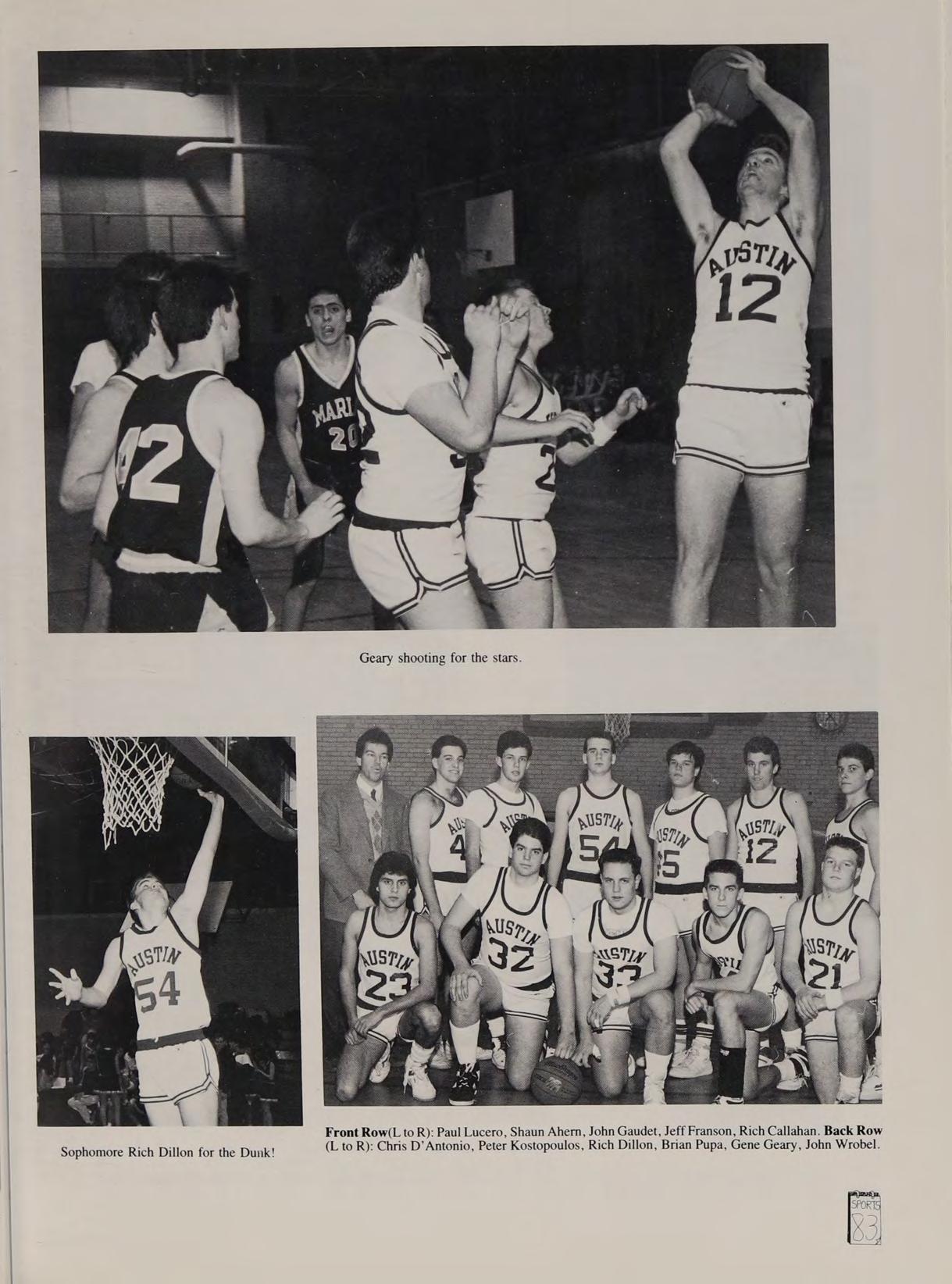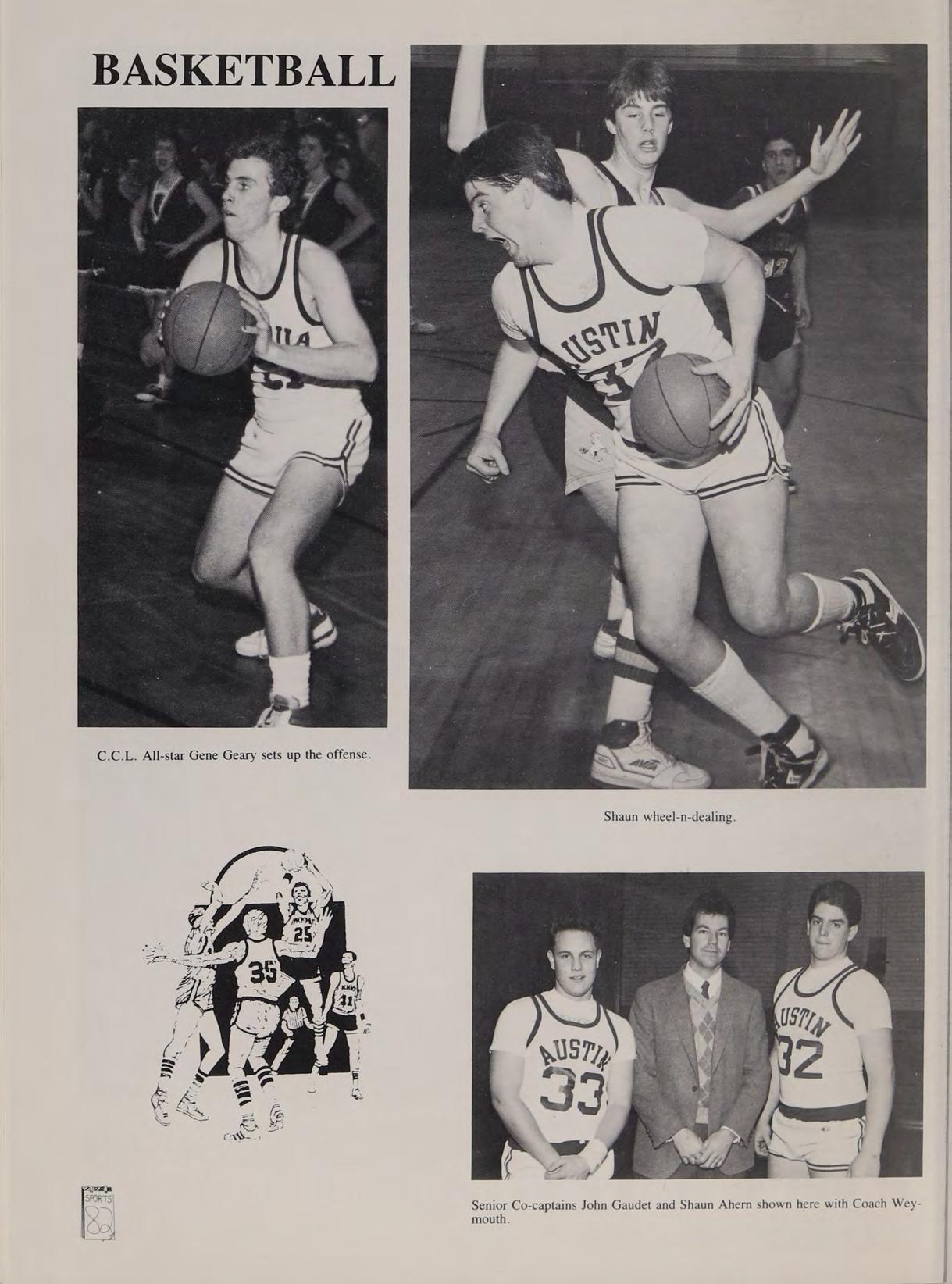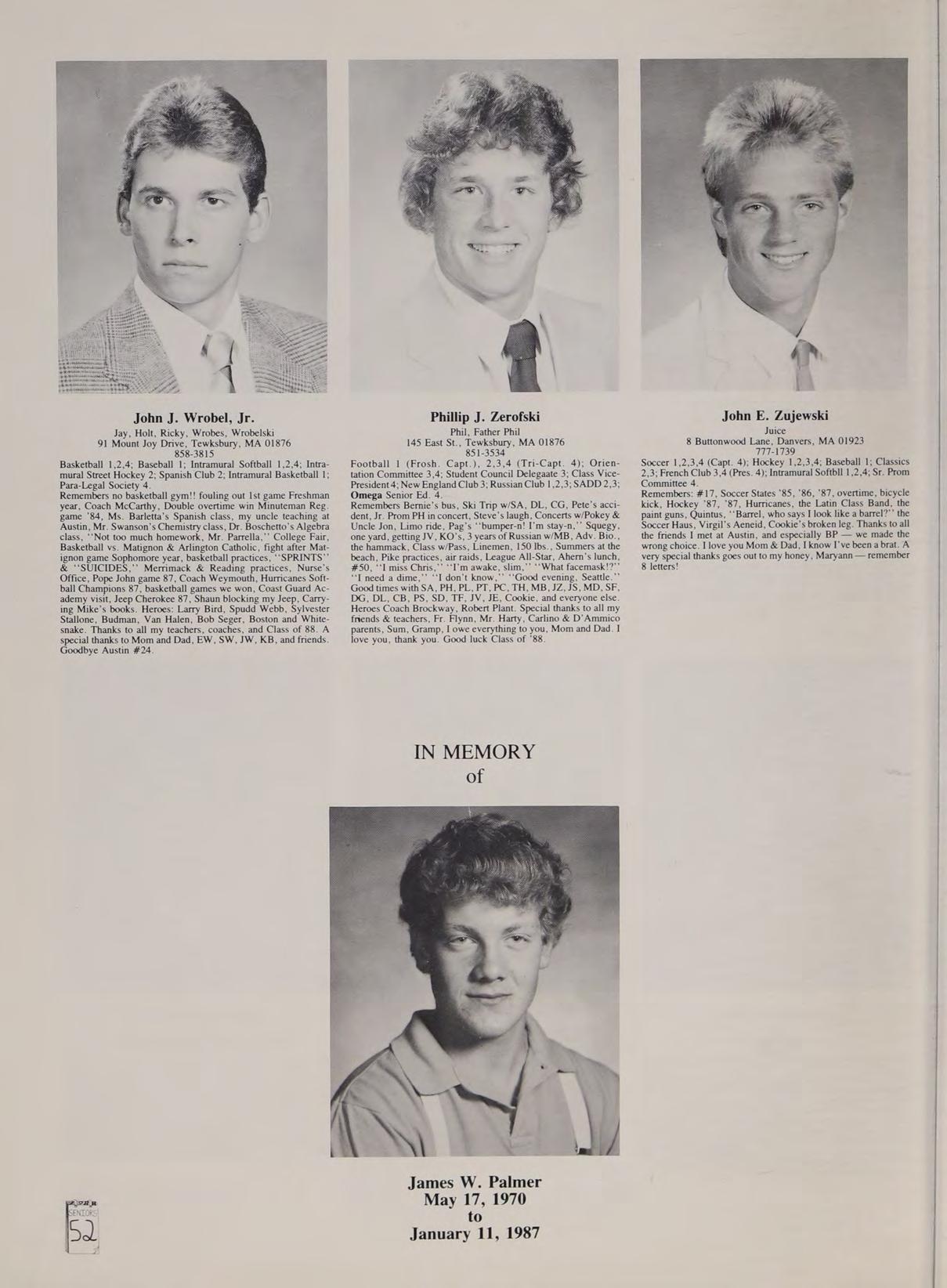 R 's Bernie’s bus, Ski Trip w/SA, DL, CG, Pete’s acci- eg. game 84, Ms. Barletta’s Spanish class, my uncle teaching at Austin, Mr. Swanson’s Chemistry class, Dr. Boschetto’s Algebra class, ‘‘Not too much homework, Mr. Partella,’’ College Fair, Basketball vs. Matignon & Arlington Catholic, fight after Matignon game Sophomore year, basketball practices, “‘SPRINTS’” & ‘‘SUICIDES,’’ Merrimack & Reading practices, Nurse’s Office, Pope John game 87, Coach Weymouth, Hurricanes Softball Champions 87, basketball games we won, Coast Guard Academy visit, Jeep Cherokee 87, Shaun blocking my Jeep, Carrying Mike’s books. Heroes: Larry Bird, Spudd Webb, Sylvester Stallone, Budman, Van Halen, Bob Seger, Boston and Whitesnake. Thanks to all my teachers, coaches, and Class of 88. A special thanks to Mom and Dad, EW, SW, JW, KB, and friends. Goodbye Austin #24.