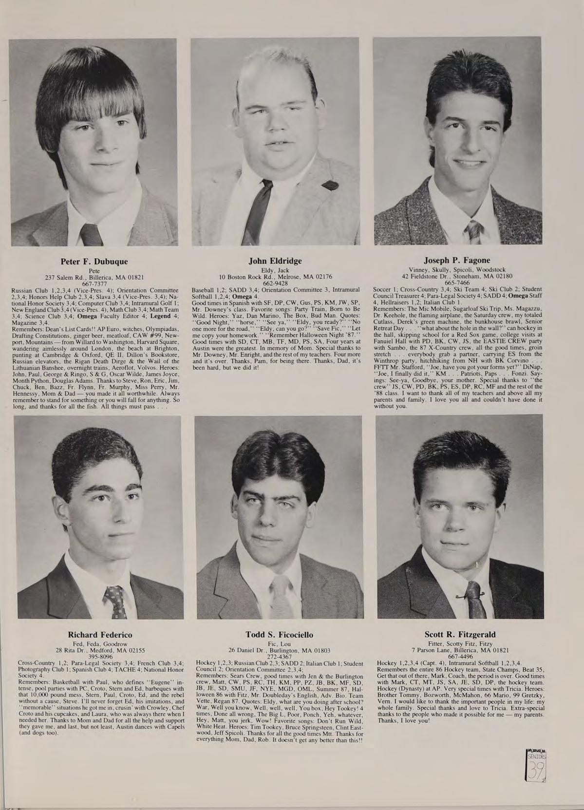 Wow, don’t want to leave this school. Favorite quotes — ‘*The bar is now open.”’ ‘That is poor.’’ ‘‘I’ve been yeahed.’’*‘Don’t die on me.’’ Heroes: The Sarge, Pupa, Coach Brockway. Remembers — Summer School with Marco, PK, Hawk, Revere Beach, hockey games, Doc Boe class, Saturdays, the Marco Crew, Football practices with Phill, Pass, Pupa, PH and everyone. 16-14, A75, Red Sox games, Whites Sub, Agent Orange, and the American. Best times with — Marco, Maty, Mark, Fitz, RC, PL, DP, KM. JW, MH, JH, RC, JF, KA, JB, DC, DL, DH and the whole crew. Special thanks to Jen for being there when needed her and to Mom and Dan for putting me through this — love you.