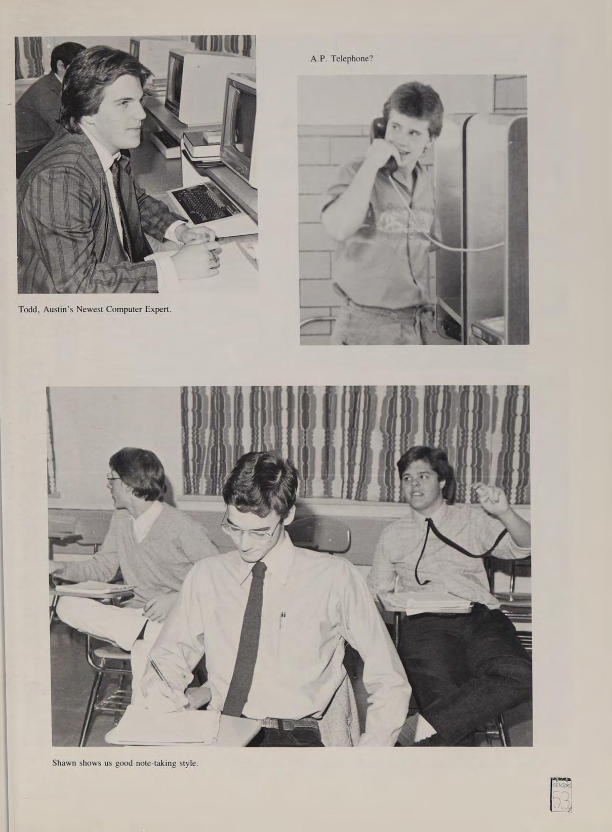 Remembers: Freshman camping trip to Yellowstone, Junior trip to Quebec and getting stuck in the elevator between floors and not speaking a word of French, Miss Barletta’s room at C Period, Rockin’ Doc Boc, Mr. Enright’s C.S.1 semi-class, seeing Mr. Enright try to run an IBM, Father Smith opening the windows in January to ‘‘keep us awake,’’ Ron’s car, Ron’s hair, and Ron’s clothes. Thanks to: ND, TH, the NDRRT, GW °87, CIS, CP, IB, SJ, ST, DE, KT, JM and Mom & Dad. Hey, we're headed for the future