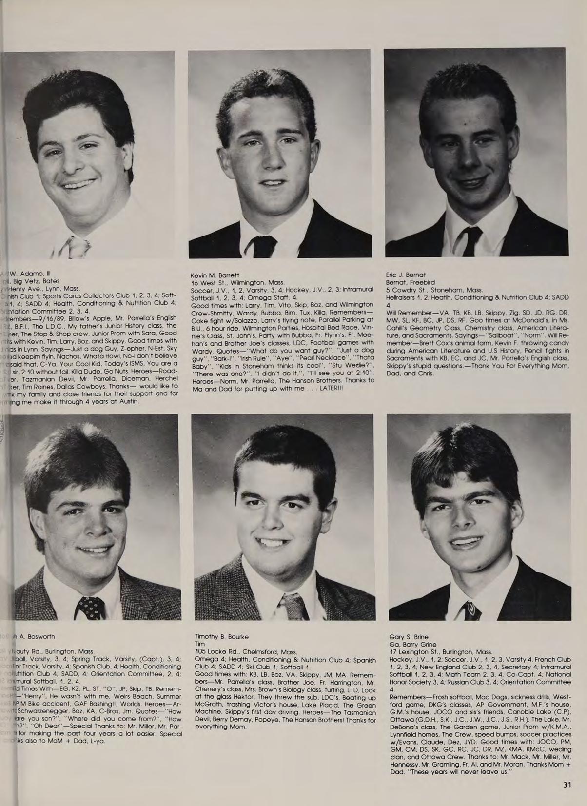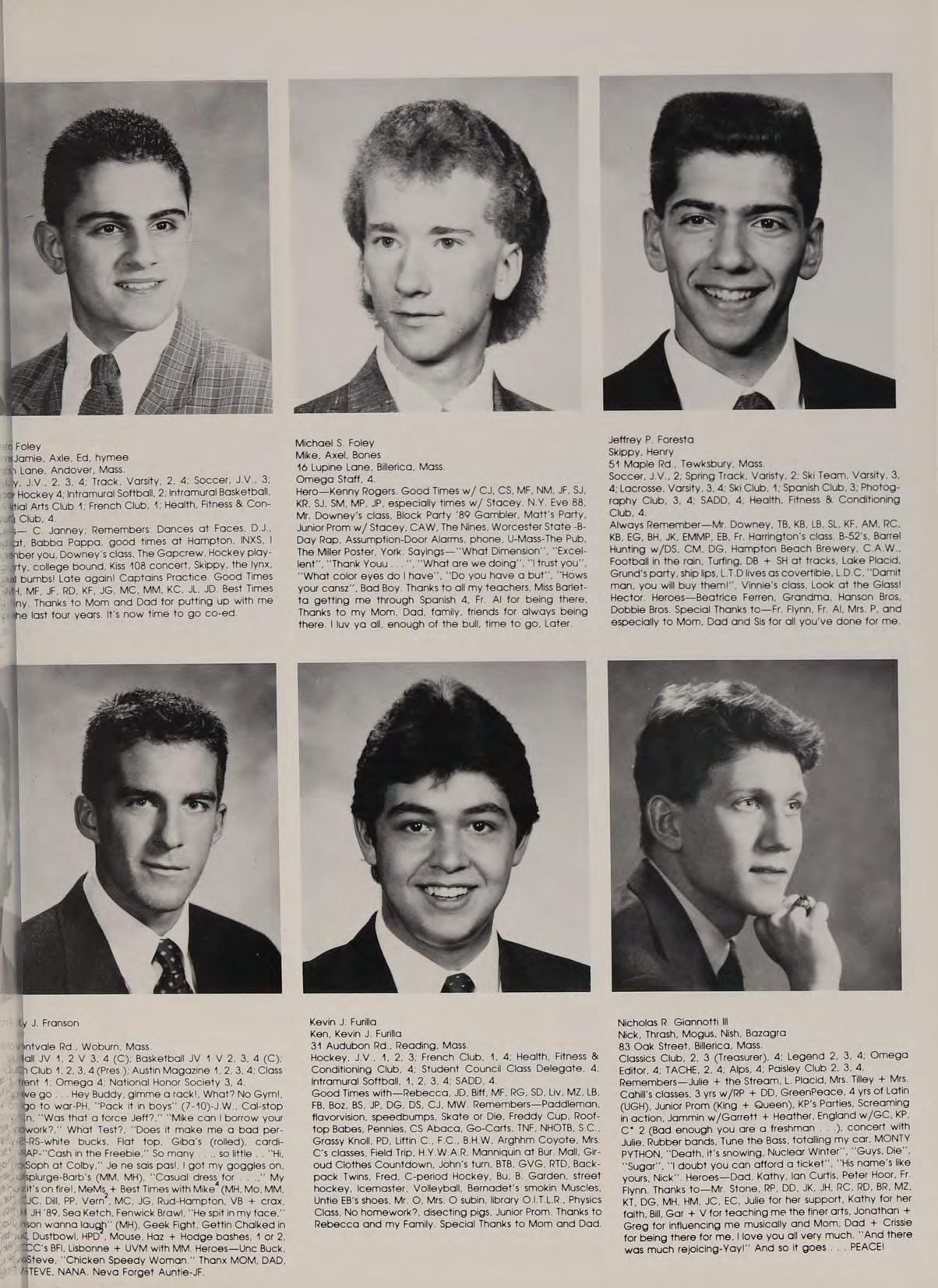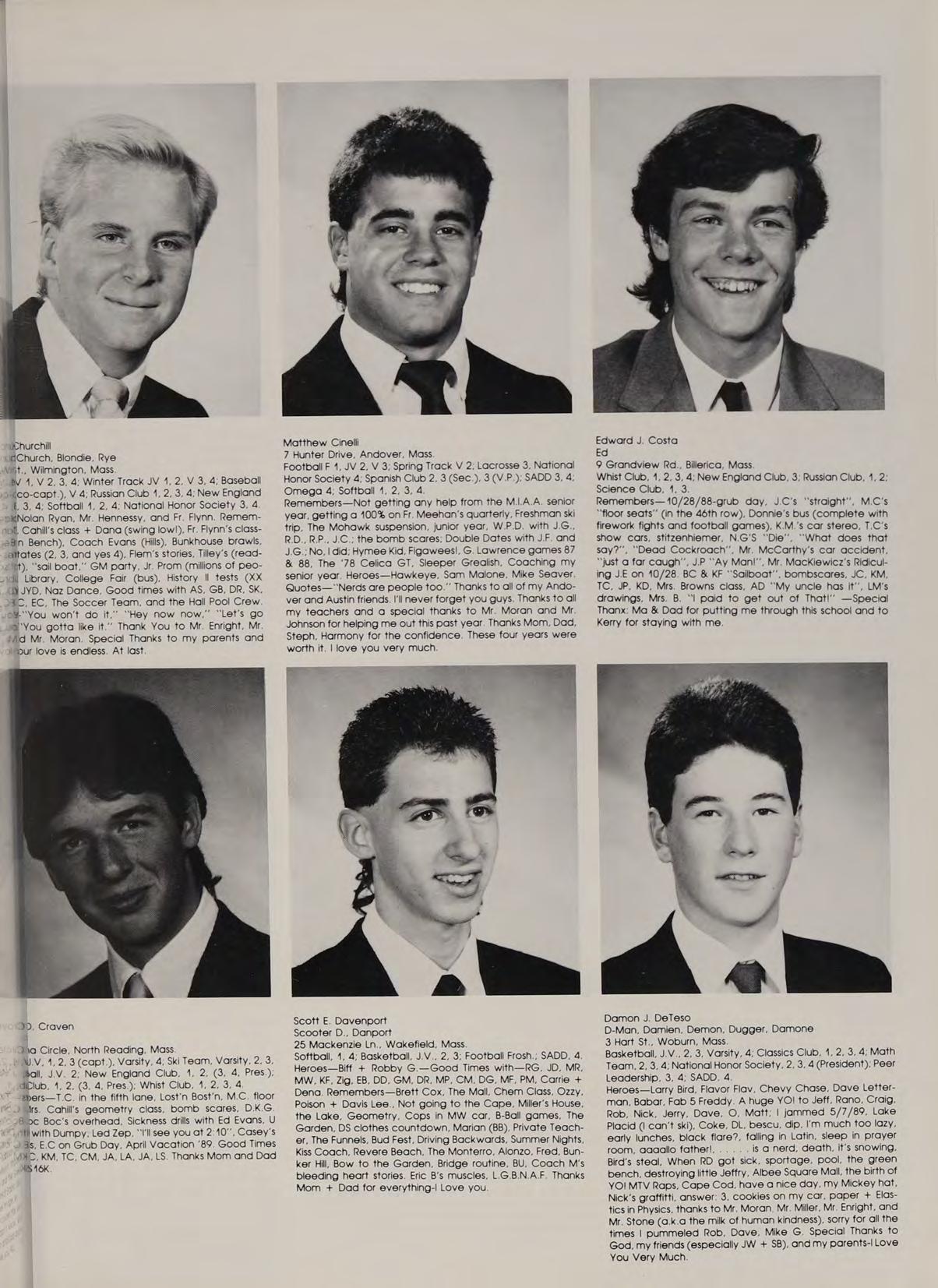 Dr. Zebra, Zig, Mr A (Capt.) 22 Lee St., Stoneham, Mass Lacrosse-2, 3, 4 (capt), Basketball Manager-3, 4 Class Secretary-3, 4 Classics Club-1, 2, 3, 4 (sect/treas) Orientation Committee 2, 3, 4 Intramural Softball-1, 2, 3, 4 Peer Leadership-3, 4 Hugh O'Brian Leadership Representative 2 The Legend-1, 2, 3, 4 Remembers: David Lee Roth w/Robin Lynn, Great Woods, Kevins Cape House, go-carts, Bourne Bridge, Good Times with-Maddie, RG, DS, LIVIE, KF, MDF, JP, RP, GC, Latin Class, Jr Prom A.P. Cool Posse, Brew Crew, Sue Club, M club, Canada Lake Placid, Heroes: My Dad, Biff, Batman, Work The Dish, Raiders #1, RH: The Best, Stop The Press, These People are Not Super Heroes, BU state tourney games, Millers Bash, The Stoneham Parties, Lip Sync, Nothin But A good Time, Burlington Mall, Faces, Heritage, Special Thanx MS 7/2/89, Lax Practice, the 86 Sox. Thanx to Mr Stone and Mr Gramling Mom and Dad | Love You, you too Maria the best sister. John 3:16. See ya! 41