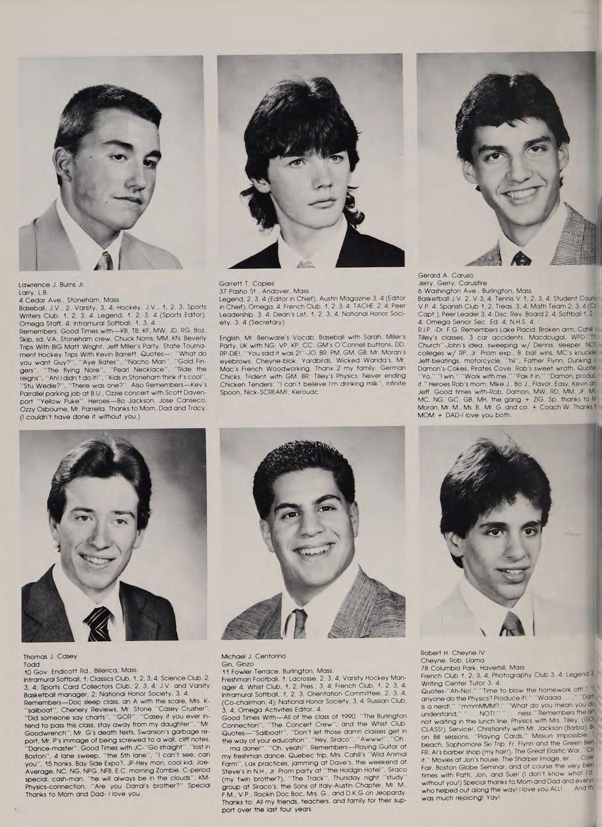 5 Colonial Drive, Billerica, Mass Hockey (Lawrence Academy), 1-4 Quotes: Porksword, Lets prank Harry, BoBo get in the box, Heroes: Wayne Gretsky, “The Only Great One’’, Remembers Partying at Hampton, CO, Bd, Junior Prom Billerica Center, DS, SL, RW, getting busted at lampson, Tillys gym 7-0, MR, BA, Chem Class Shake It Baby, Lake Placid, the vett chic, MM, KM, FL 84, RL, MH, the car will not start, track MC, its only $150 worbs. Thanks for the times-CD, BO, DS, SL, CL, MR, BA, RW. JS, SS, MH, JC, TC, SH Special Thanks to the people at Lawrence and my friends in Billerica, Mr Gramling, Mr McAdam, Thanks for the chance Blaise, Thanks Beth, Someday Sarah! BoBo and most of all my family MOM, DAD, MARK LOVE YOU