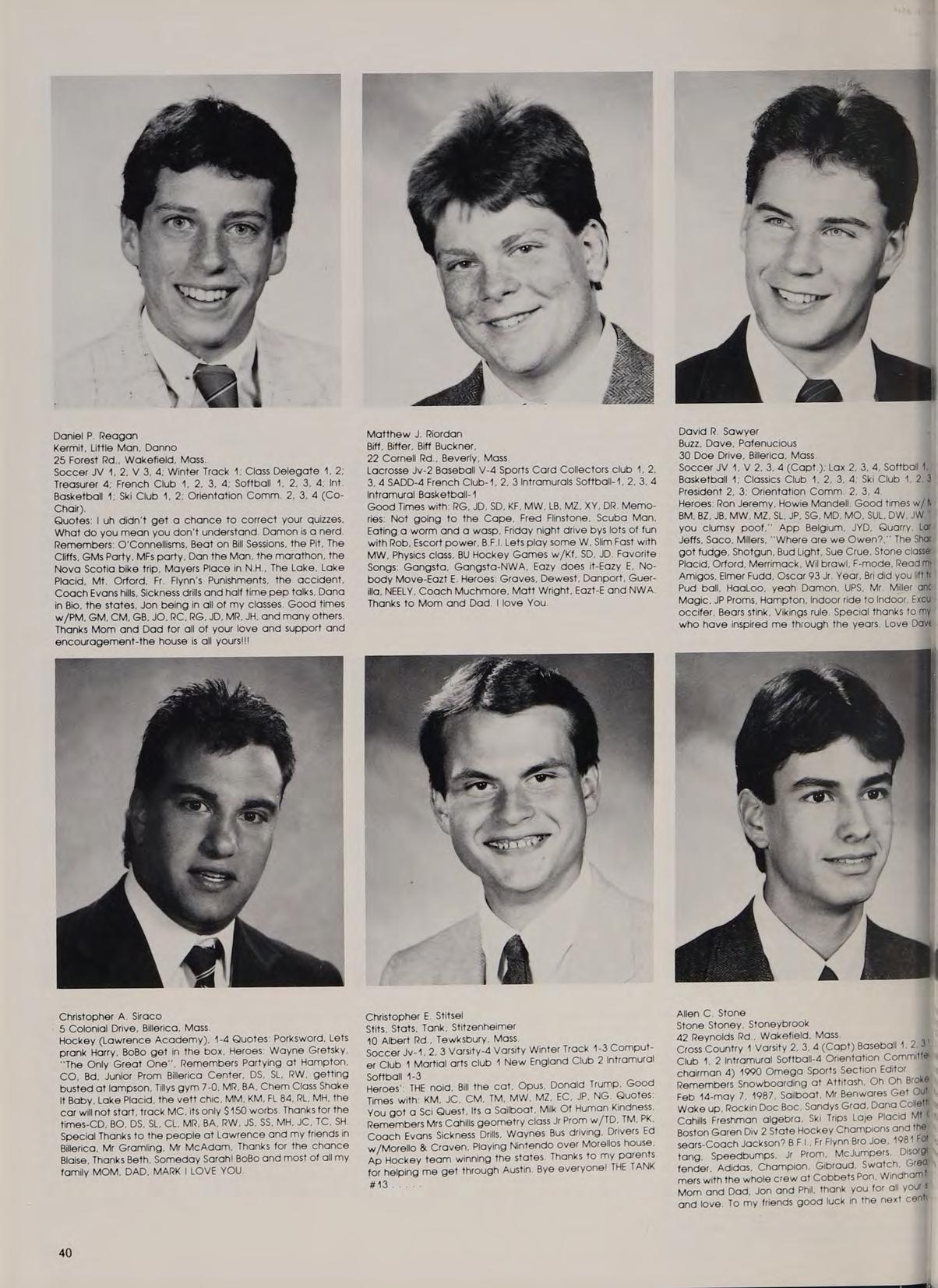 Stone Stoney, Stoneybrook 42 Reynolds Rd., Wakefield, Mass Cross Country Varsity 2, 3, (Capt) Baseball 1, 2, KI Club 4, 2 Intramural Softball-4 Orientation Committe chairman 4) 1990 Omega Sports Section Editor Remembers Snowboarding at Attitash, Oh Oh Broke Feb 14-may 7, 1987, Sailboat, Mr Benwares Get Out, Wake up, Rockin Doc Boc, Sandys Grad, Dana Collett: Cahills Freshman algebra, Ski Trips Laje Placid Mf © Boston Garen Div 2 State Hockey Champions and thé sears-Coach Jackson? B.F.I., Fr Flynn Bro Joe. 1981 FOF tang, Speedbumps, Jr Prom. McJumpers, Disorge® fender, Adidas, Champion, Gibraud, Swatch Gree mers with the whole crew at Cobbets Pon Windhame Mom and Dad, Jon and Phil, thank you for all yours and love. To my friends good luck in the next cenit