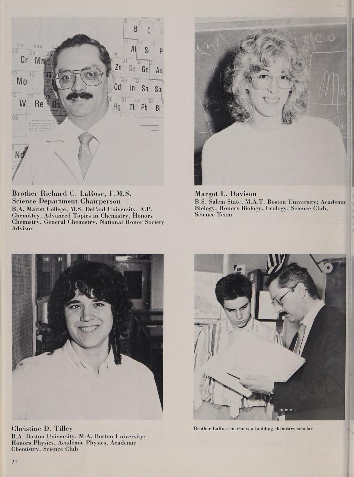 B.A. Marist College, M.Th. U. of Ottawa, S.T.B. St. Paul, M.A. U. of Detroit, M. Div. U. of Ottawa, Certificates of Studies; Spanish and Italian Bolivia, Florence; Spanish I, II, Latin I, English 7, Social Studies 8; Coordinator; Peer Tutoring; Favorite Quote: “Se non e vero e ben trovato!”