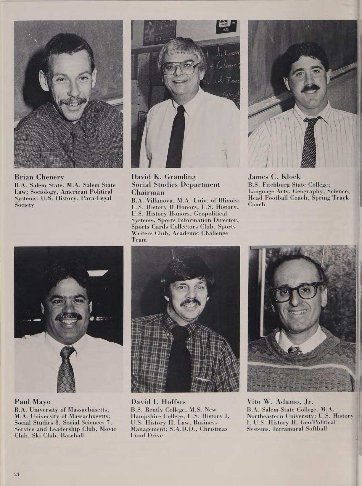 B.S. Bently College, M.S. New Hampshire College; U.S. History I, U.S. History Il, Law, Business Management; S.A.D.D., Christmas Fund Drive