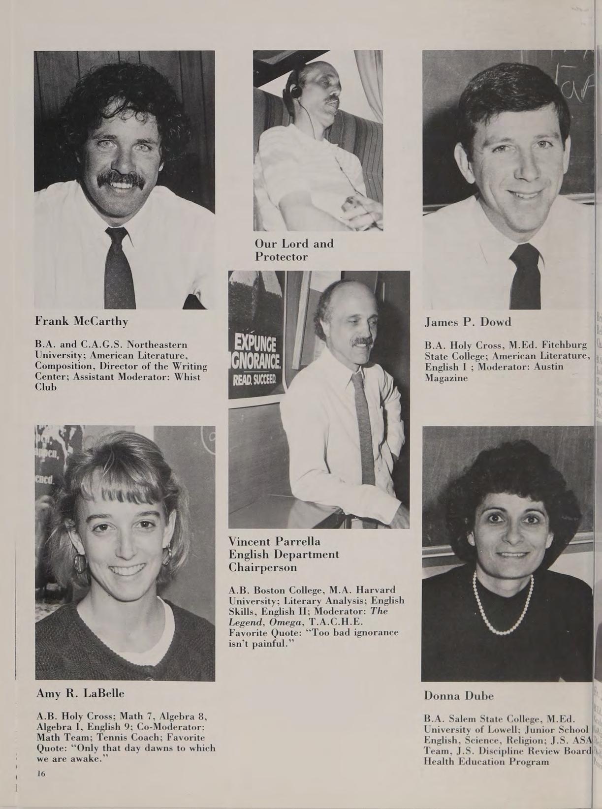 A.B. Boston College, M.A. Harvard University; Literary Analysis; English Skills, English Il; Moderator: The Legend, Omega, T.A.C.H.E. Favorite Quote: “Too bad ignorance isn’t painful.”