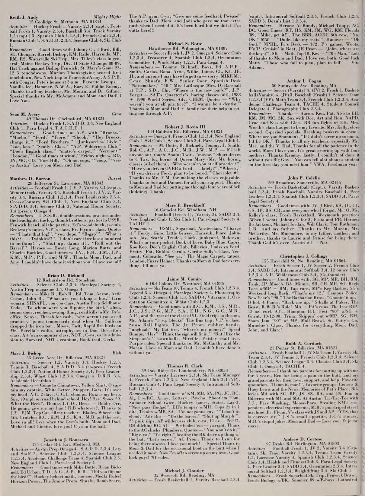 Remembers: Bob Trip 90, Tallin, Moscow, N.E.C. Ski ‘rip to Waterville, J.M.’s Prom party, Halloween, 3 teeks at a picnic, movies, etc., A.P. Chem — No Prob‘em!, Hampton & Seabrook, No jumpin’ on the rental -kis!, Back Bowls of Nashoba!, toe top of Bradford, The 9creamin’ Olive, ““You won’t do it,’ RUSH, ‘Grub ay,” “Rob-Bob, whatever,” Physics Class — In Control, Good Times with RM, TD, JM, MR, KM, MB & 1£0., To my Mom & Dad — thanx very much for the »ncouragement and strength for the last four years — I vove You! Good Luck to the Class of °91!