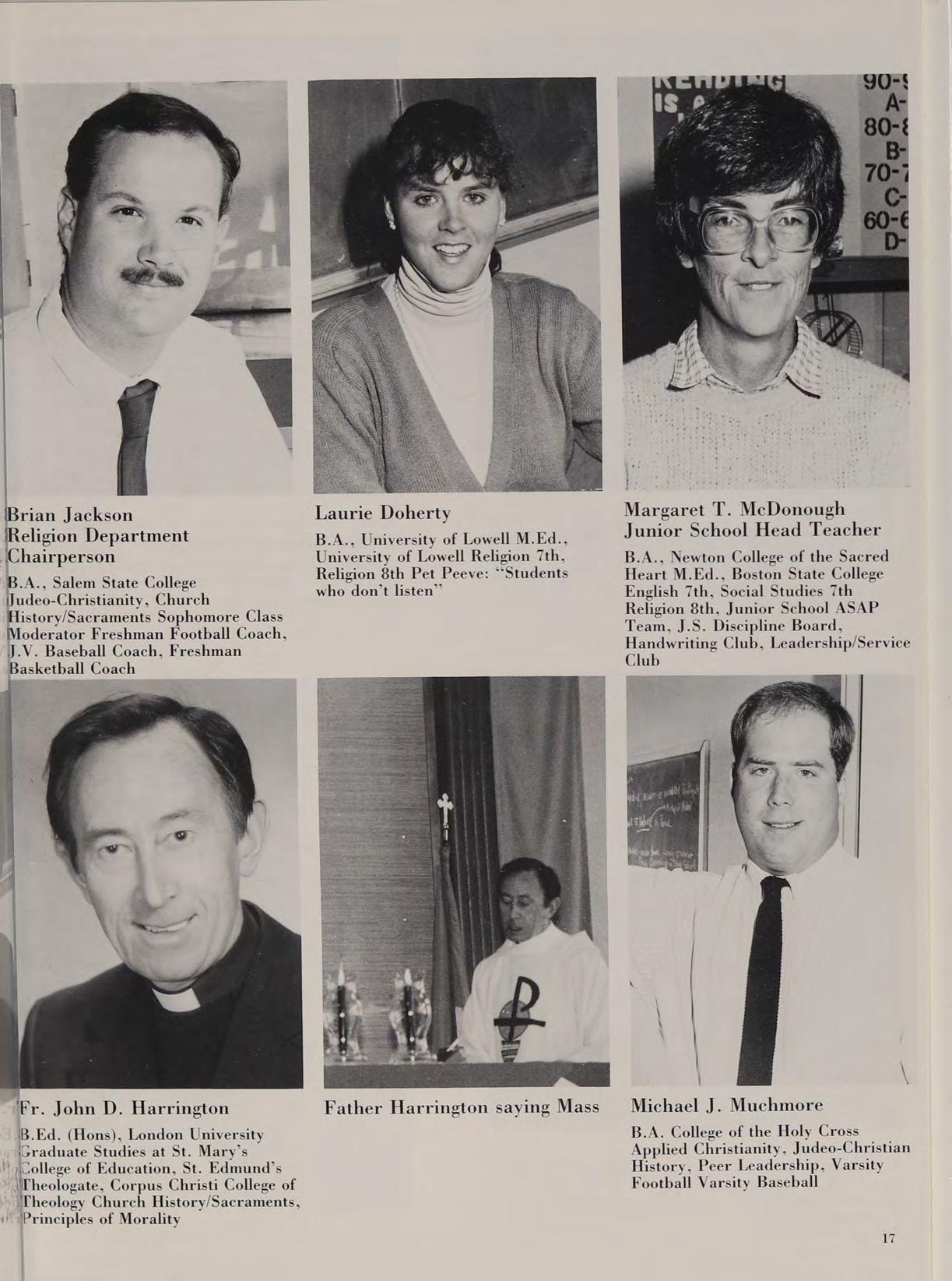 B.A., Salem State College Judeo-Christianity, Church History/Sacraments Sophomore Class Moderator Freshman Football Coach, J.V. Baseball Coach, Freshman Basketball Coach