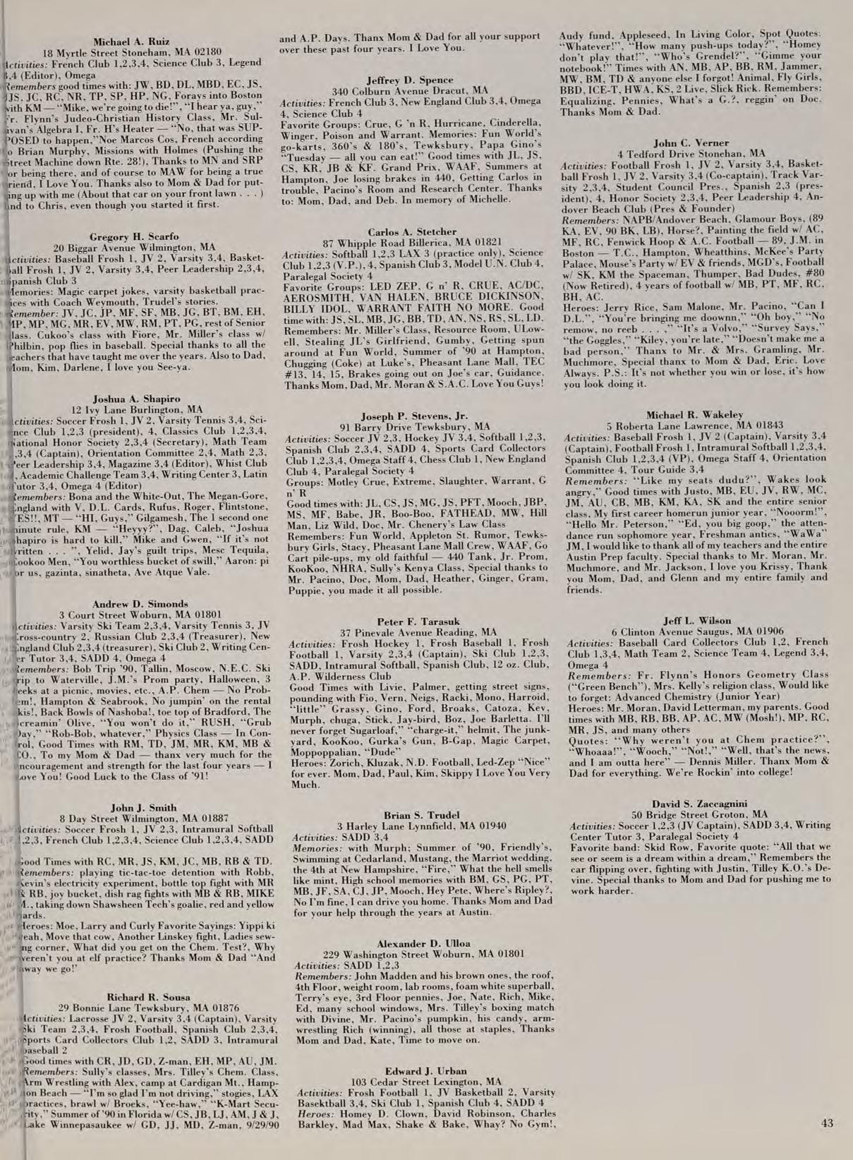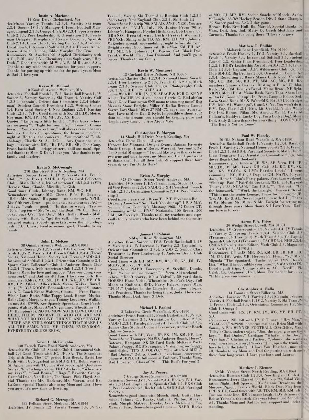 Activities: Frosh Football 1, Frosh Basketball 1, JV 2,3, Varsity Lacrosse 3,4, Orientation Committee, 2,3,4, SADD 1,2,3,4, Paralegal Society 4, French Club 1,2,3,4, Junior Class Student Council Treasurer, Andover Beach Club — Society
