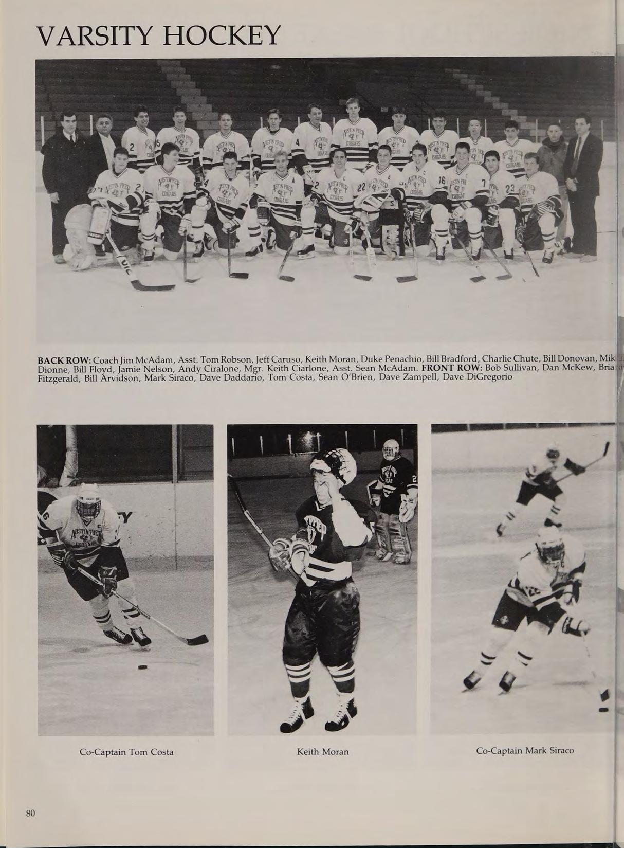 BACK ROW: Coach Jim McAdam, Asst. Tom Robson, Jeff Caruso, Keith Moran, Duke Penachio, Bill Bradford, Charlie Chute, Bill Donovan, Mik Dionne, Bill Floyd, Jamie Nelson, Andy Ciralone, Mgr. Keith Ciarlone, Asst. Sean McAdam. FRONT ROW: Bob Sullivan, Dan McKew, Bria Fitzgerald, Bill Arvidson, Mark Siraco, Dave Daddario, Tom Costa, Sean O’Brien, Dave Zampell, Dave DiGregorio