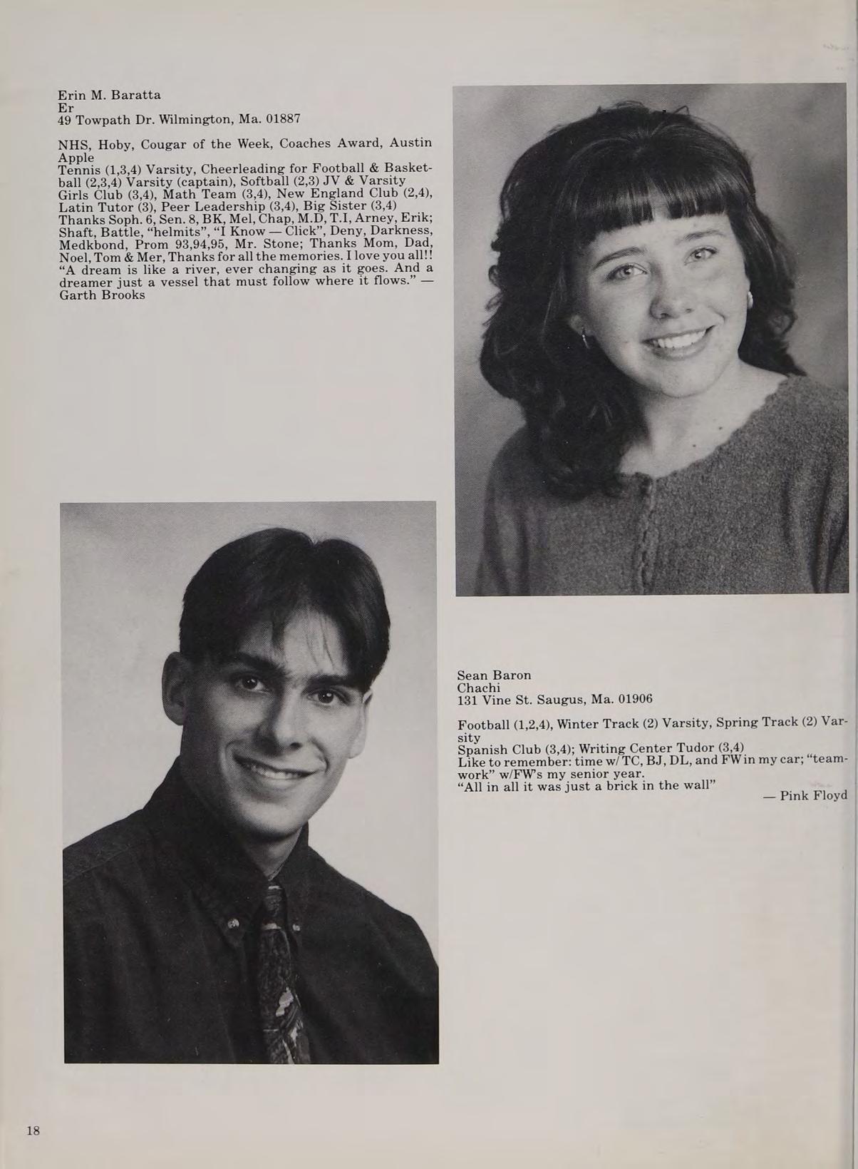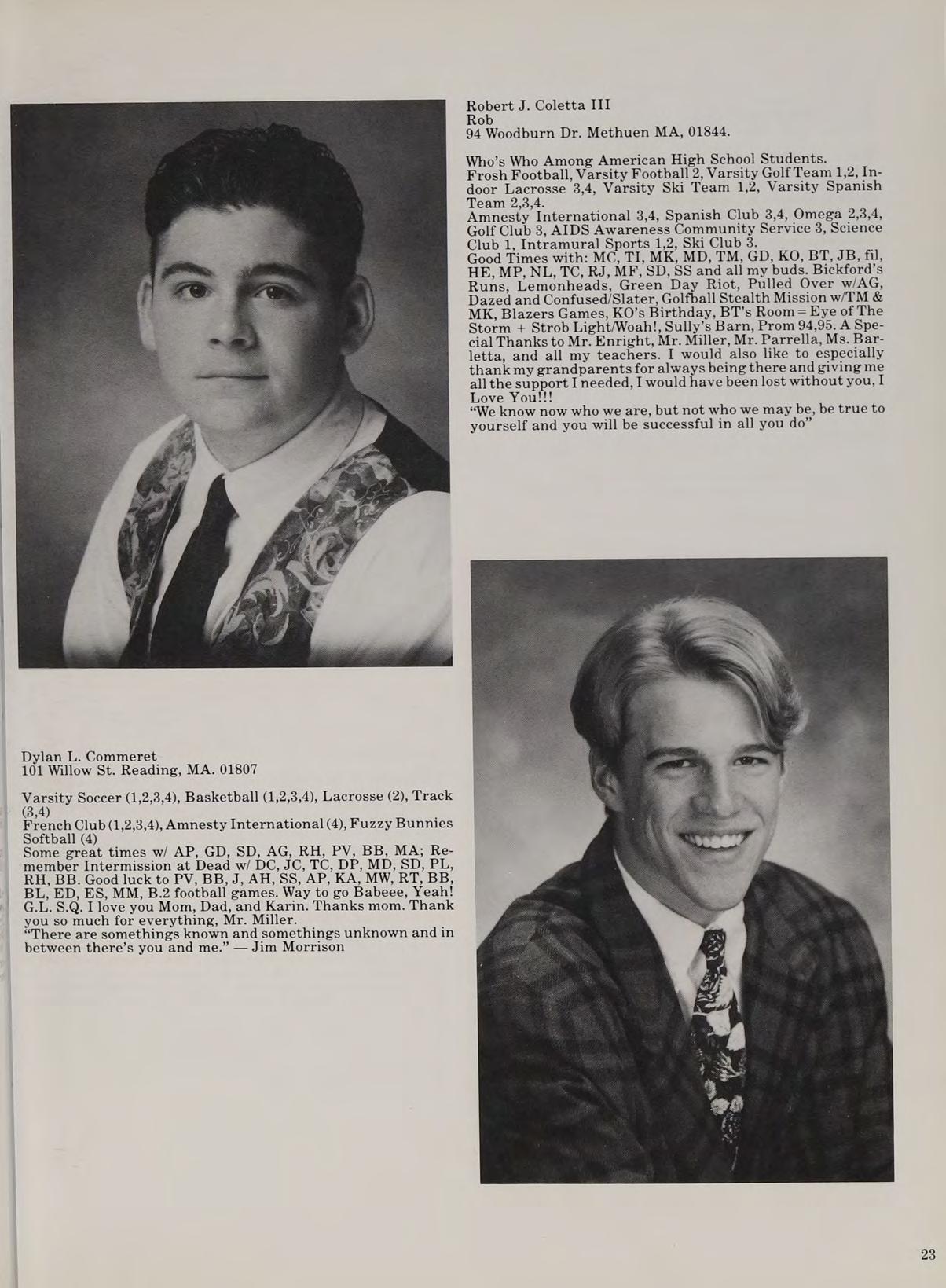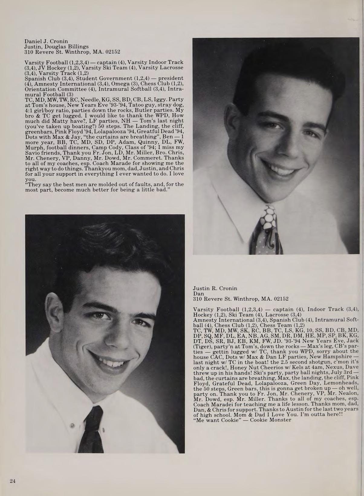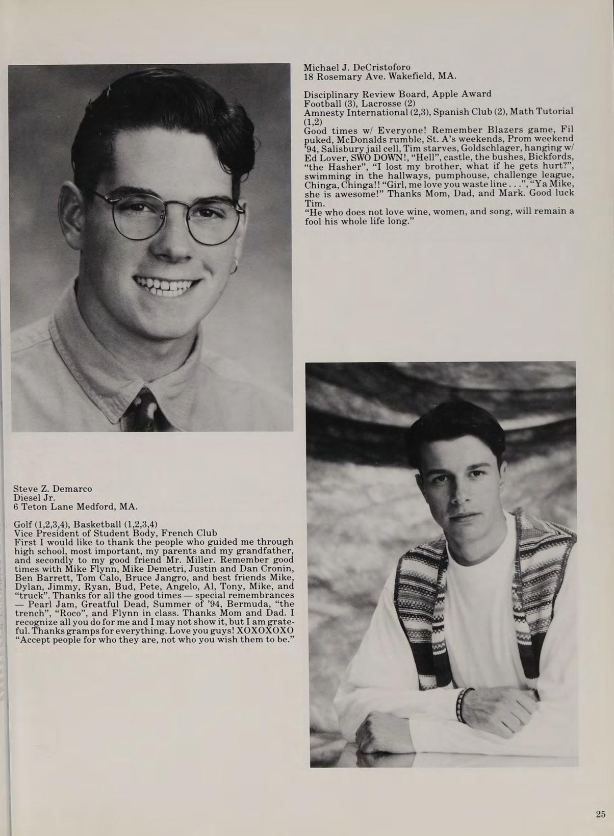 Good Times with: MC, TI, MK, MD, TM, GD, KO, BT, JB, fil, HE, MP, NL, TC, RJ, MF, SD, SS and all my buds. Bickford’s Runs, Lemonheads, Green Day Riot, Pulled Over w/AG, Dazed and Confused/Slater, Golfball Stealth Mission w/TM & MK, Blazers Games, KO’s Birthday, BT’s Room = Eye of The Storm + Strob Light/Woah!, Sully’s Barn, Prom 94,95. A Special Thanks to Mr. Enright, Mr. Miller, Mr. Parrella, Ms. Barletta, and all my teachers. I would also like to especially thank my grandparents for always being there and giving me all the support I needed, I would have been lost without you, I Love You!!!