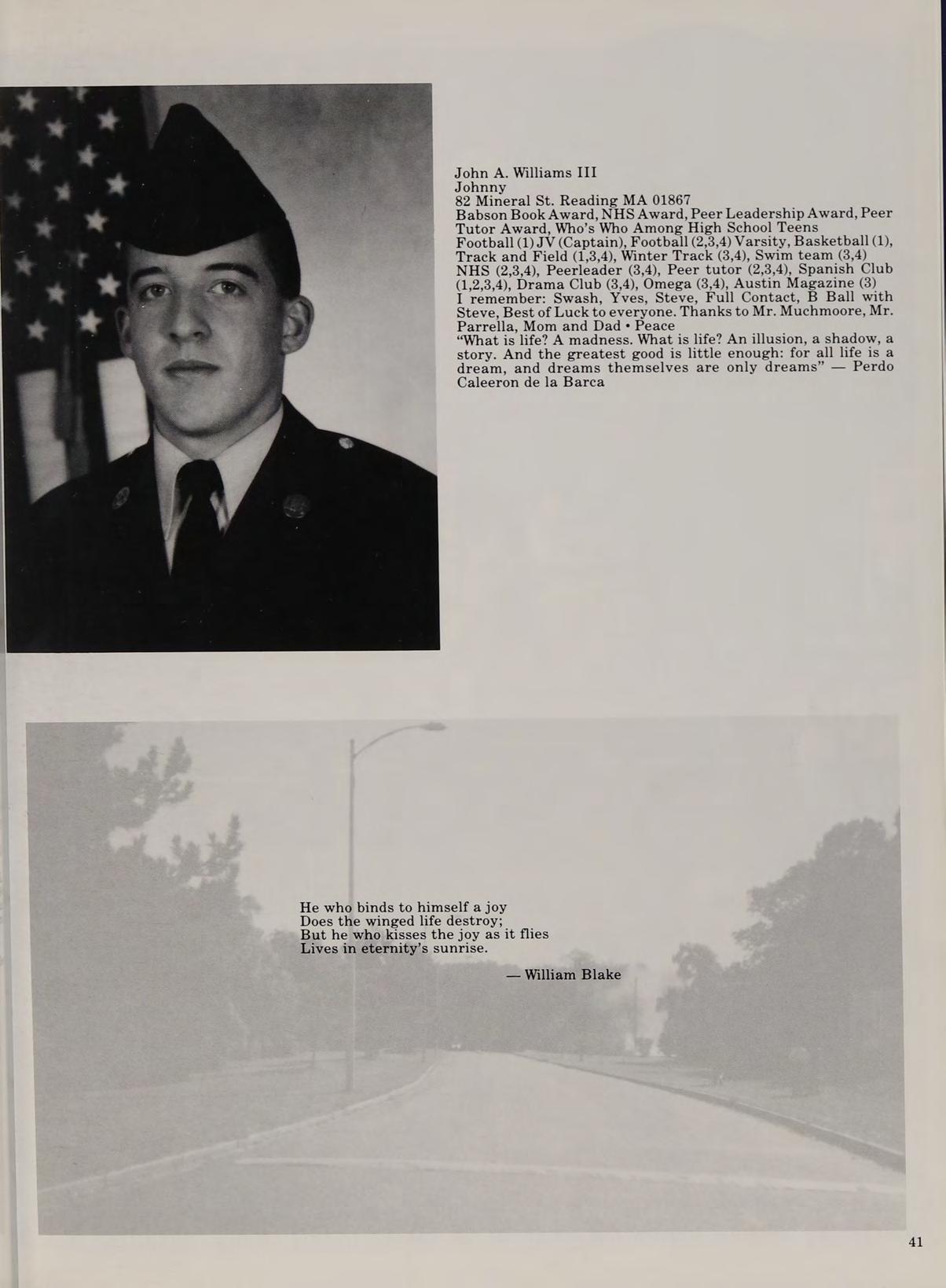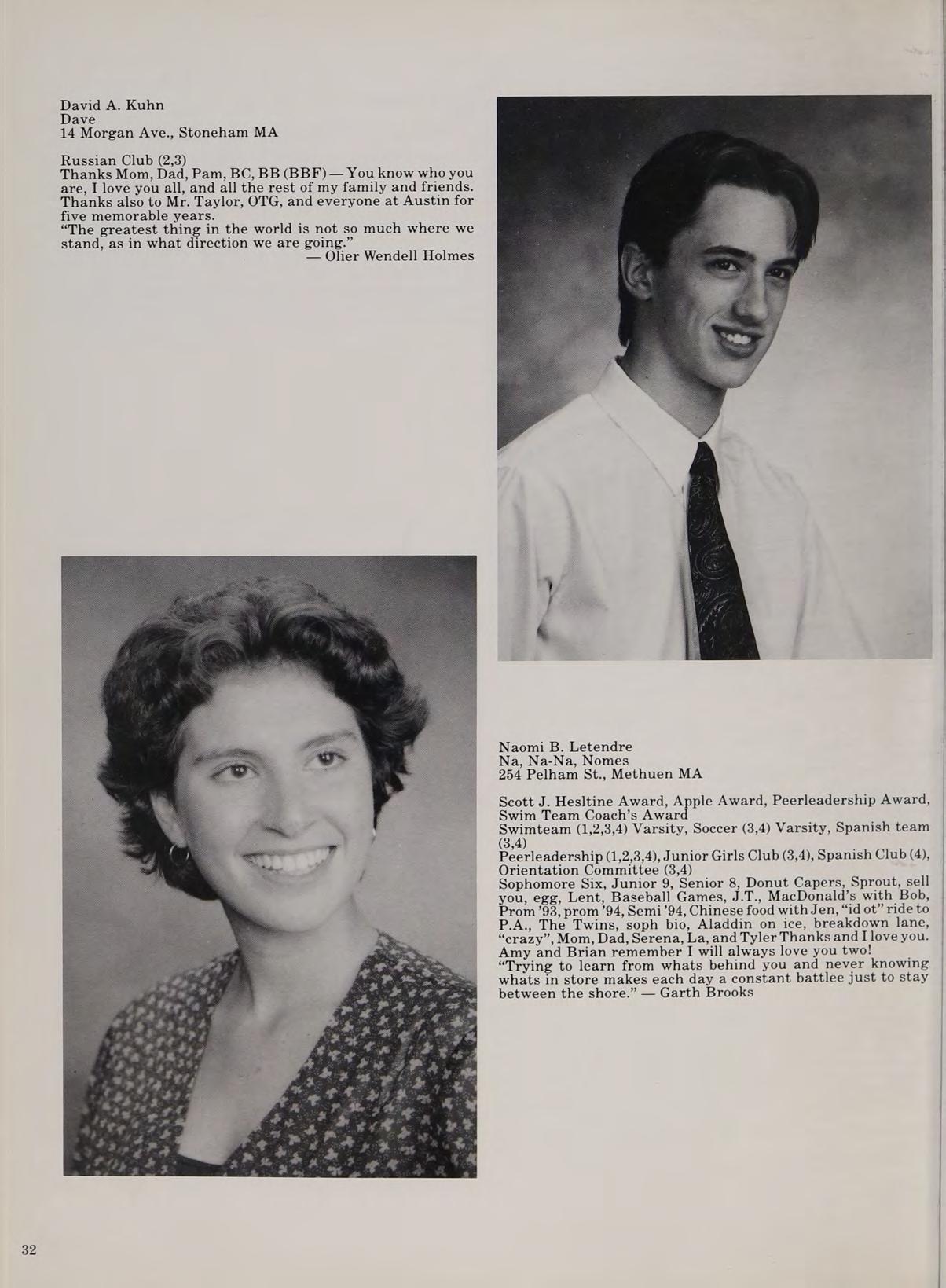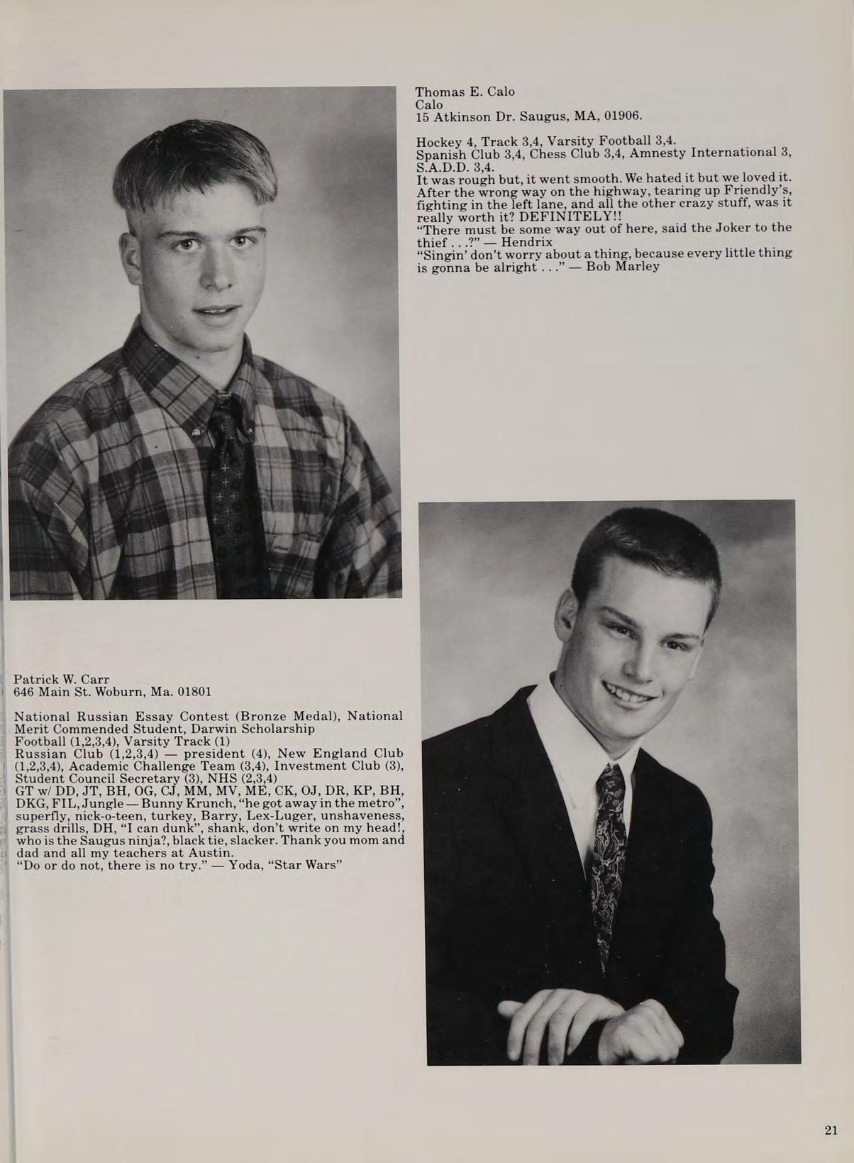 National Russian Essay Contest (Bronze Medal), National Merit Commended Student, Darwin Scholarship Football (1,2,3,4), Varsity Track (1) Russian Club (1,2,3,4) — president (4), New England Club (1,2,3,4), Academic Challenge Team (3,4), Investment Club (8), Student Council Secretary (3), NHS (2,3,4) GT w/ DD, JT, BH, OG, CJ, MM, MV, ME, CK, OJ, DR, KP, BH, DKG, FIL, Jungle — Bunny Krunch, “he got away in the metro”, superfly, nick-o-teen, turkey, Barry, Lex-Luger, unshaveness, grass drills, DH, “I can dunk”, shank, don’t write on my head!, who is the Saugus ninja?, black tie, slacker. Thank you mom and dad and all my teachers at Austin. “Do or do not, there is no try.” — Yoda, “Star Wars”