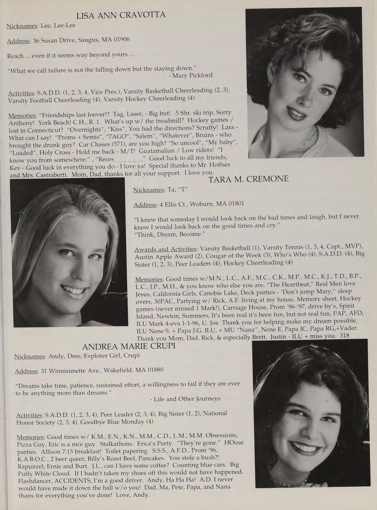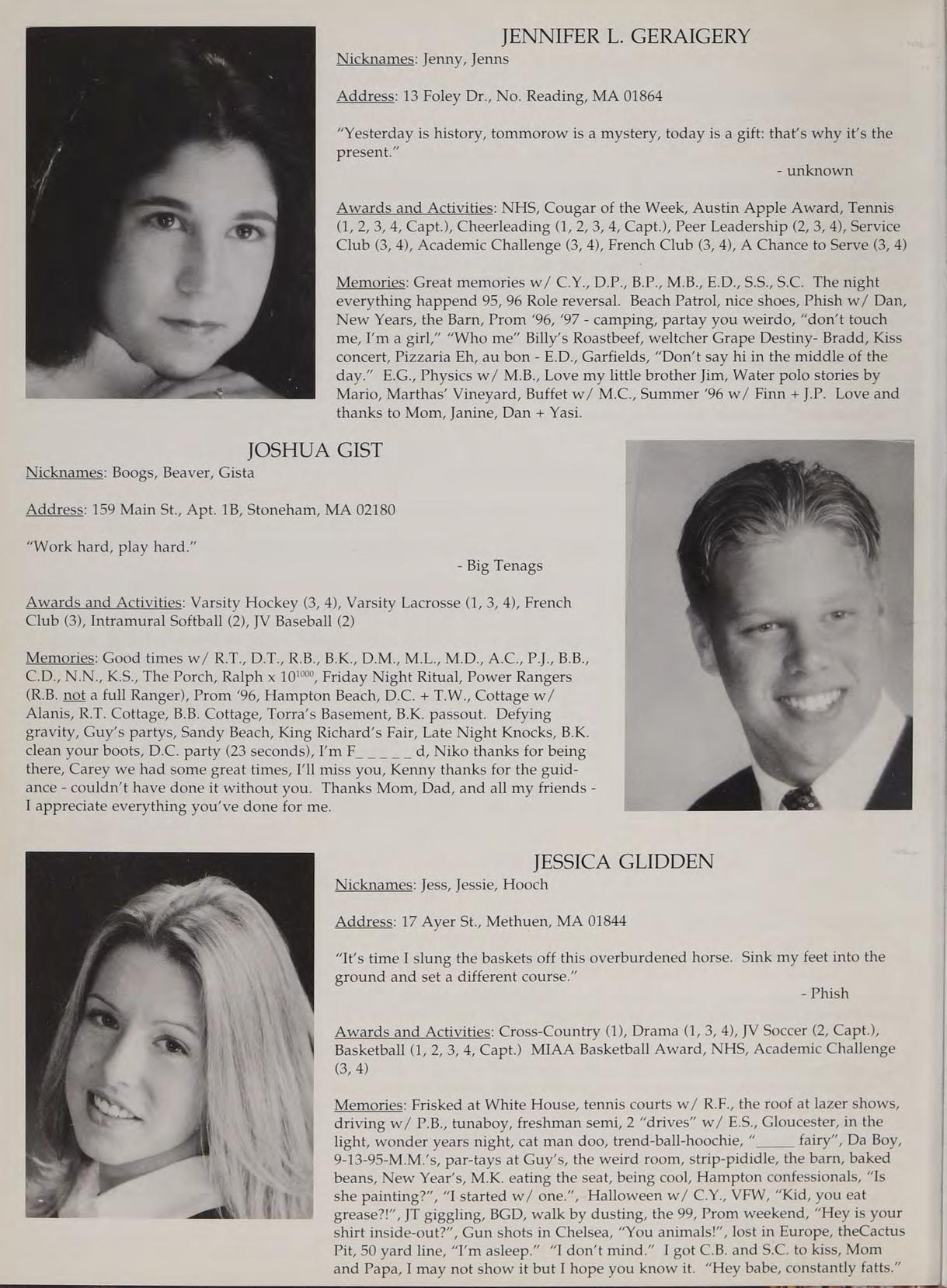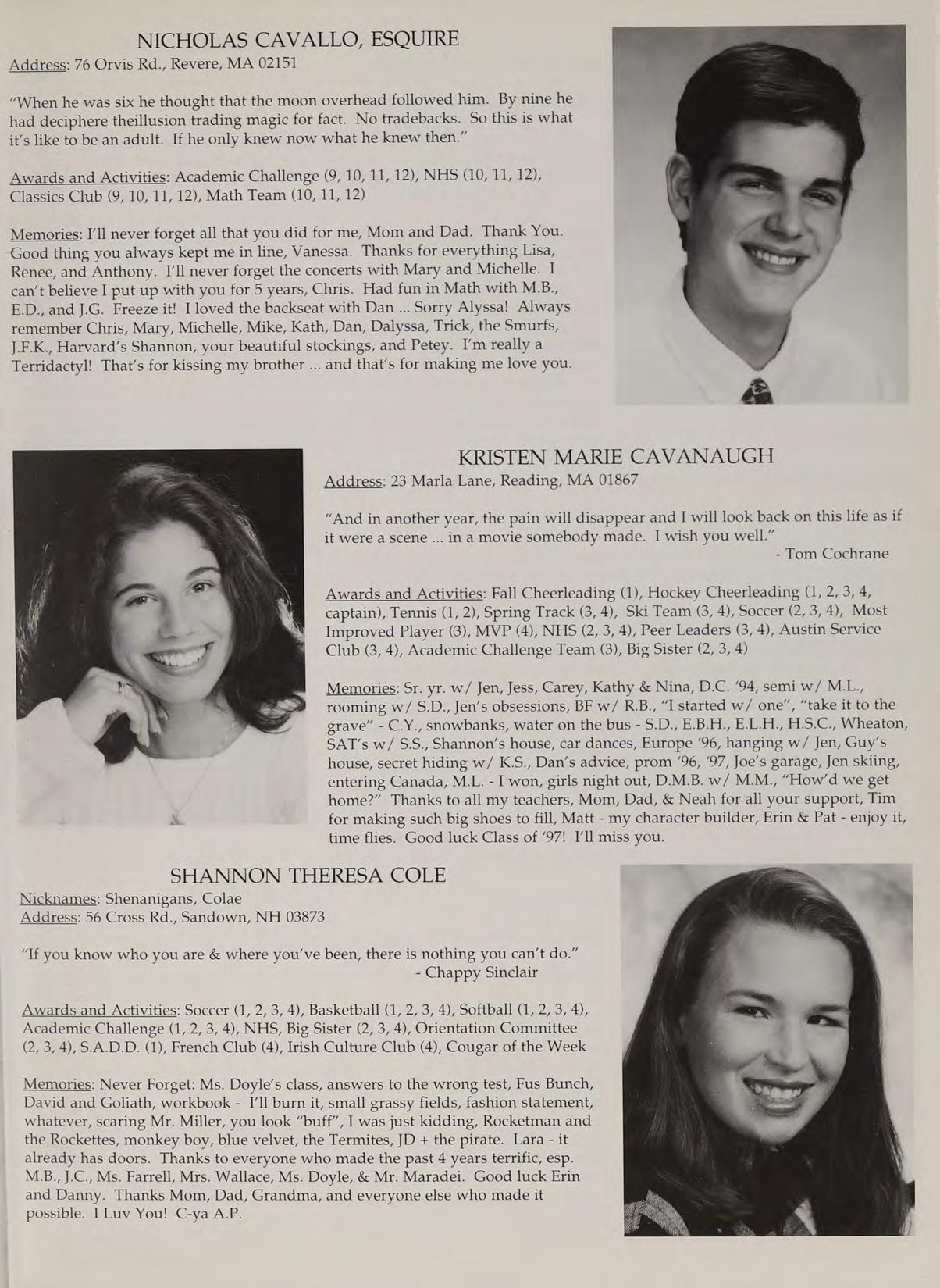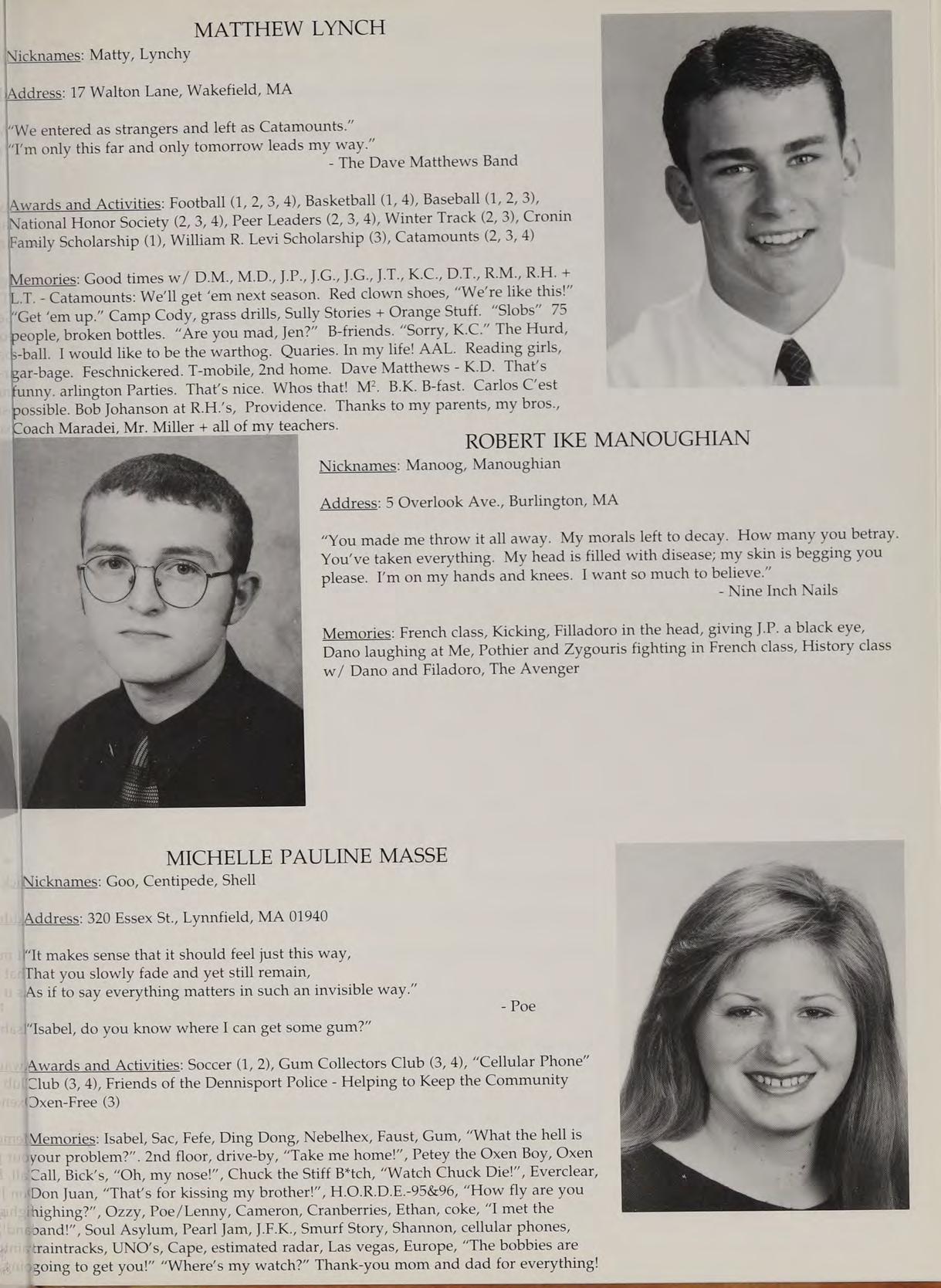 Memories: Good times w/ R.T., J.G., B.B., D.T., A.C. P.A., R.G. F.W., MM., C.B., M.D., D.M., M.L., N.N., K.S., C.D., K.C., J.G., J.T., and all the rest. Best friends w/ Kristen Cavanaugh. Catamounts. Good times w/ Woburn boys: E.S., C.S. and the rest; B- Cruises, Friday night ritual w/ J.G. & R.T.. Sevs cottage, B.B.’s cottage w/ R.T., J.G., D.M., B.B., CH & BB w/Wob boyz. L.L. with D.C., K.D., K.H., T.W. Phat Dog. G.A. house, Pukin in P-lot w/ N.N. Hampton. Prom ‘96, 97. Ice cold Coca-Cola. Power rangers, packin fatty’s. Cabin 13. Mama, I’m comin home. Sullystories. Griff Get the limes. Cirigs House 95. Shutup Wuss! 9-7-96. N.N. we're finally together. Thanx Coach Maradei, Cutlip & Staff. Mom, Dad and 5 wonderful sisters, Thanks & I Love You. S.U.S. N.N.