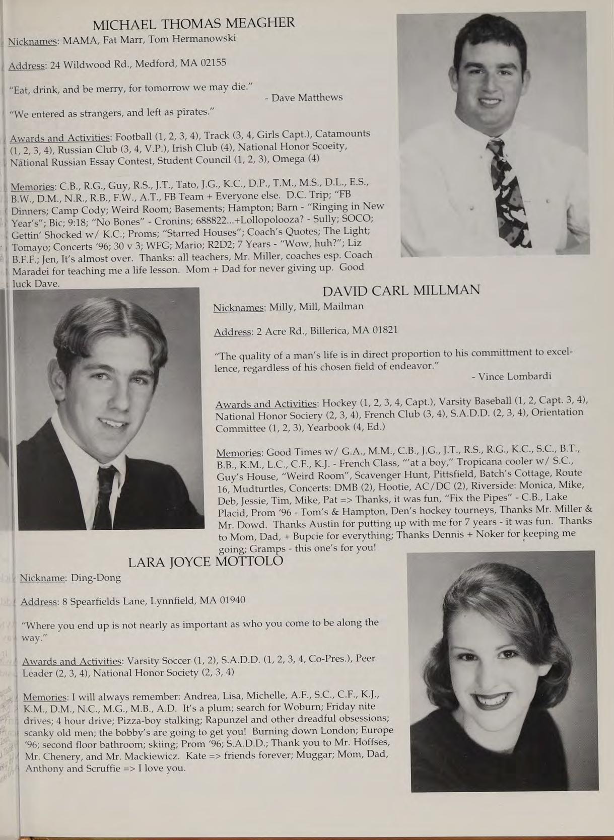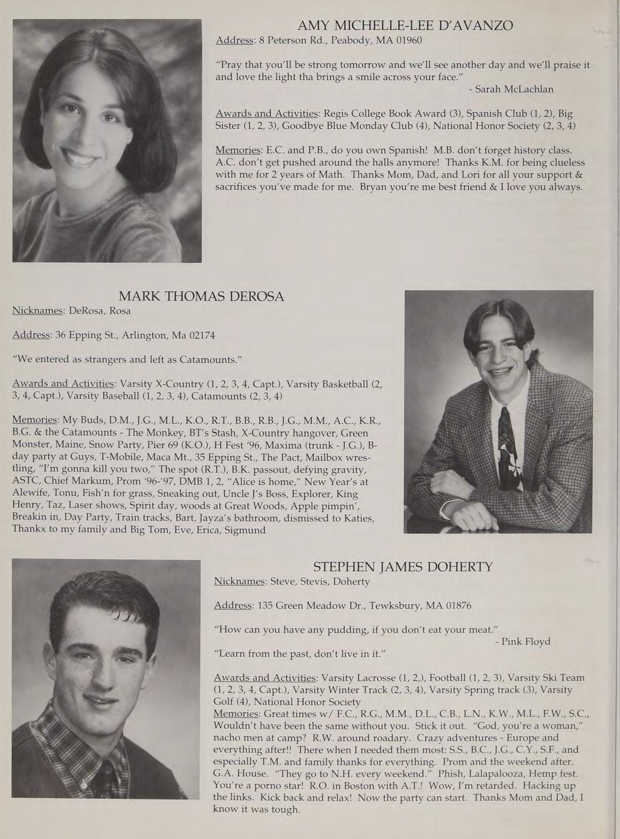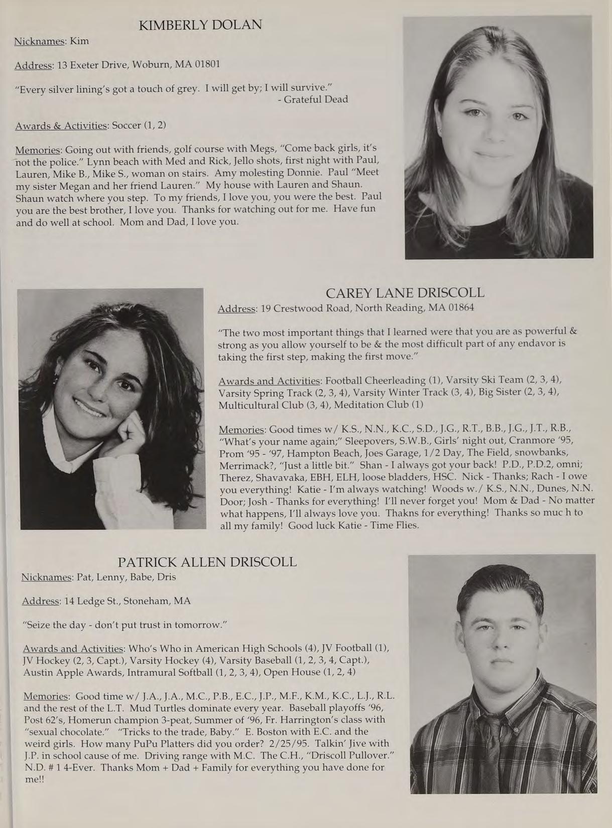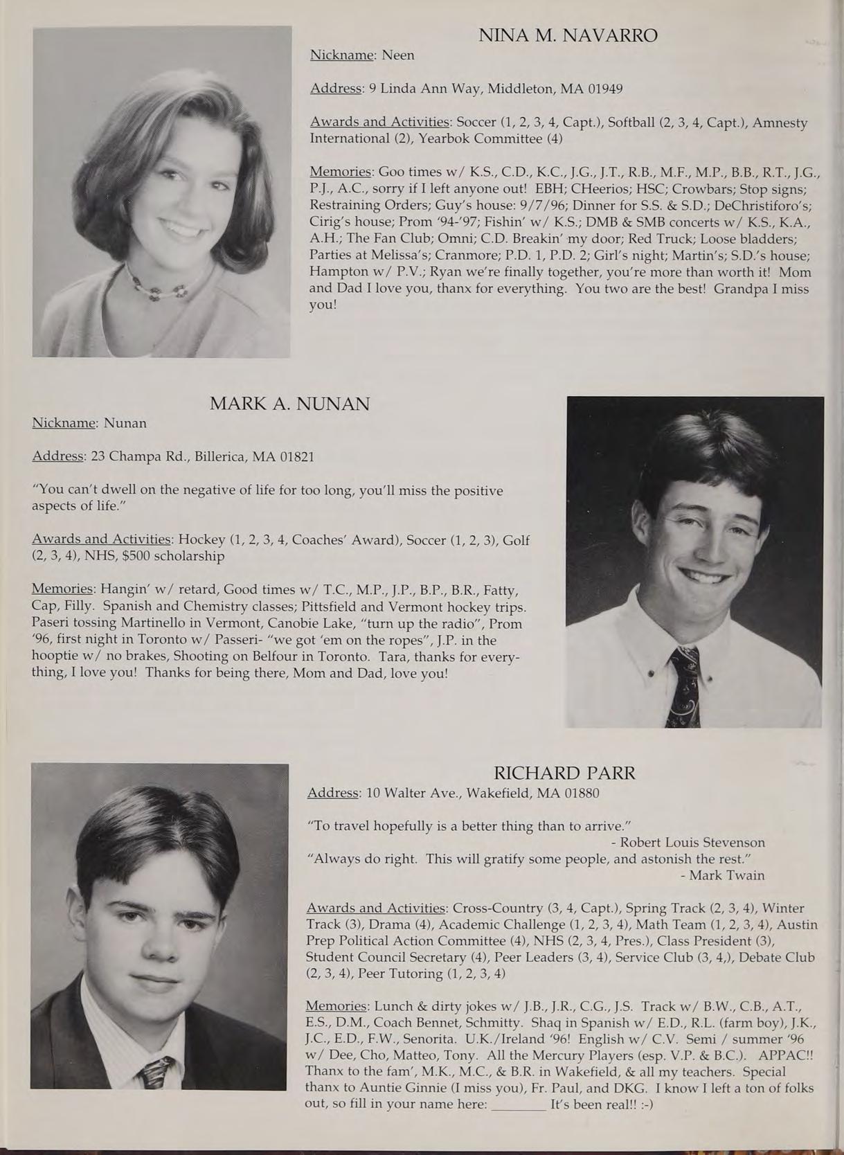 Memories: Good times w/ R.T., J.G., B.B., D.T., A.C. P.A., R.G. F.W., MM., C.B., M.D., D.M., M.L., N.N., K.S., C.D., K.C., J.G., J.T., and all the rest. Best friends w/ Kristen Cavanaugh. Catamounts. Good times w/ Woburn boys: E.S., C.S. and the rest; B- Cruises, Friday night ritual w/ J.G. & R.T.. Sevs cottage, B.B.’s cottage w/ R.T., J.G., D.M., B.B., CH & BB w/Wob boyz. L.L. with D.C., K.D., K.H., T.W. Phat Dog. G.A. house, Pukin in P-lot w/ N.N. Hampton. Prom ‘96, 97. Ice cold Coca-Cola. Power rangers, packin fatty’s. Cabin 13. Mama, I’m comin home. Sullystories. Griff Get the limes. Cirigs House 95. Shutup Wuss! 9-7-96. N.N. we're finally together. Thanx Coach Maradei, Cutlip & Staff. Mom, Dad and 5 wonderful sisters, Thanks & I Love You. S.U.S. N.N.