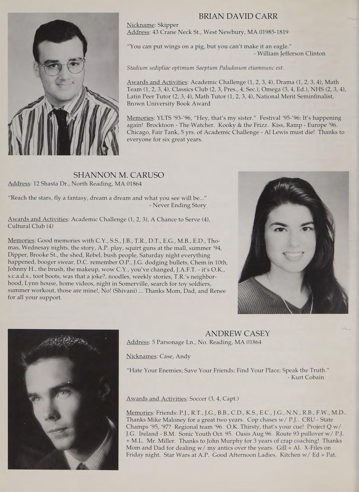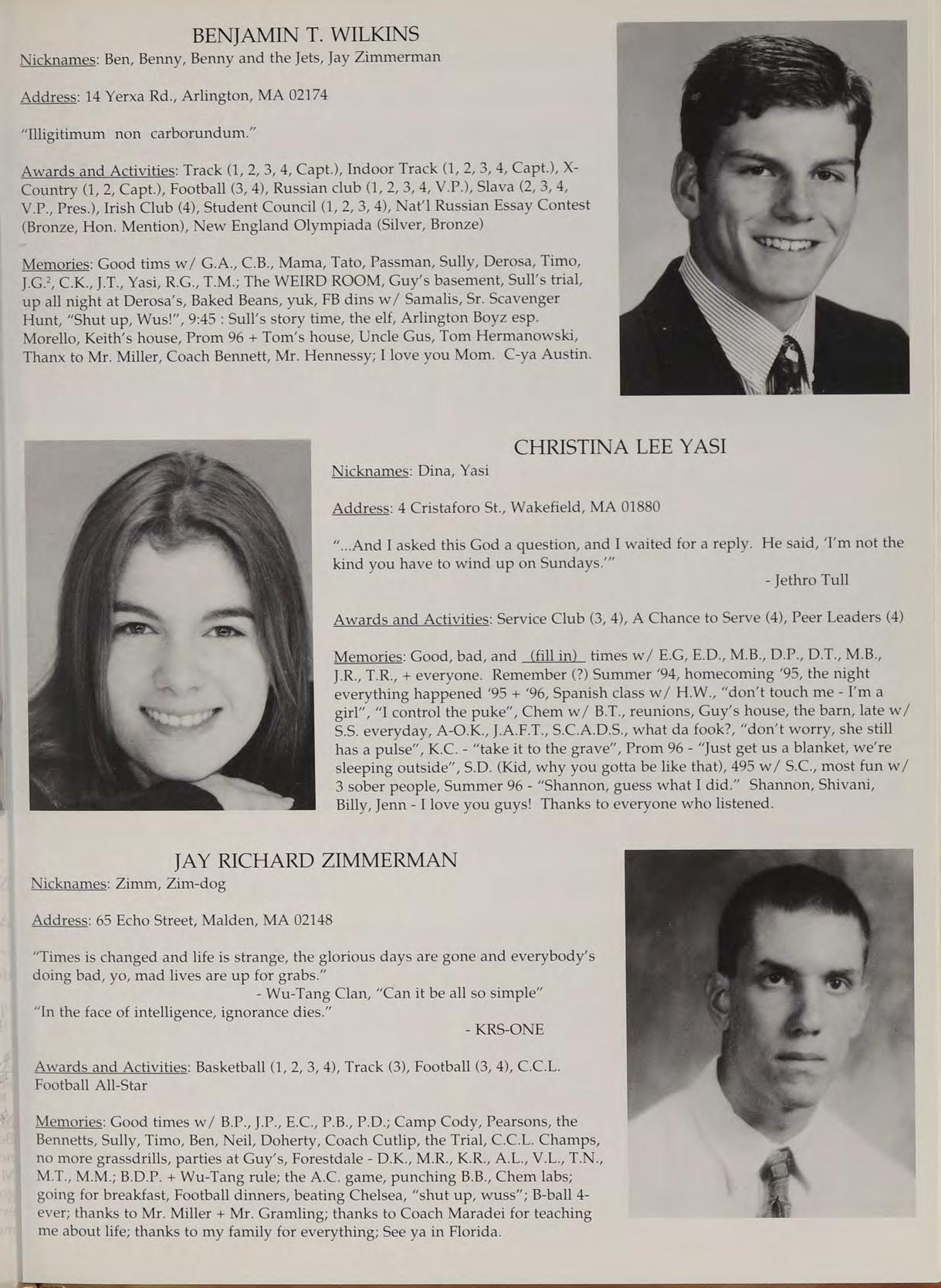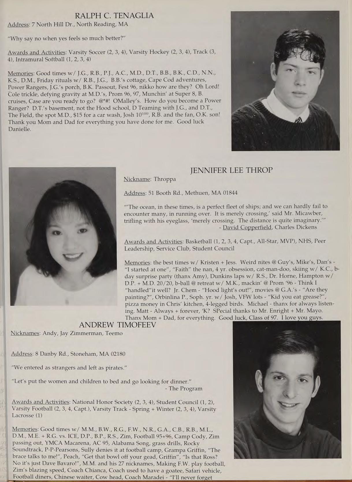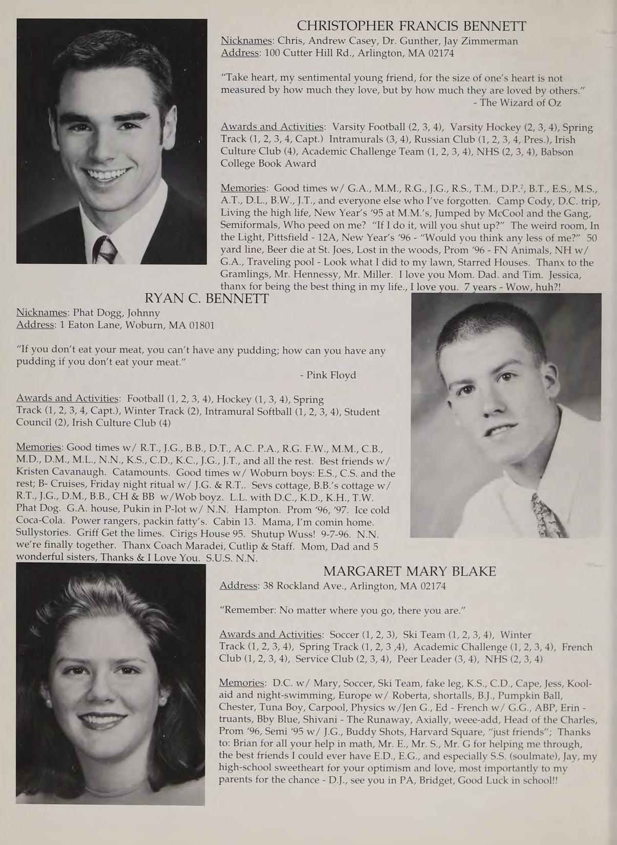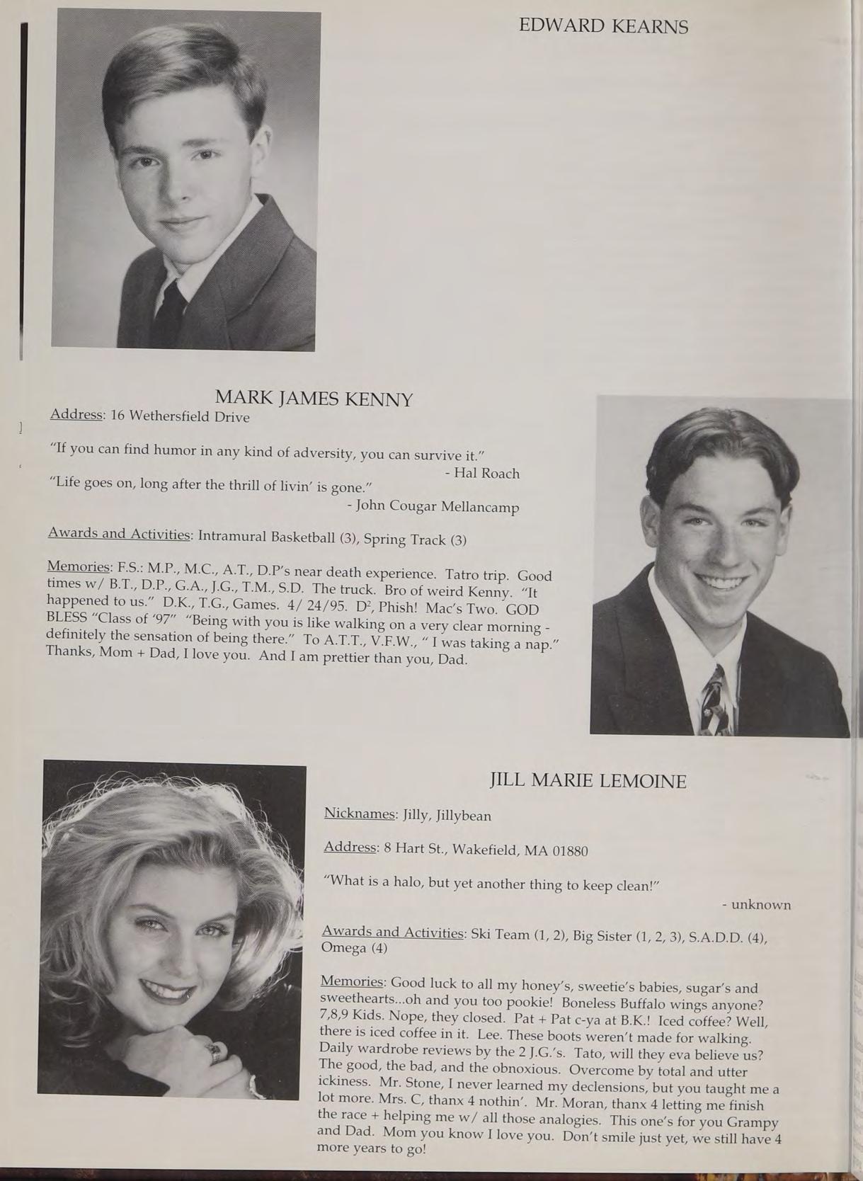Memories: Good times w/ R.T., J.G., B.B., D.T., A.C. P.A., R.G. F.W., MM., C.B., M.D., D.M., M.L., N.N., K.S., C.D., K.C., J.G., J.T., and all the rest. Best friends w/ Kristen Cavanaugh. Catamounts. Good times w/ Woburn boys: E.S., C.S. and the rest; B- Cruises, Friday night ritual w/ J.G. & R.T.. Sevs cottage, B.B.’s cottage w/ R.T., J.G., D.M., B.B., CH & BB w/Wob boyz. L.L. with D.C., K.D., K.H., T.W. Phat Dog. G.A. house, Pukin in P-lot w/ N.N. Hampton. Prom ‘96, 97. Ice cold Coca-Cola. Power rangers, packin fatty’s. Cabin 13. Mama, I’m comin home. Sullystories. Griff Get the limes. Cirigs House 95. Shutup Wuss! 9-7-96. N.N. we're finally together. Thanx Coach Maradei, Cutlip & Staff. Mom, Dad and 5 wonderful sisters, Thanks & I Love You. S.U.S. N.N.