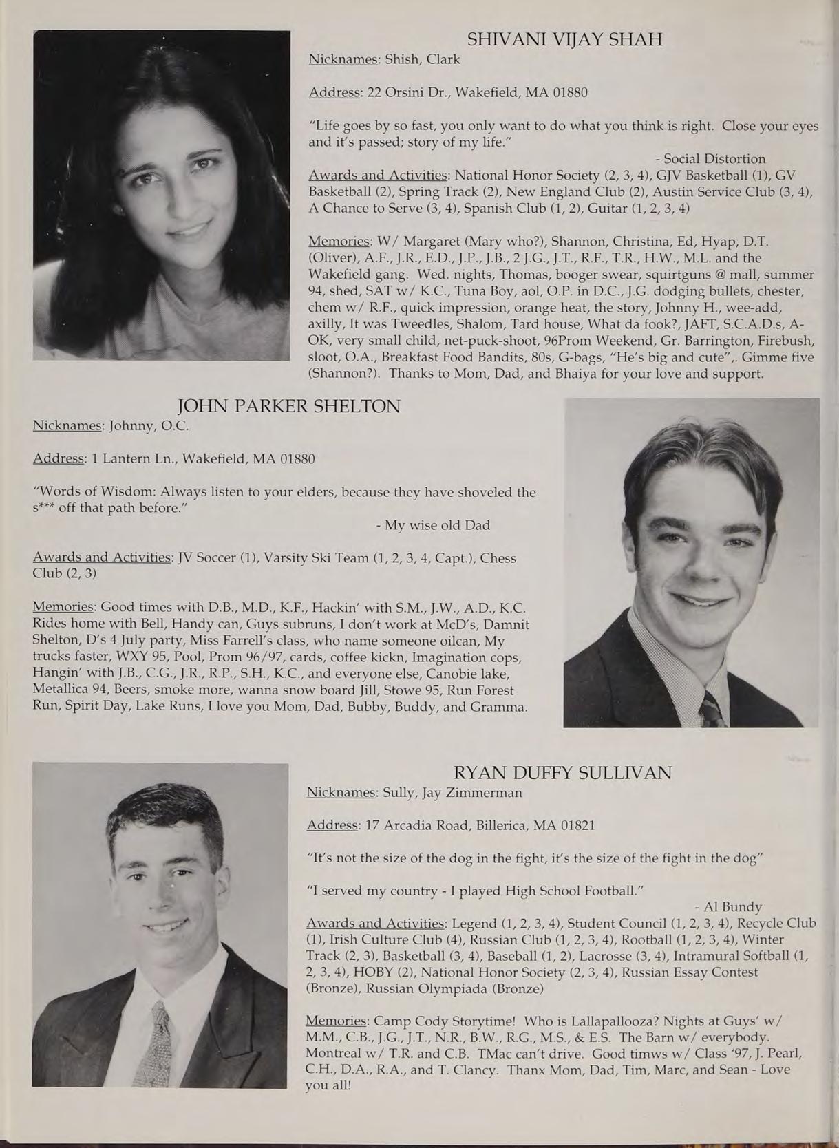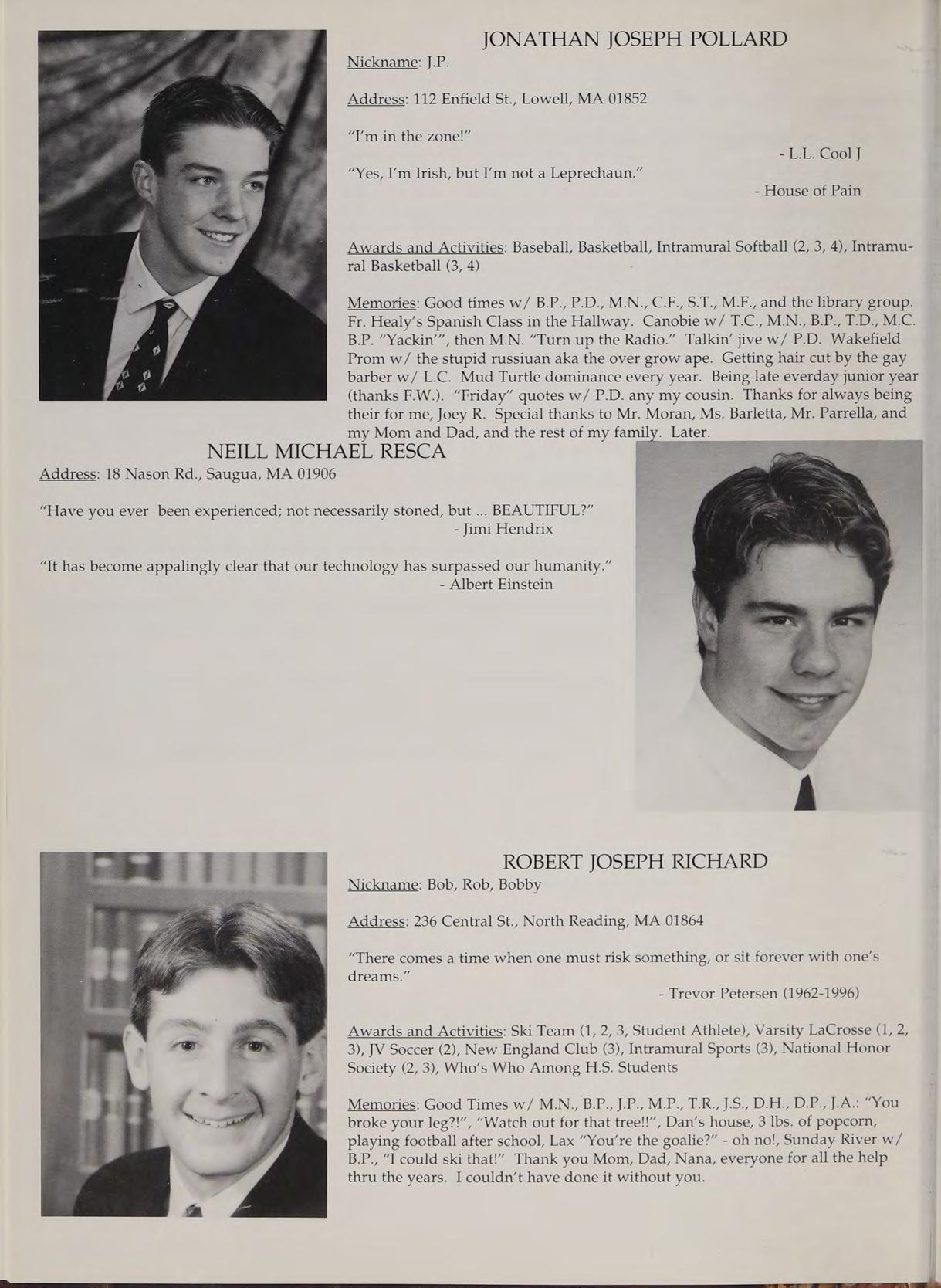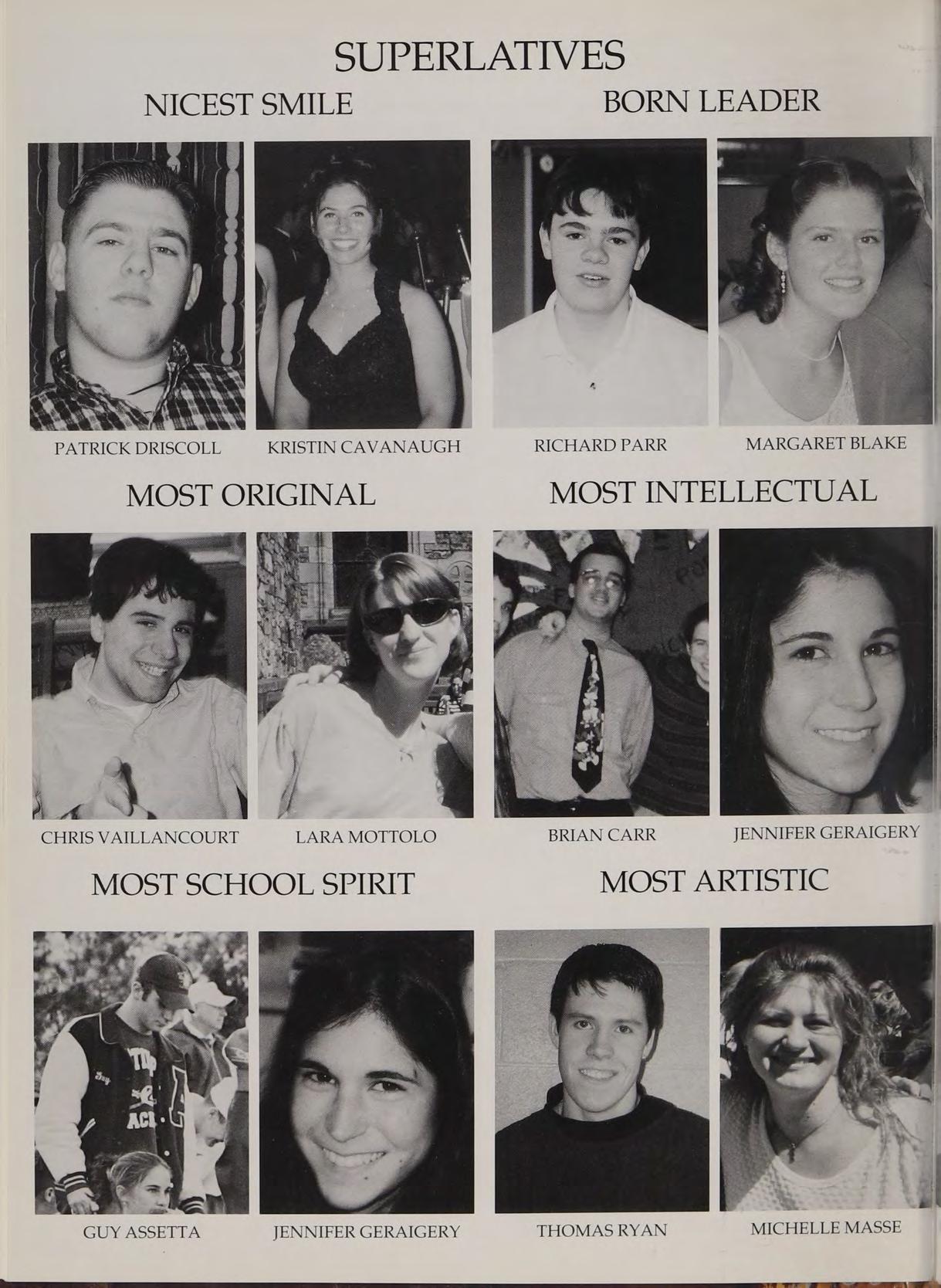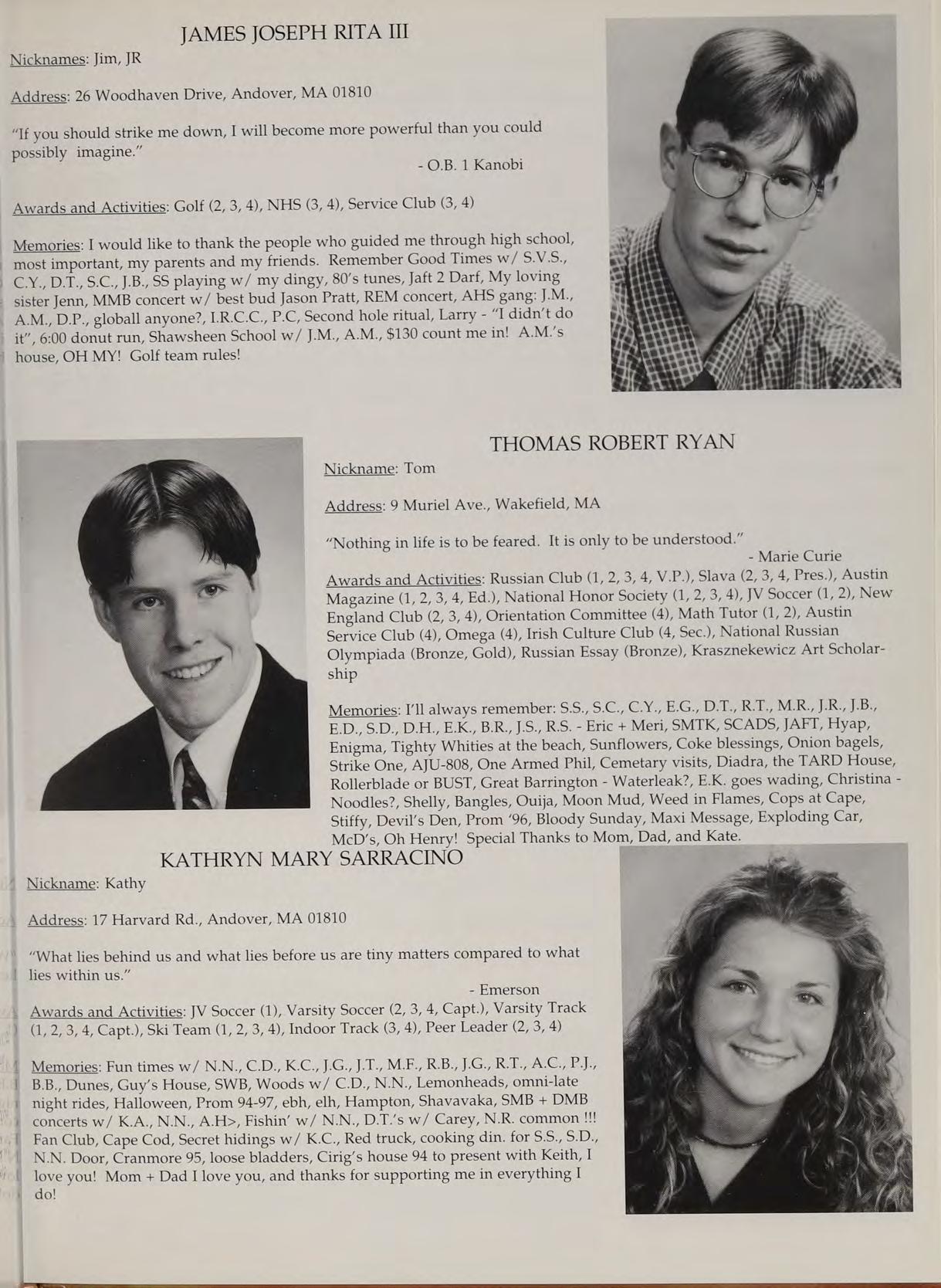 Memories: Good times w/ R.T., J.G., B.B., D.T., A.C. P.A., R.G. F.W., MM., C.B., M.D., D.M., M.L., N.N., K.S., C.D., K.C., J.G., J.T., and all the rest. Best friends w/ Kristen Cavanaugh. Catamounts. Good times w/ Woburn boys: E.S., C.S. and the rest; B- Cruises, Friday night ritual w/ J.G. & R.T.. Sevs cottage, B.B.’s cottage w/ R.T., J.G., D.M., B.B., CH & BB w/Wob boyz. L.L. with D.C., K.D., K.H., T.W. Phat Dog. G.A. house, Pukin in P-lot w/ N.N. Hampton. Prom ‘96, 97. Ice cold Coca-Cola. Power rangers, packin fatty’s. Cabin 13. Mama, I’m comin home. Sullystories. Griff Get the limes. Cirigs House 95. Shutup Wuss! 9-7-96. N.N. we're finally together. Thanx Coach Maradei, Cutlip & Staff. Mom, Dad and 5 wonderful sisters, Thanks & I Love You. S.U.S. N.N.