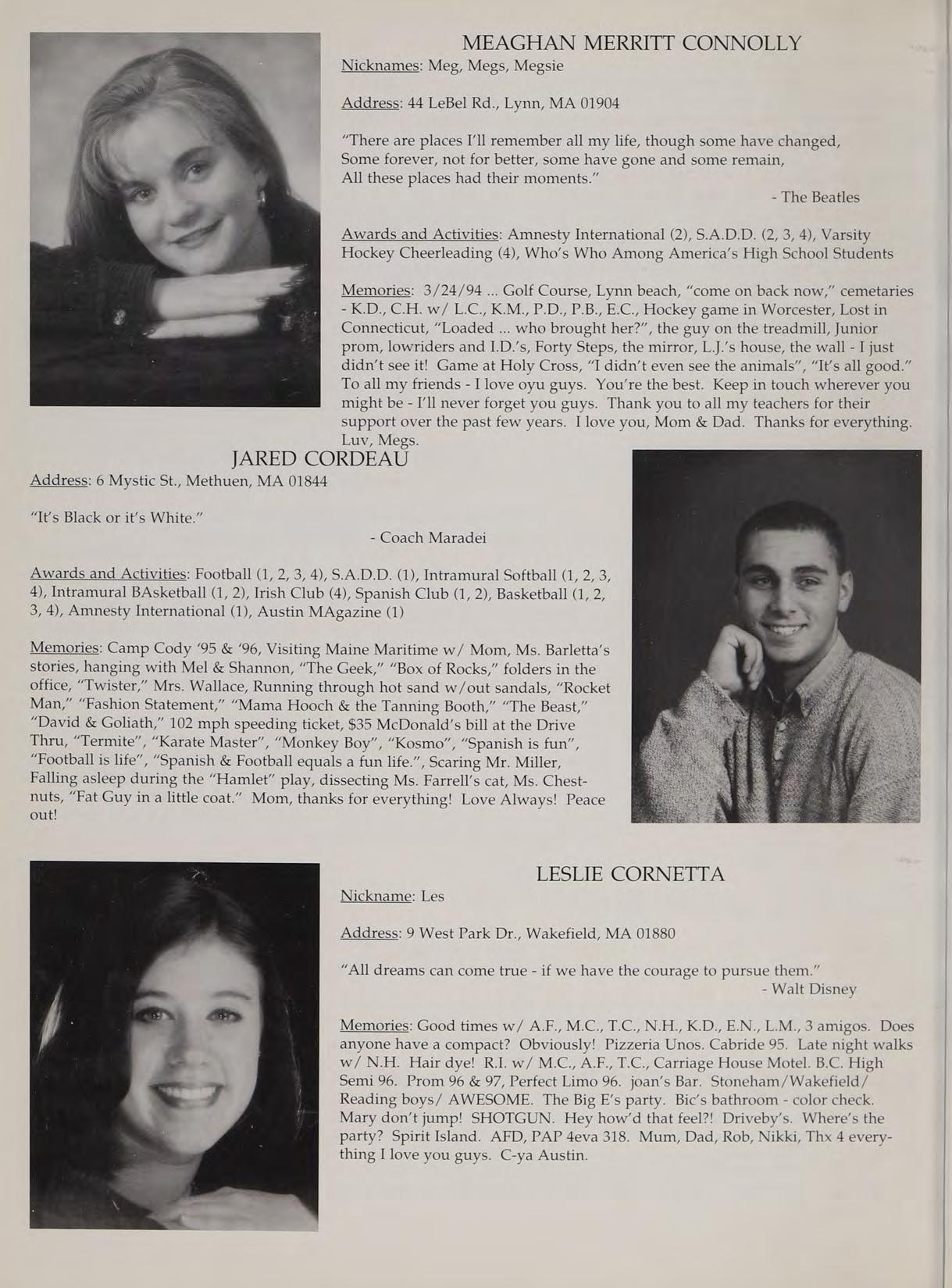 Memories: 3/24/94 ... Golf Course, Lynn beach, “come on back now,” cemetaries -K.D., C.H. w/ L.C., K.M., P.D., P.B., E.C., Hockey game in Worcester, Lost in Connecticut, “Loaded ... who brought her?”, the guy on the treadmill, Junior prom, lowriders and I.D.’s, Forty Steps, the mirror, L.J.’s house, the wall - I just didn’t see it! Game at Holy Cross, “I didn’t even see the animals”, “It’s all good.” To all my friends - I love oyu guys. You're the best. Keep in touch wherever you might be - I’ll never forget you guys. Thank you to all my teachers for their support over the past few years. I love you, Mom & Dad. Thanks for everything. Luv, Megs.