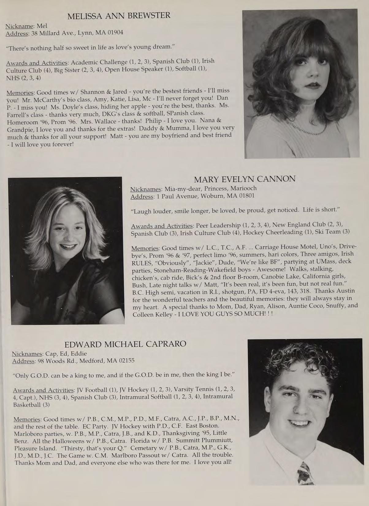 Memories: Good times w/ Shannon & Jared - you're the bestest friends - I'll miss you! Mr. McCarthy’s bio class, Amy, Katie, Lisa, Mc - I’ll never forget you! Dan P. -I miss you! Ms. Doyle’s class, hiding her apple - you're the best, thanks. Ms. Farrell’s class - thanks very much, DKG’s class & softball, SPanish class. Homeroom ‘96, Prom ‘96. Mrs. Wallace - thanks! Philip - love you. Nana & Grandpie, I love you and thanks for the extras! Daddy & Mumma, I love you very much & thanks for all your support! Matt - you are my boyfriend and best friend - | will love you forever!