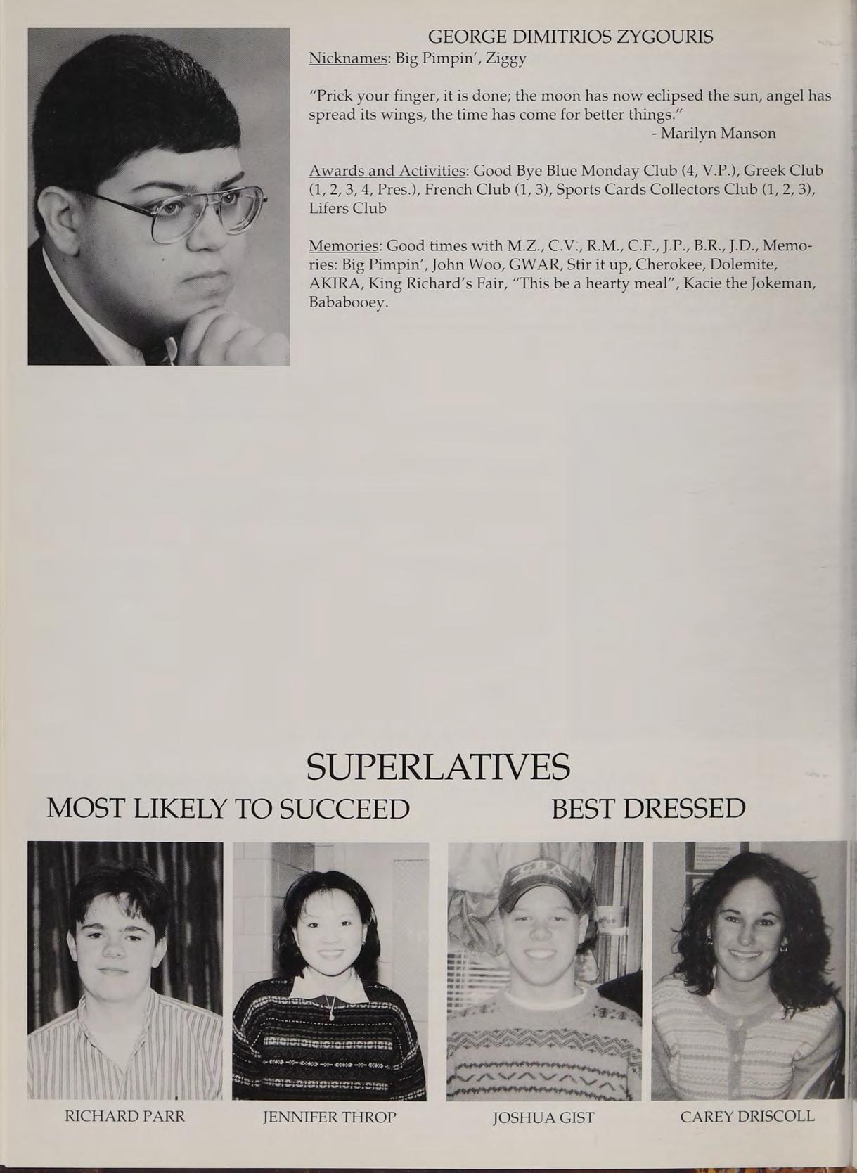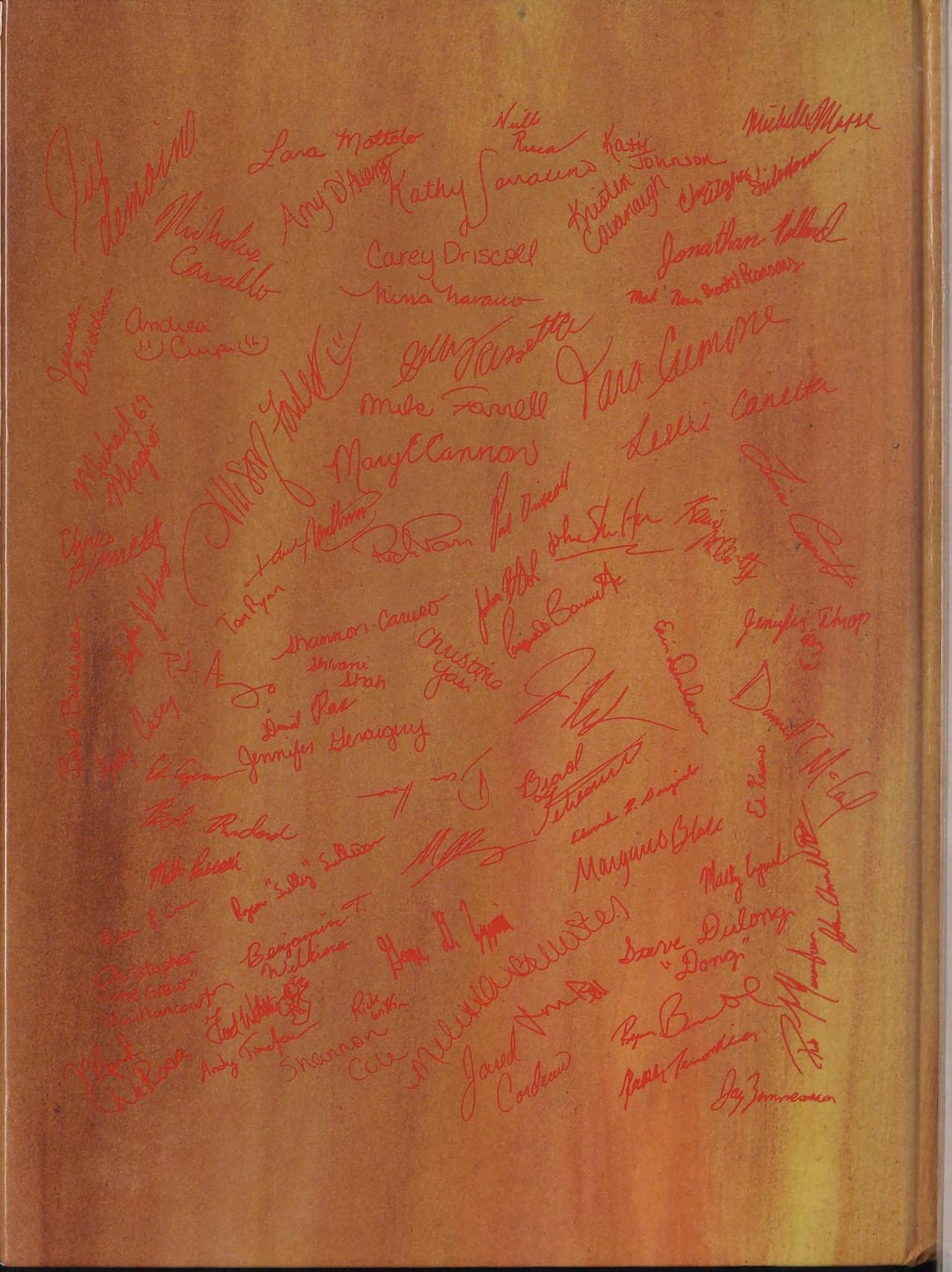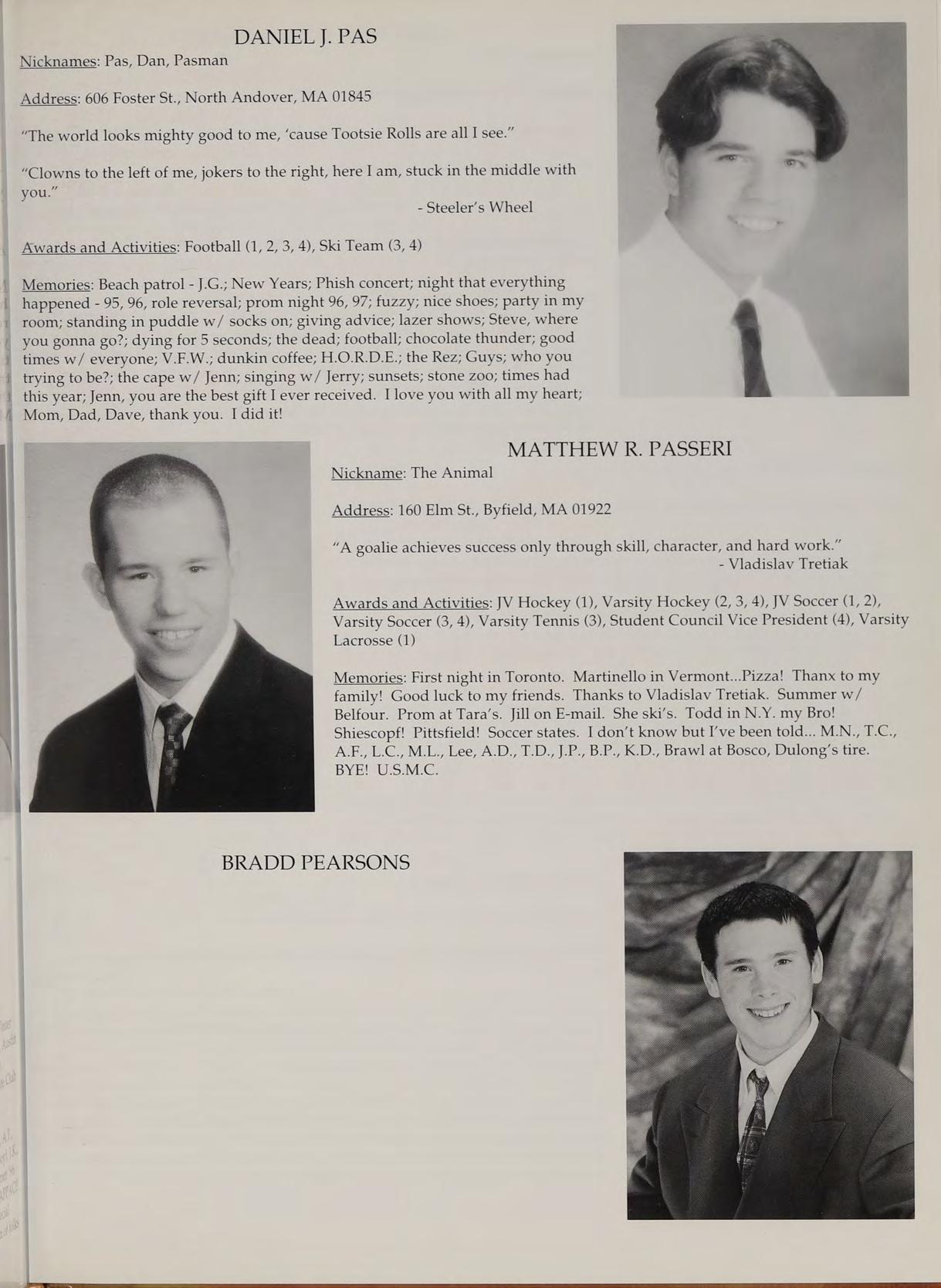 Memories: Good times w/ G.A., M.M., R.G., J.G., R.S., T.M., D.P.2, B.T., E.S., M.S., A.T., D.L., B.W., J.T., and everyone else who I’ve forgotten. Camp Cody, D.C. trip, Living the high life, New Year’s ‘95 at M.M.’s, Jumped by McCool and the Gang, Semiformals, Who peed on me? “If I do it, will you shut up?” The weird room, In the Light, Pittsfield - 12A, New Year's ‘96 - “Would you think any less of me?” 50 yard line, Beer die at St. Joes, Lost in the woods, Prom ‘96 - FN Animals, NH w/ G.A., Traveling pool - Look what I did to my lawn, Starred Houses. Thanx to the Gramlings, Mr. Hennessy, Mr. Miller. I love you Mom. Dad. and Tim. Jessica, thanx for being the best thing in my life., [love you. 7 years - Wow, huh?!
