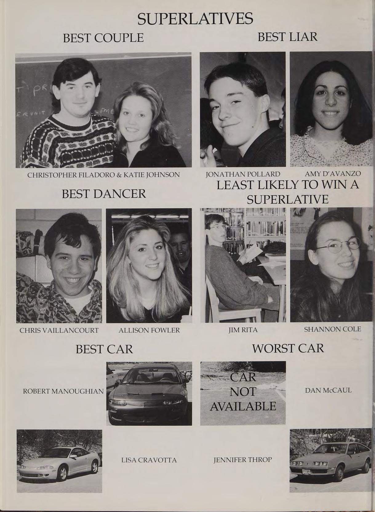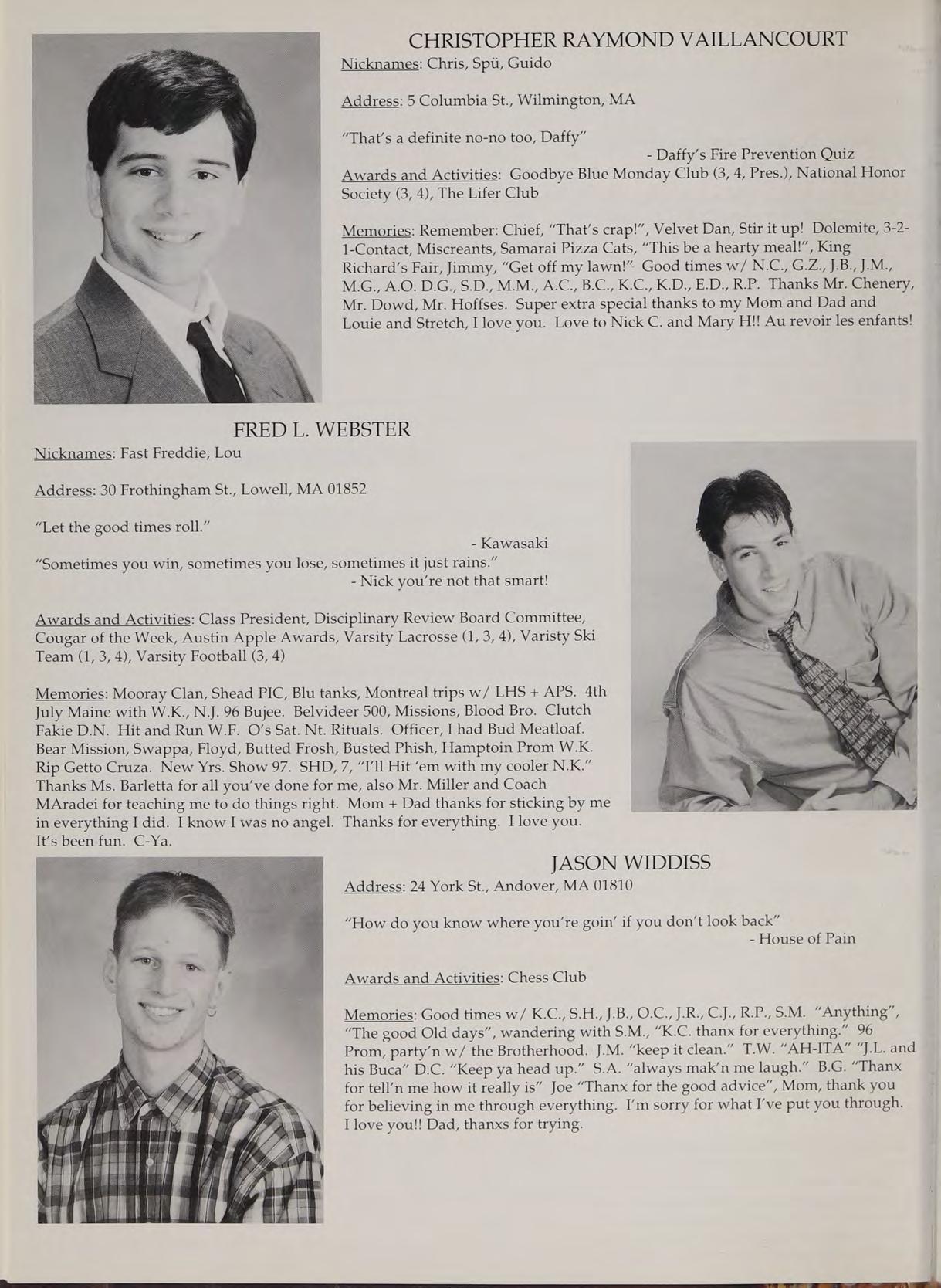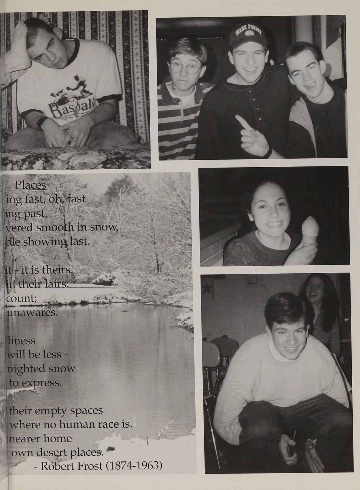 Memories: Good times w/ G.A., M.M., R.G., J.G., R.S., T.M., D.P.2, B.T., E.S., M.S., A.T., D.L., B.W., J.T., and everyone else who I’ve forgotten. Camp Cody, D.C. trip, Living the high life, New Year’s ‘95 at M.M.’s, Jumped by McCool and the Gang, Semiformals, Who peed on me? “If I do it, will you shut up?” The weird room, In the Light, Pittsfield - 12A, New Year's ‘96 - “Would you think any less of me?” 50 yard line, Beer die at St. Joes, Lost in the woods, Prom ‘96 - FN Animals, NH w/ G.A., Traveling pool - Look what I did to my lawn, Starred Houses. Thanx to the Gramlings, Mr. Hennessy, Mr. Miller. I love you Mom. Dad. and Tim. Jessica, thanx for being the best thing in my life., [love you. 7 years - Wow, huh?!