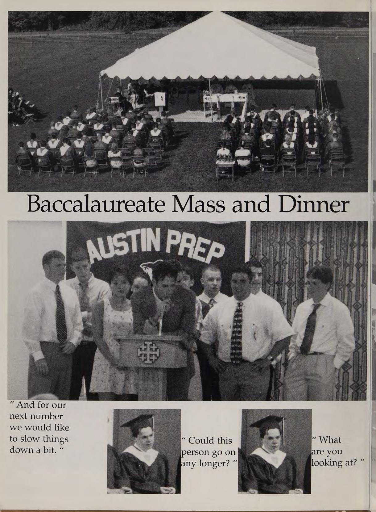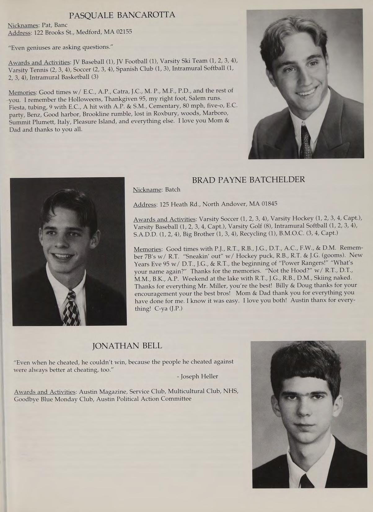 Memories: Good times with P.J., R.T., R.B., J.G., D.T., A.C., F.W., & D.M. Remember 7B’s w/ R.T. “Sneakin’ out” w/ Hockey puck, R.B., R.T. & J.G. (gooms). New Years Eve 95 w/ D.T., J.G., & R.T., the beginning of “Power Rangers!” “What's your name again?” Thanks for the memories. “Not the Hood?” w/ R.T., D.T., M.M., B.K., A.P. Weekend at the lake with R.T., J.G., R.B., D.M., Skiing naked. Thanks for everything Mr. Miller, you're the best! Billy & Doug thanks for your encouragement your the best bros! Mom & Dad thank you for everything you have done for me. I know it was easy. I love you both! Austin thanx for everything! C-ya (J.P.)