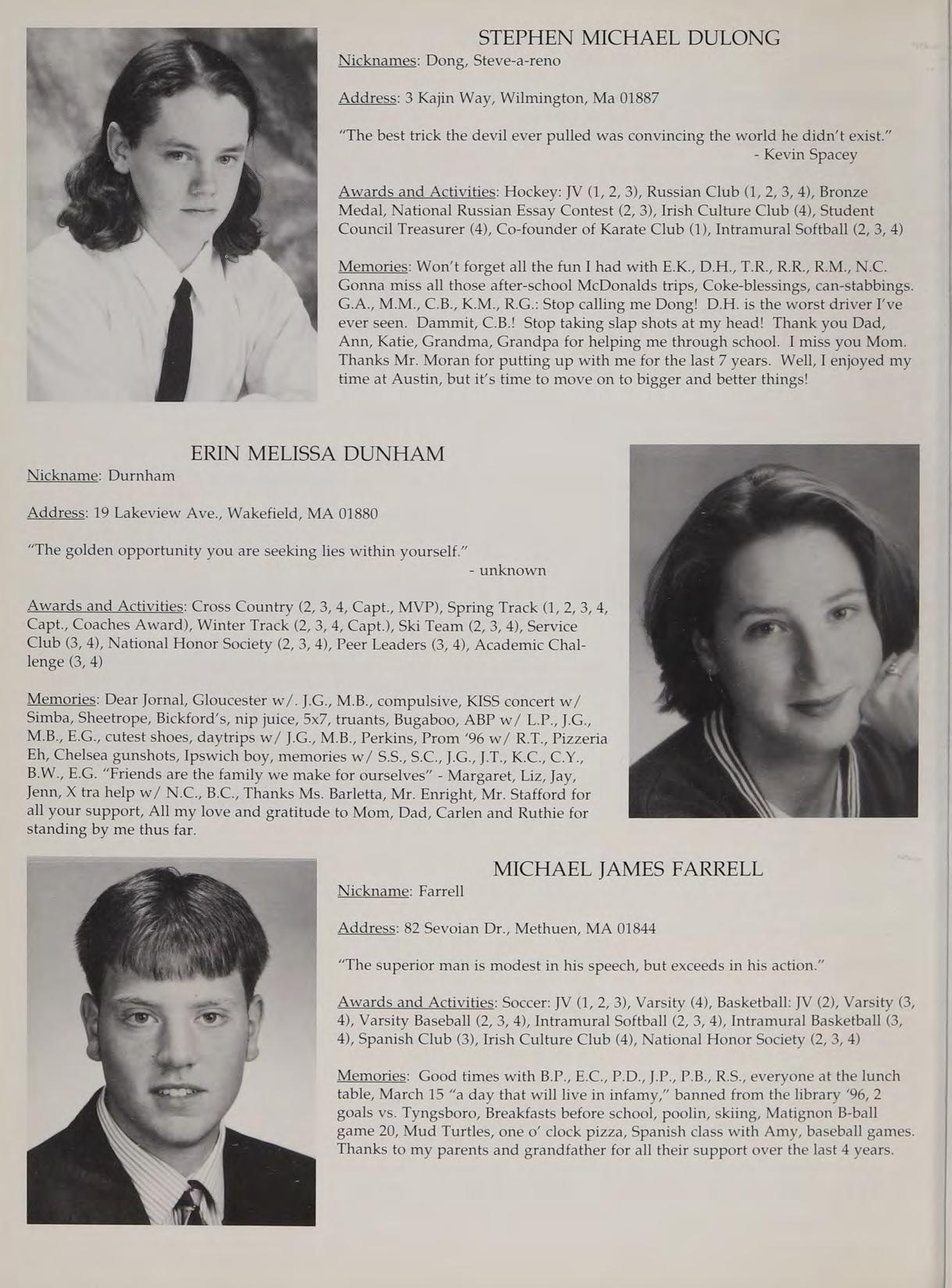 Memories: D.C. w/ Mary, Soccer, Ski Team, fake leg, K.S., C.D., Cape, Jess, Koolaid and night-swimming, Europe w/ Roberta, shortalls, B.J., Pumpkin Ball, Chester, Tuna Boy, Carpool, Physics w/Jen G., Ed - French w/ G.G., ABP, Erintruants, Bby Blue, Shivani - The Runaway, Axially, weee-add, Head of the Charles, Prom ‘96, Semi ‘95 w/ J.G., Buddy Shots, Harvard Square, “just friends”; Thanks to: Brian for all your help in math, Mr. E., Mr. S., Mr. G for helping me through, the best friends I could ever have E.D., E.G., and especially S.S. (soulmate), Jay, my high-school sweetheart for your optimism and love, most importantly to my parents for the chance - DJ., see you in PA, Bridget, Good Luck in school!!