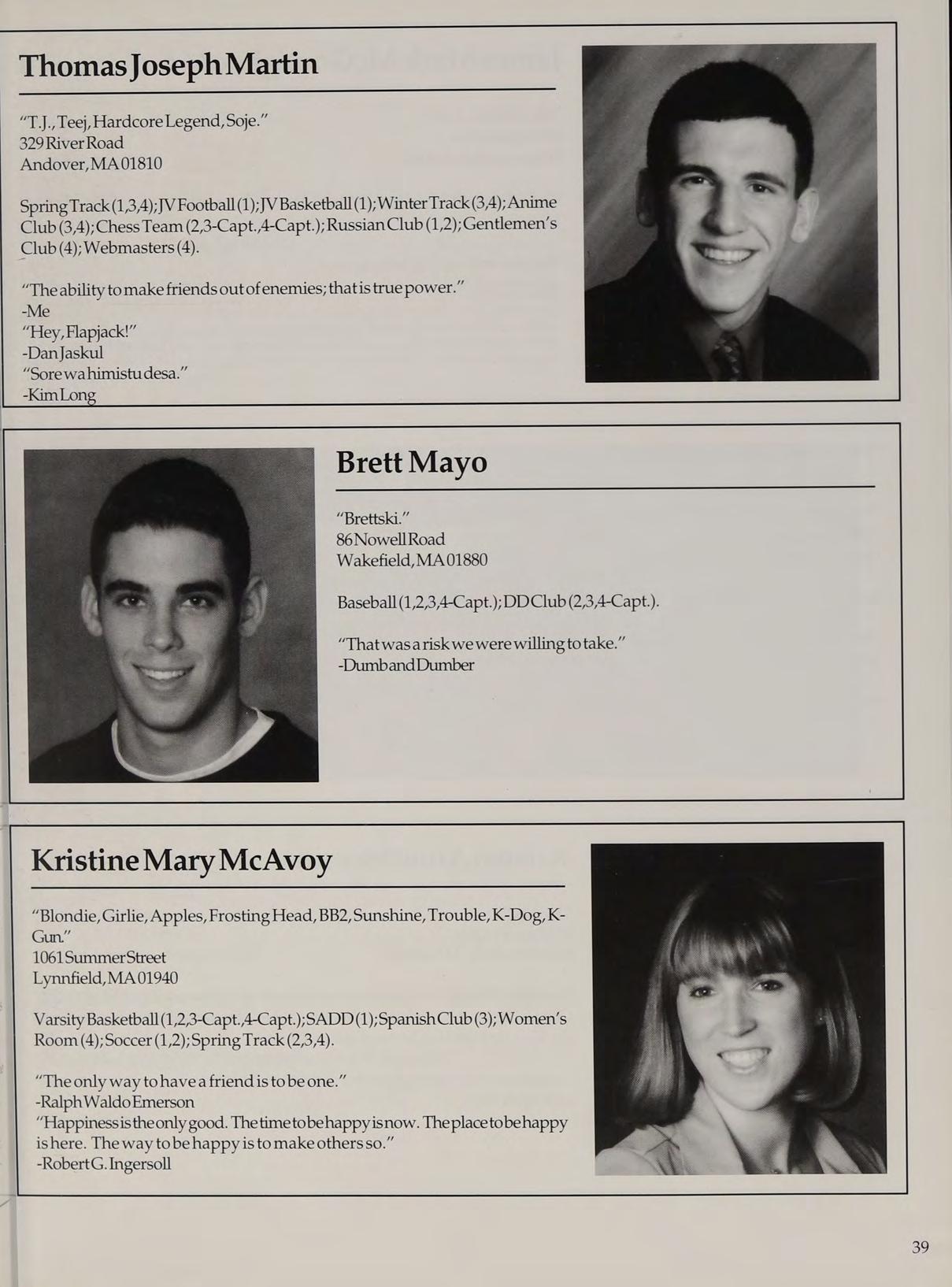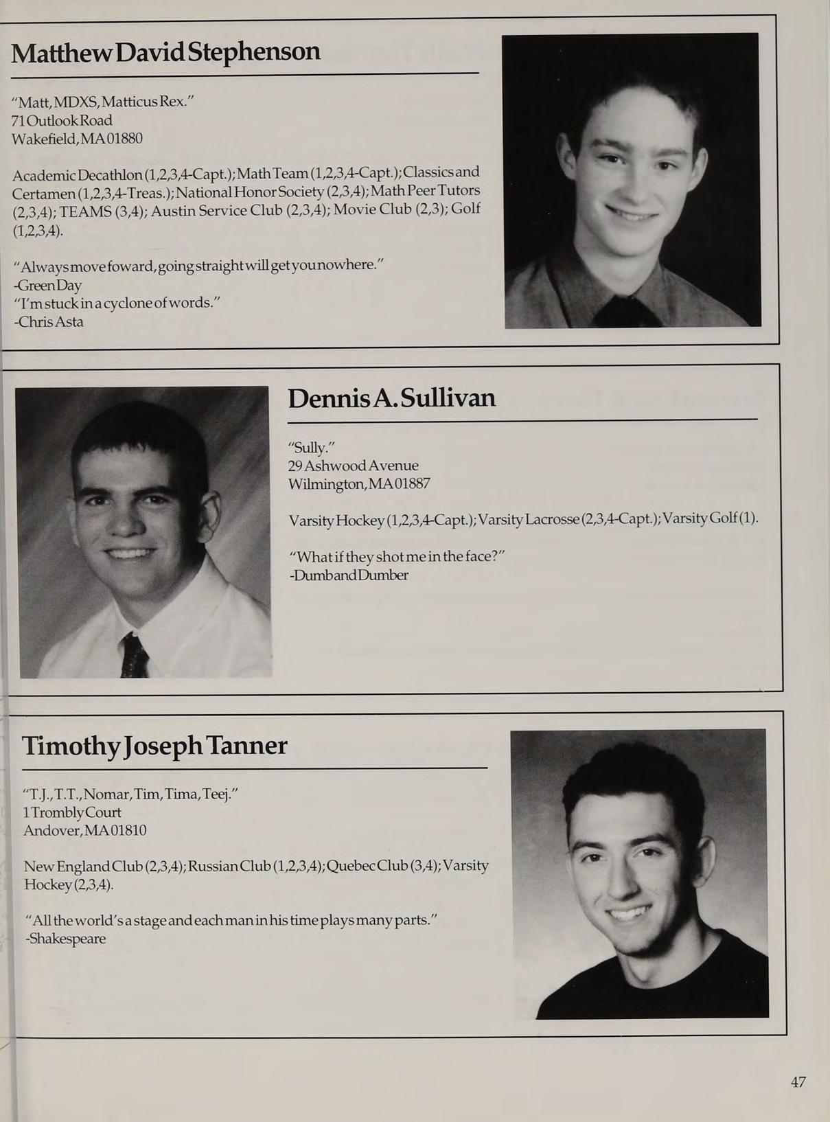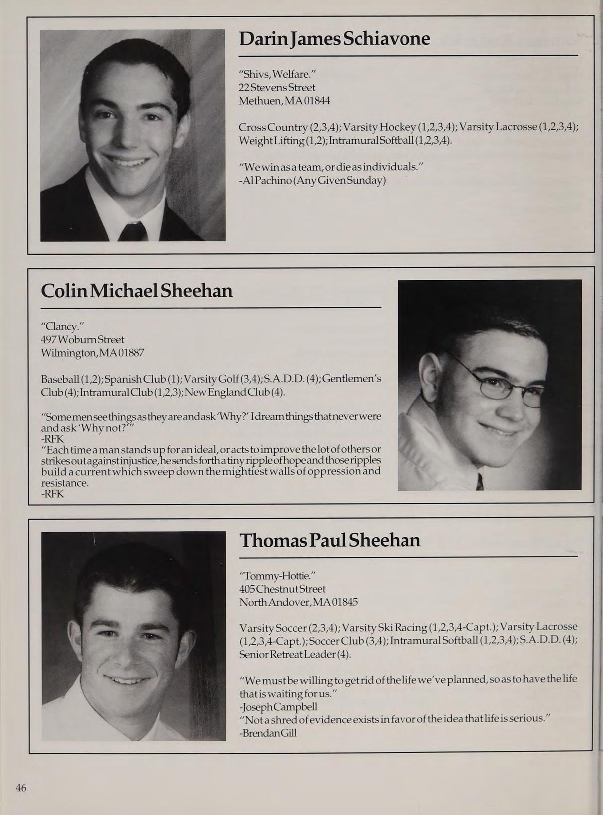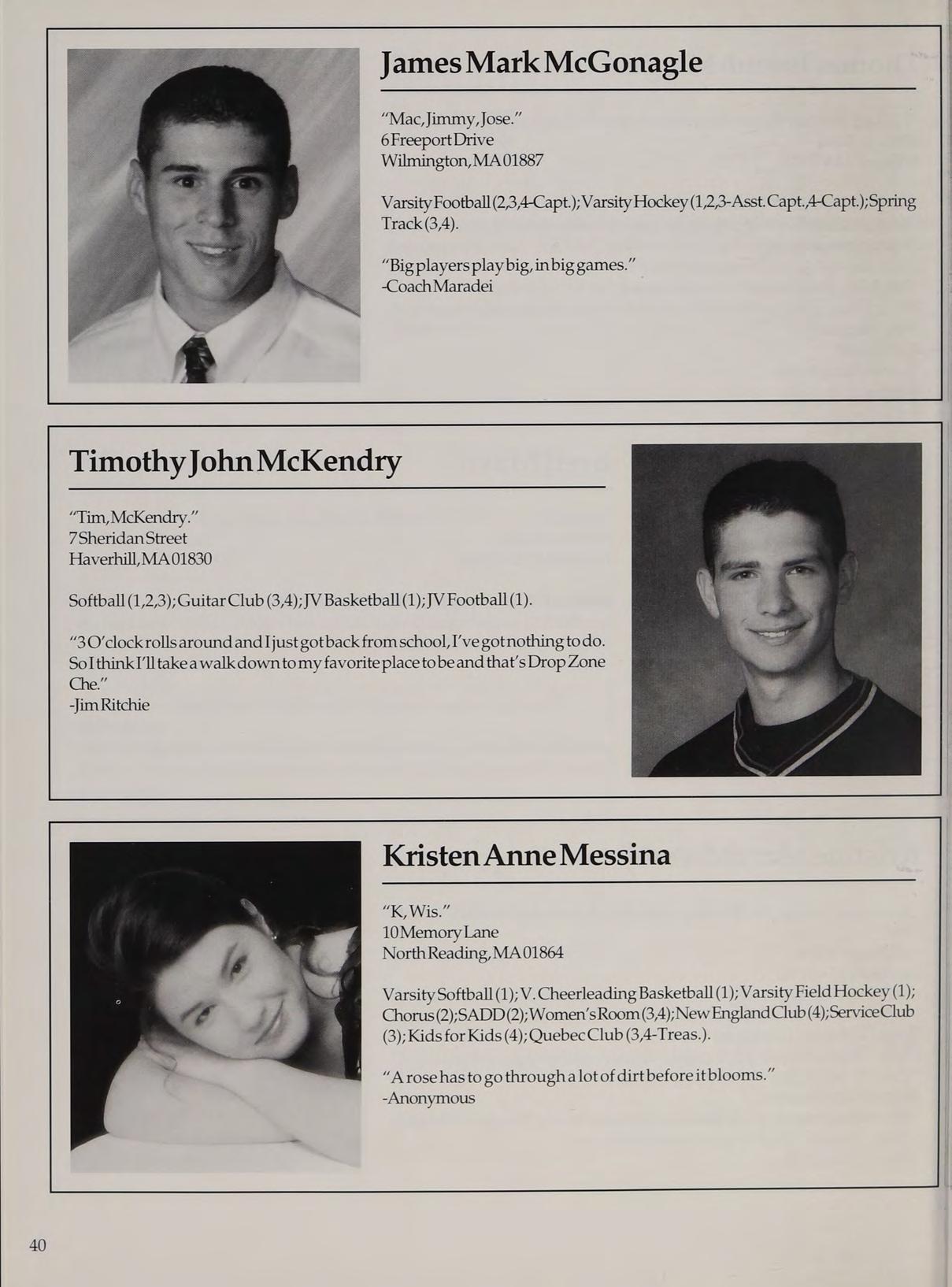 Varisty Basketball (1,2,3-Capt.,4-Capt.); Varsity Soccer (2,3); Varsity Golf (1); Spring Track (2,3,4);Cross Country (4);StudentCounail (12,3) ; National Honor Society (2,3,4);Gentlemen’s Club (4); Intramural Softball (2); Intramural Basketball (2); Latin Club (2,3); Orientation Committee (1); New England Club (2,3,4).