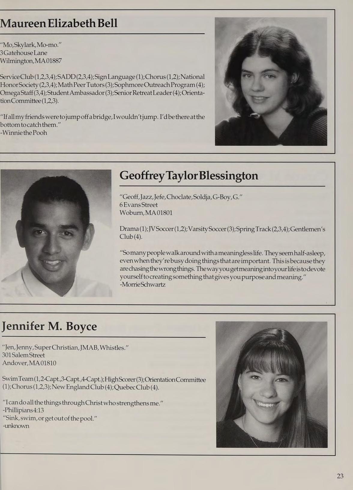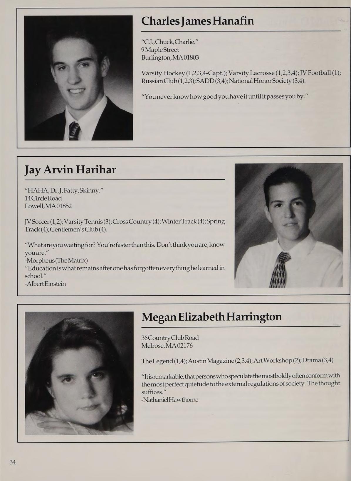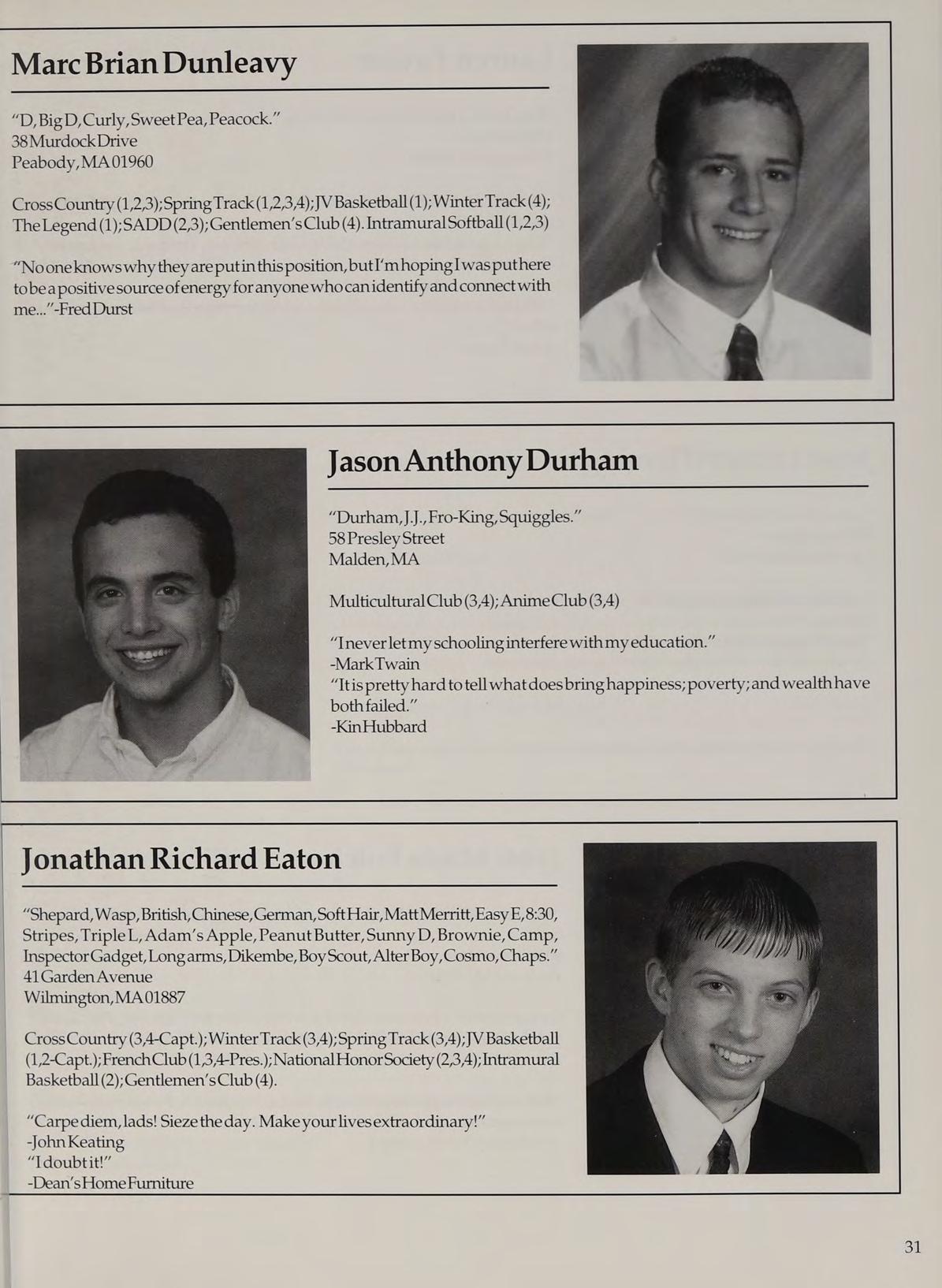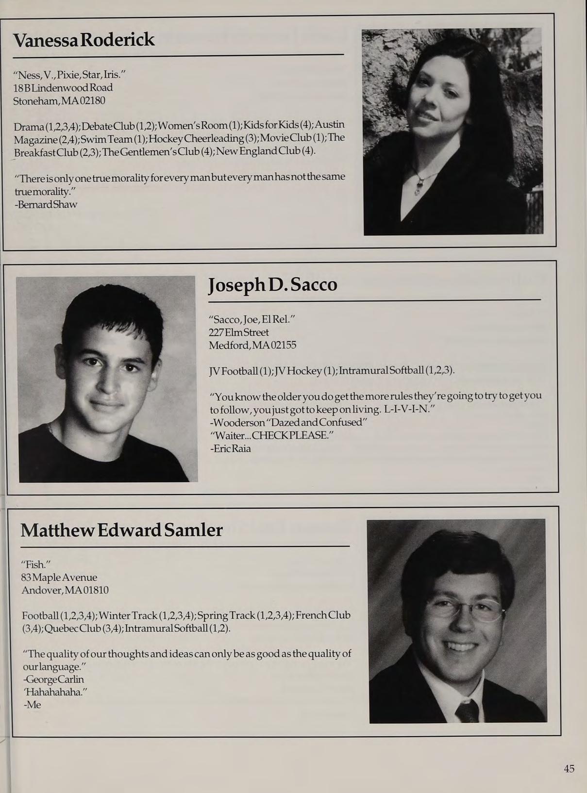 Varisty Basketball (1,2,3-Capt.,4-Capt.); Varsity Soccer (2,3); Varsity Golf (1); Spring Track (2,3,4);Cross Country (4);StudentCounail (12,3) ; National Honor Society (2,3,4);Gentlemen’s Club (4); Intramural Softball (2); Intramural Basketball (2); Latin Club (2,3); Orientation Committee (1); New England Club (2,3,4).