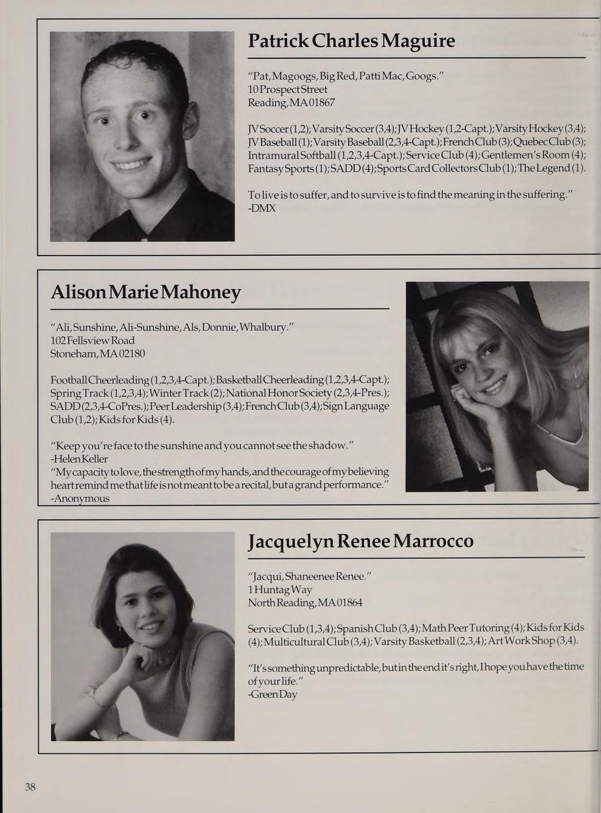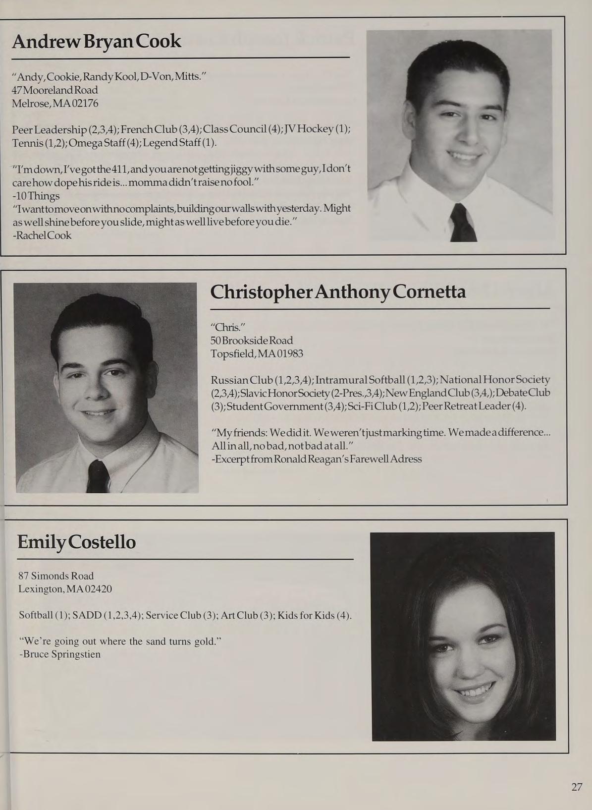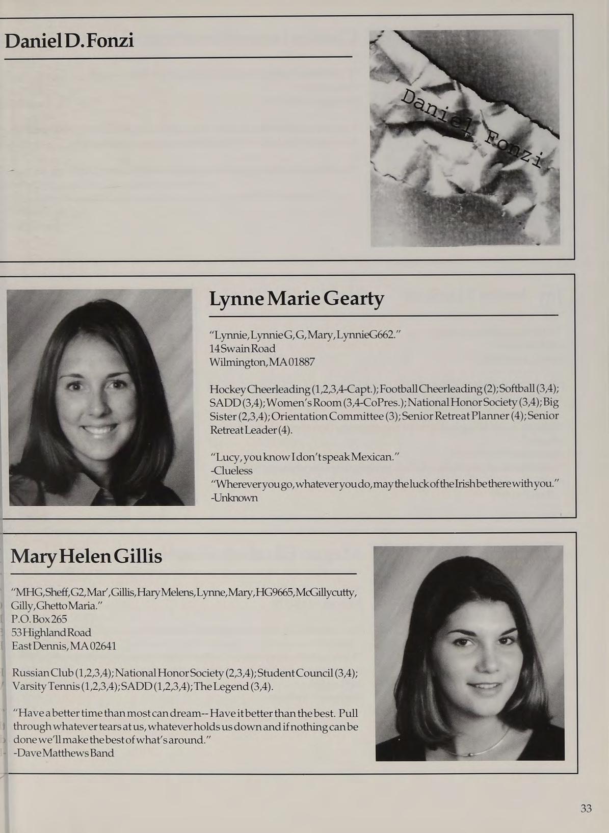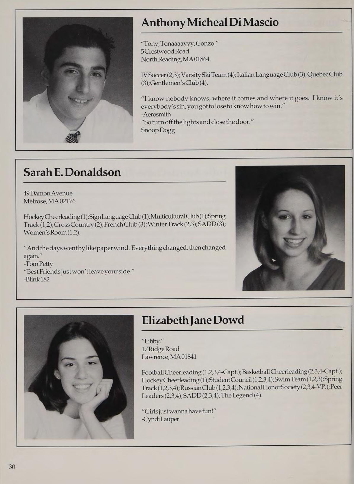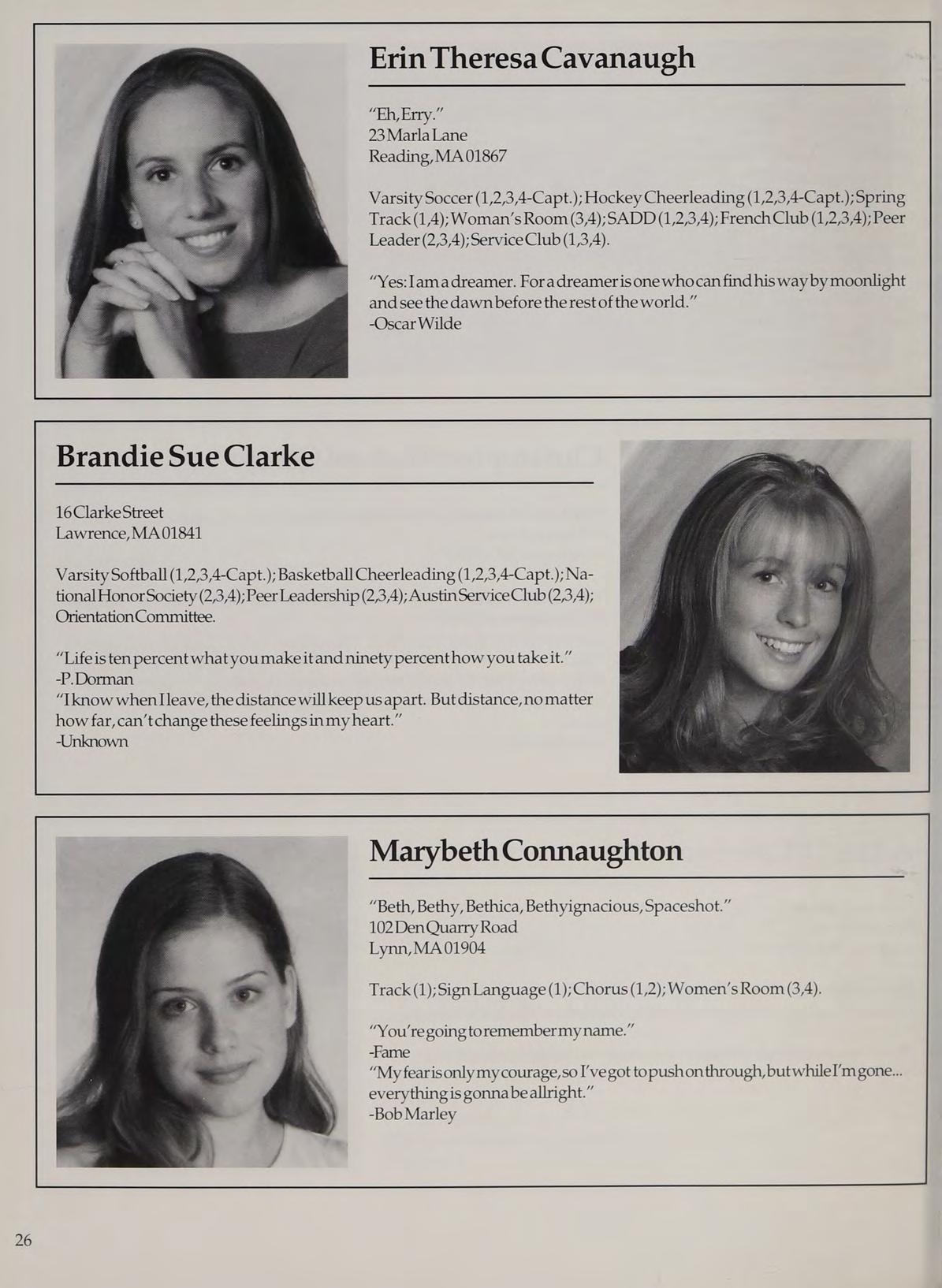 Varsity Soccer (1,2,3,4-Capt.); Hockey Cheerleading (1,2,3,4-Capt.); Spring Track (1,4); Woman’s Room (3,4); SADD (1,2,3,4); French Club (1,2,3,4); Peer Leader (2,3,4); Service Club (1,3,4).