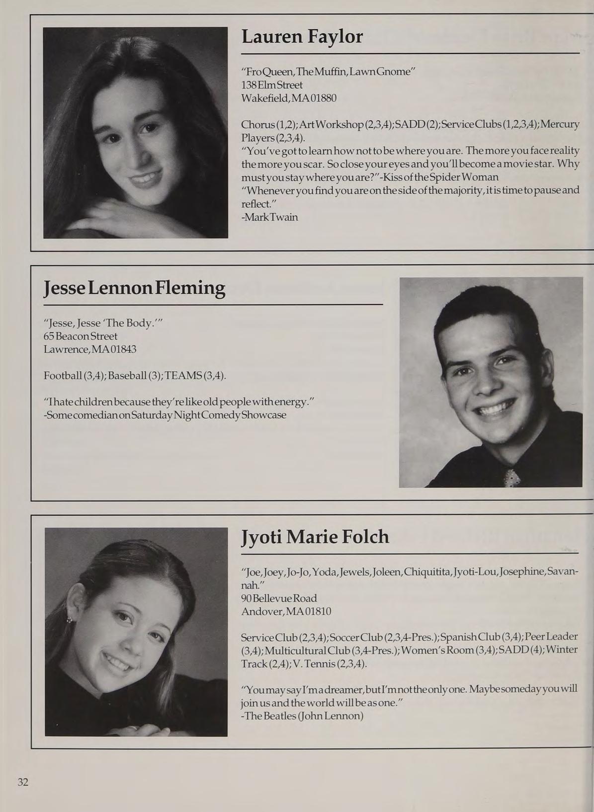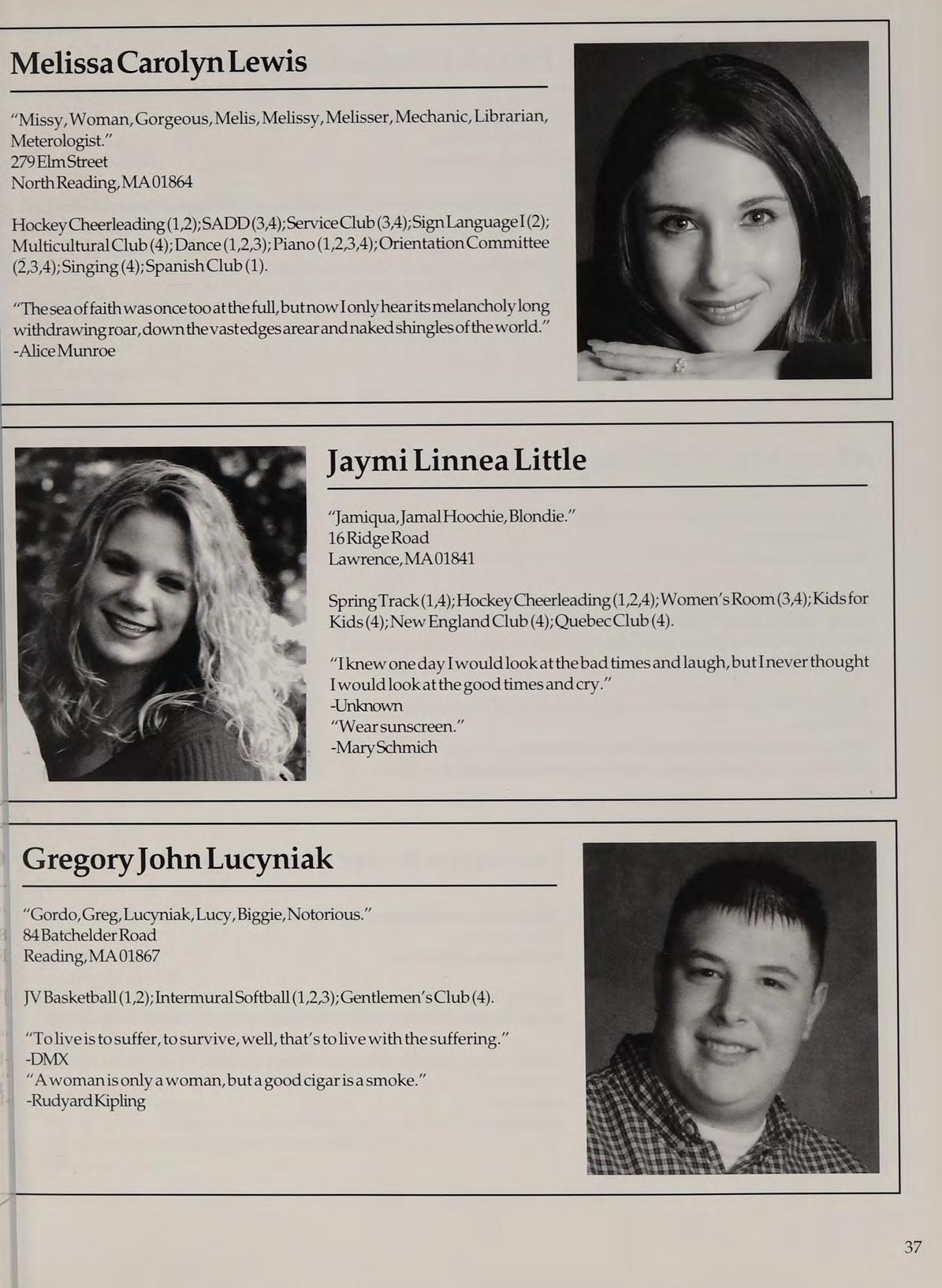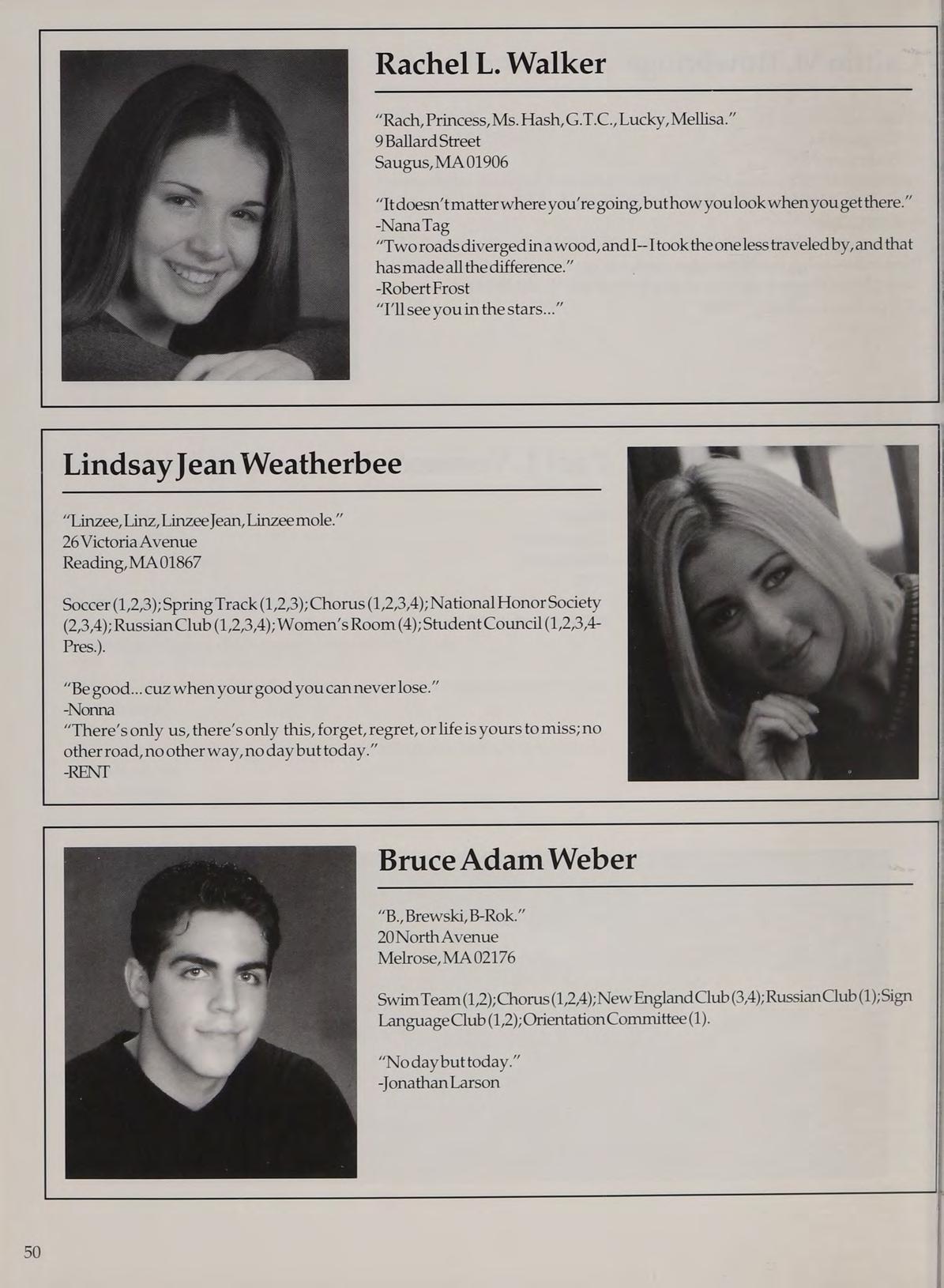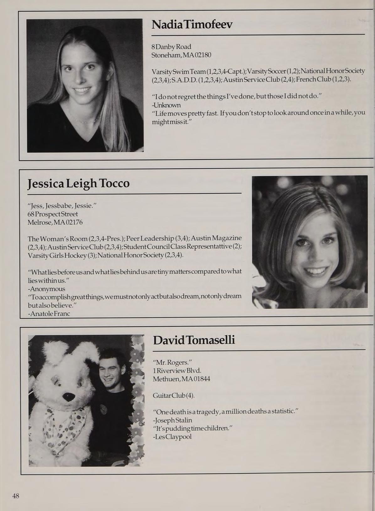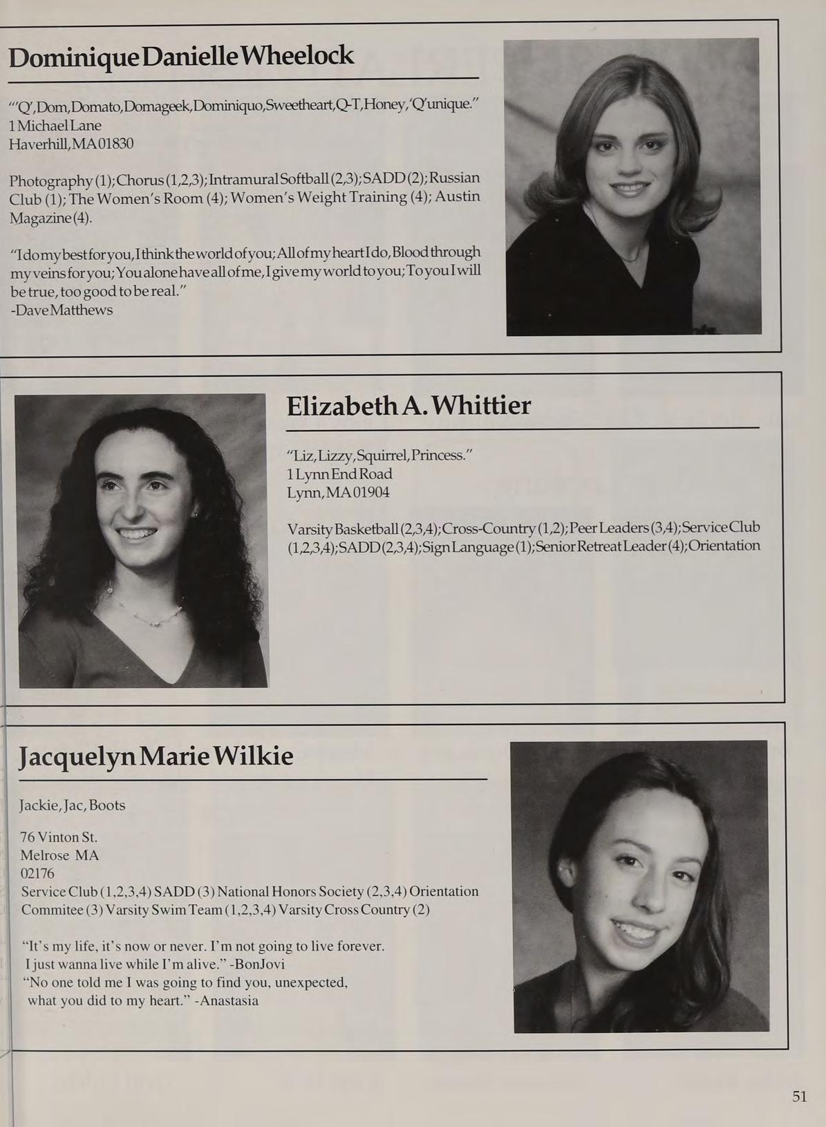 Varsity Soccer (1,2,3,4-Capt.); Hockey Cheerleading (1,2,3,4-Capt.); Spring Track (1,4); Woman’s Room (3,4); SADD (1,2,3,4); French Club (1,2,3,4); Peer Leader (2,3,4); Service Club (1,3,4).