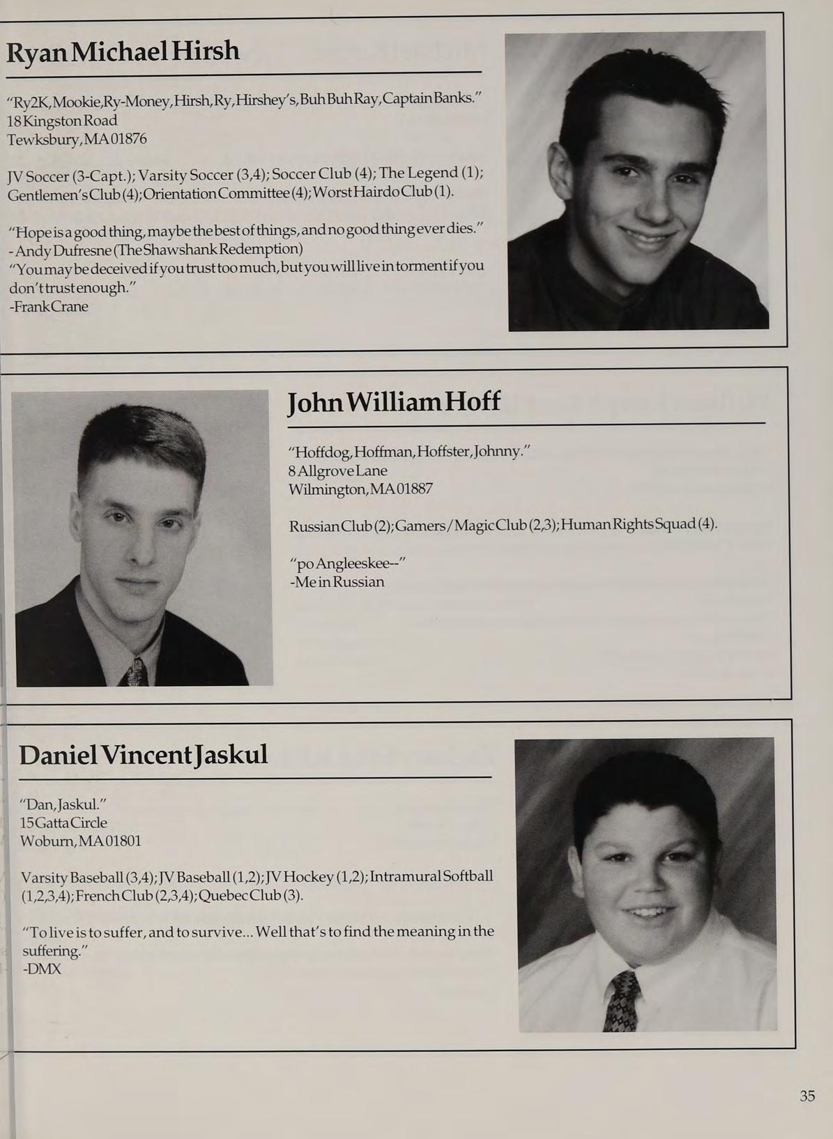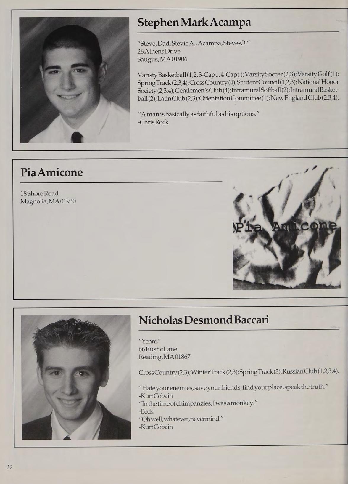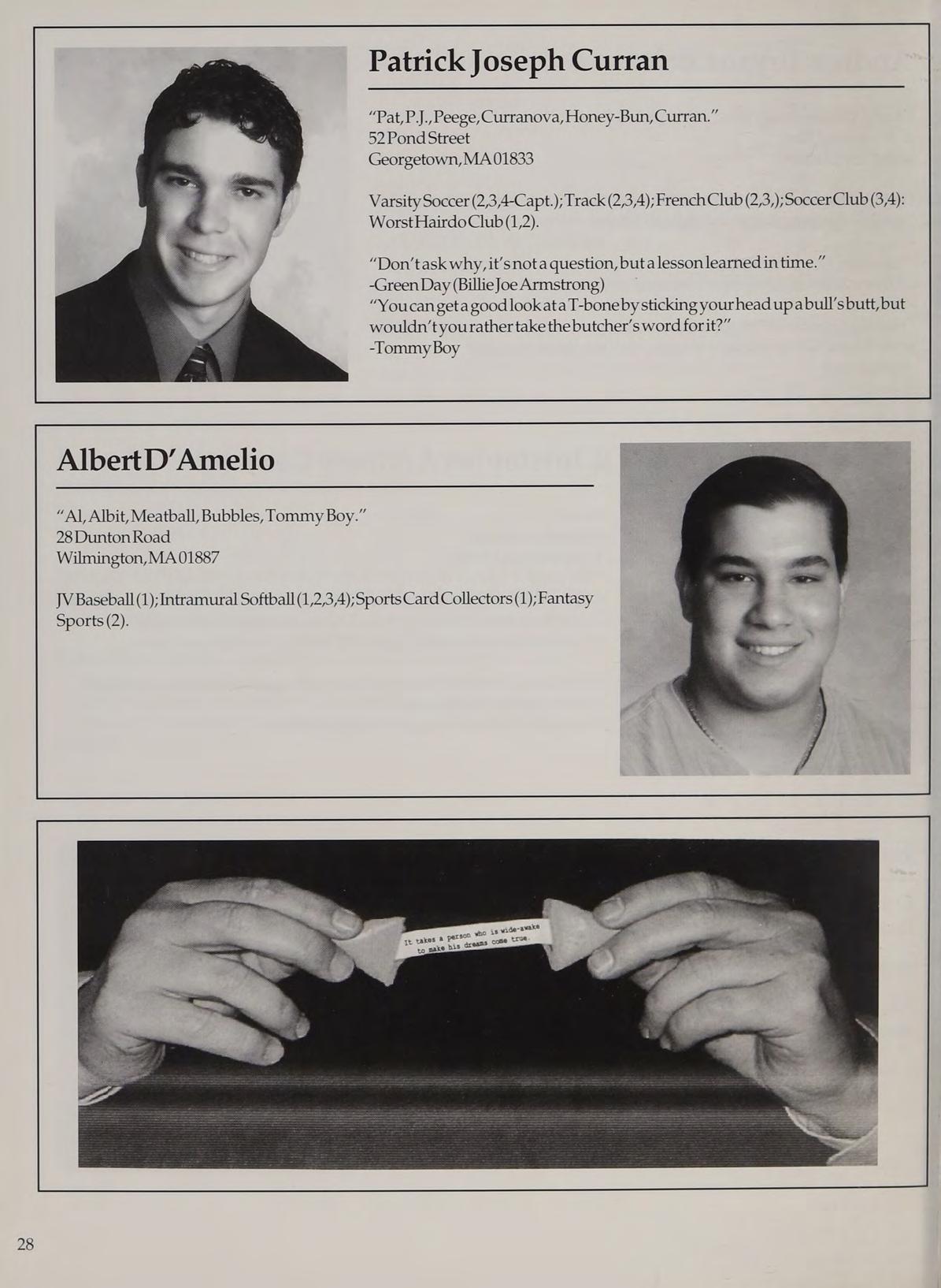 Varsity Soccer (1,2,3,4-Capt.); Spring Track (3,4);Spanish Club (1); Weight Lifting Club (1); Soccer Club (3,4); Worst Hairdo Club (1); National Honors Society (3,4).