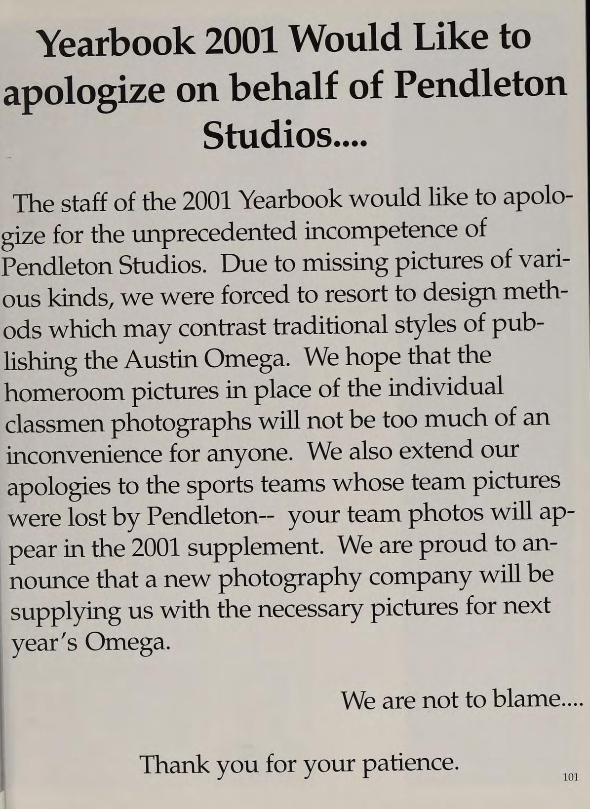 The staff of the 2001 Yearbook would like to apolo gize for the unprecedented incompetence of Pendleton Studios. Due to missing pictures of various kinds, we were forced to resort to design methods which may contrast traditional styles of publishing the Austin Omega. We hope that the homeroom pictures in place of the individual classmen photographs will not be too much of an inconvenience for anyone. We also extend our apologies to the sports teams whose team pictures were lost by Pendleton-- your team photos will appear in the 2001 supplement. We are proud to announce that a new photography company will be supplying us with the necessary pictures for next year’s Omega. We are not to blame....