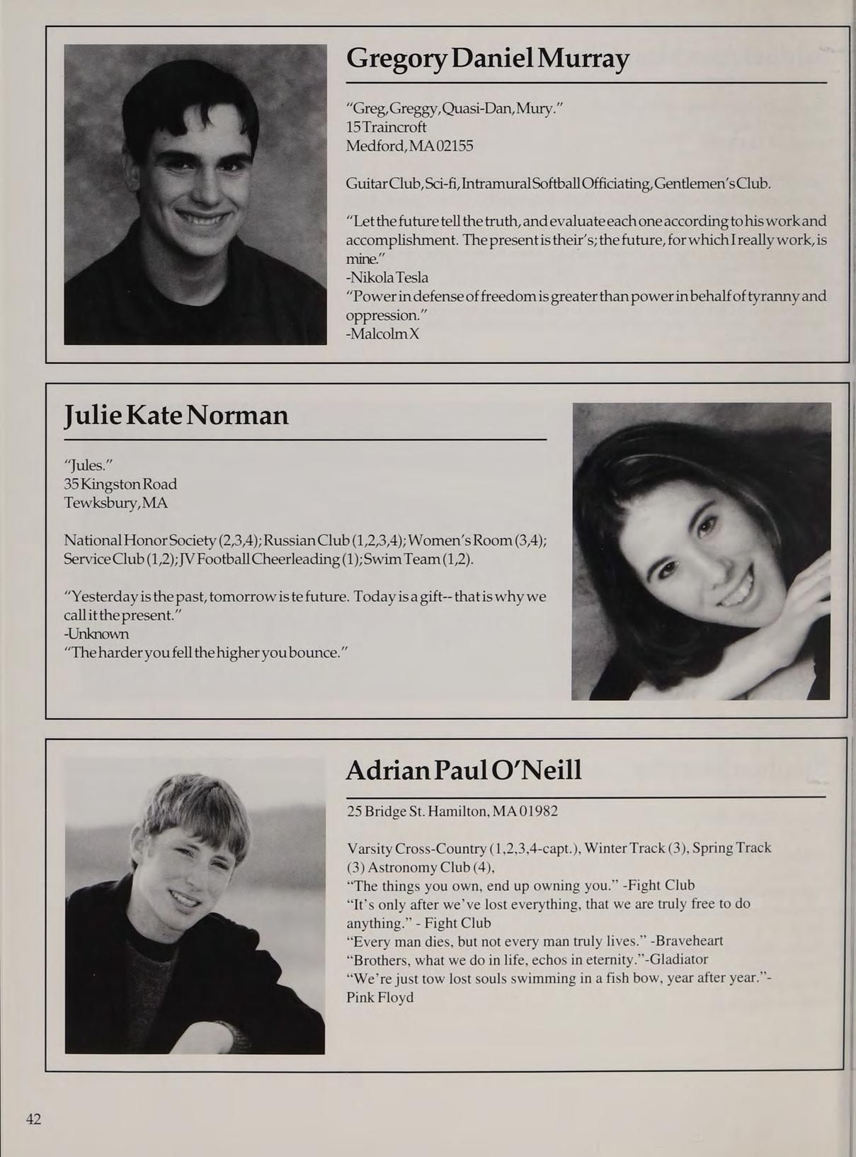 Russian Club (1,2,3,4); Intramural Softball (1,2,3); National Honor Society (2,3,4);Slavic Honor Society (2-Pres.,3,4); New England Club (3,4,); Debate Club (3); Student Government (3,4); Sci-Fi Club (1,2); Peer Retreat Leader (4).