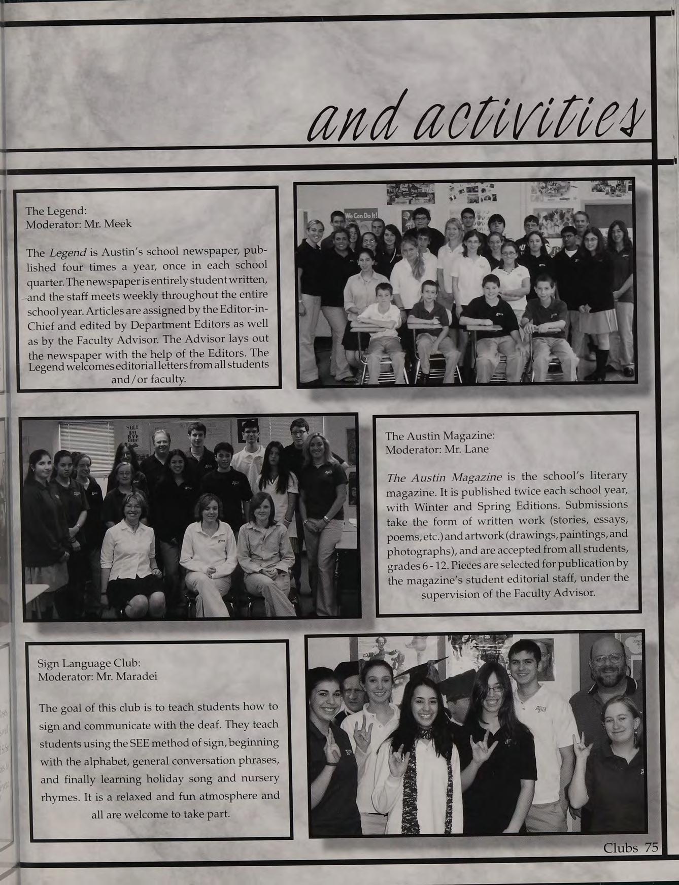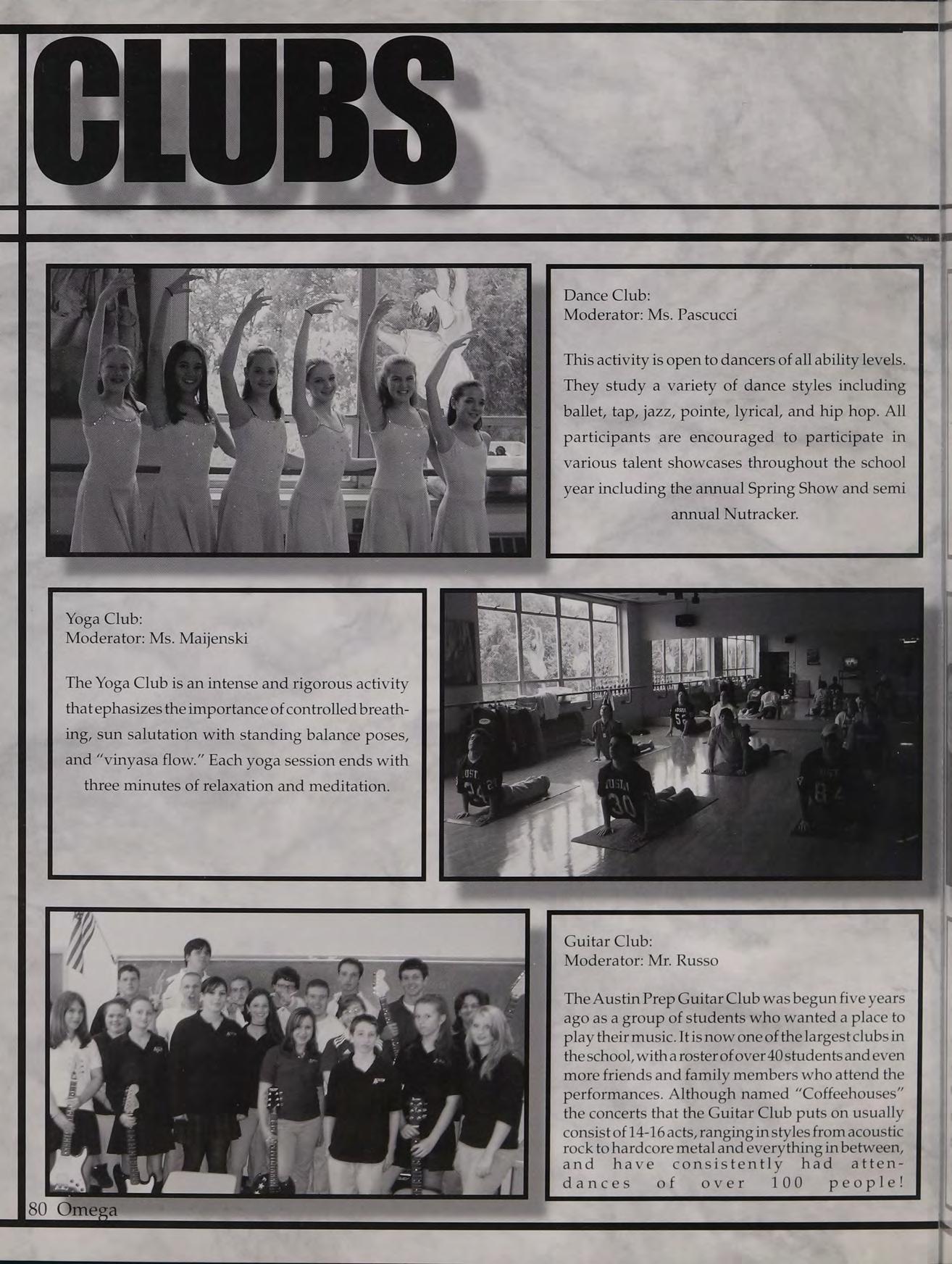 Austin Magazine (1,2,3 & 4-co-editor), Dance Club (1,2,3,4), Debate Club (1), Math Peer Tutors (1,2,3,4), Multicultural Club (3,4), NHS (2,3,4), Service Club (2,3,4), Spanish Club (2), Ski Team (1,2,3,4), Orientation Committee (2,3,4)