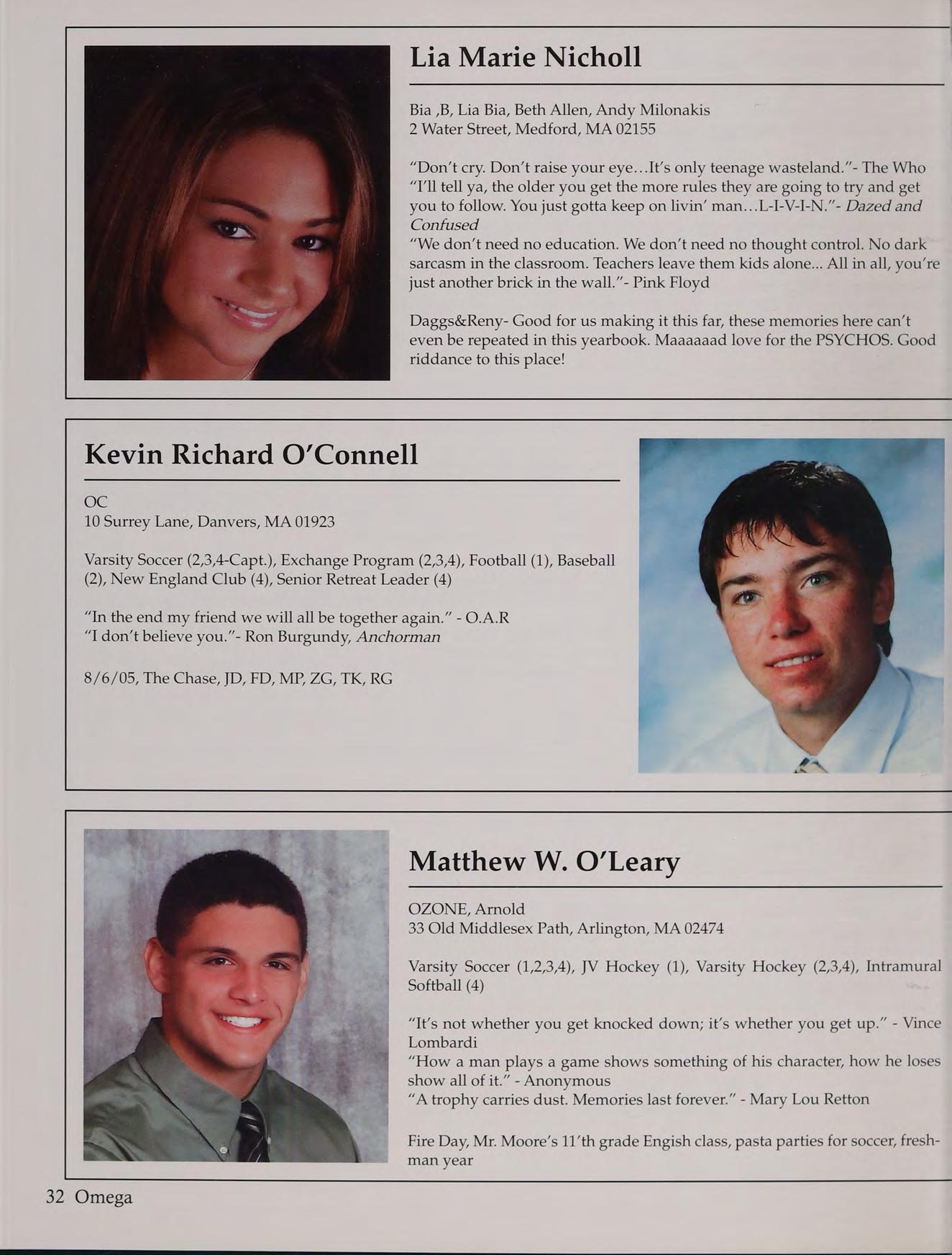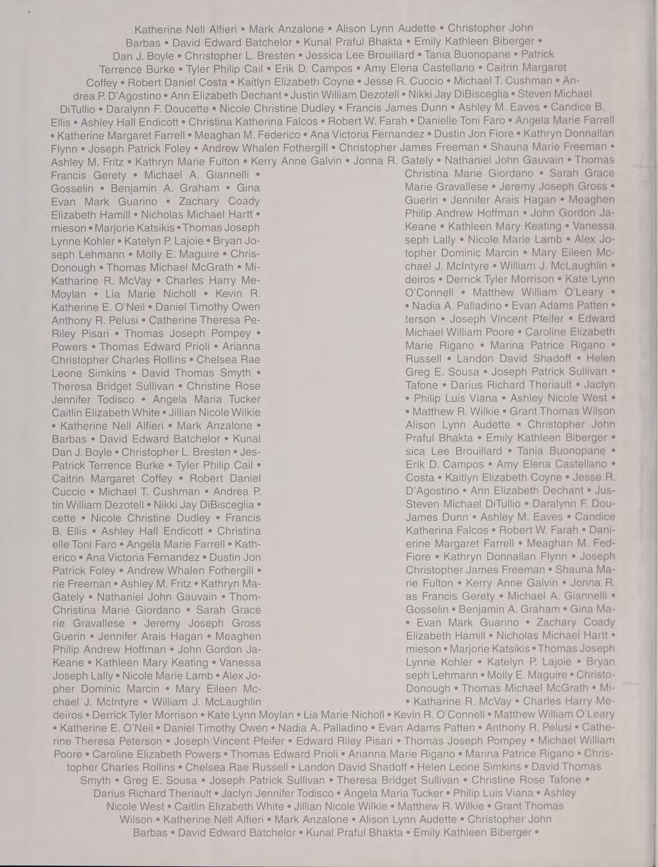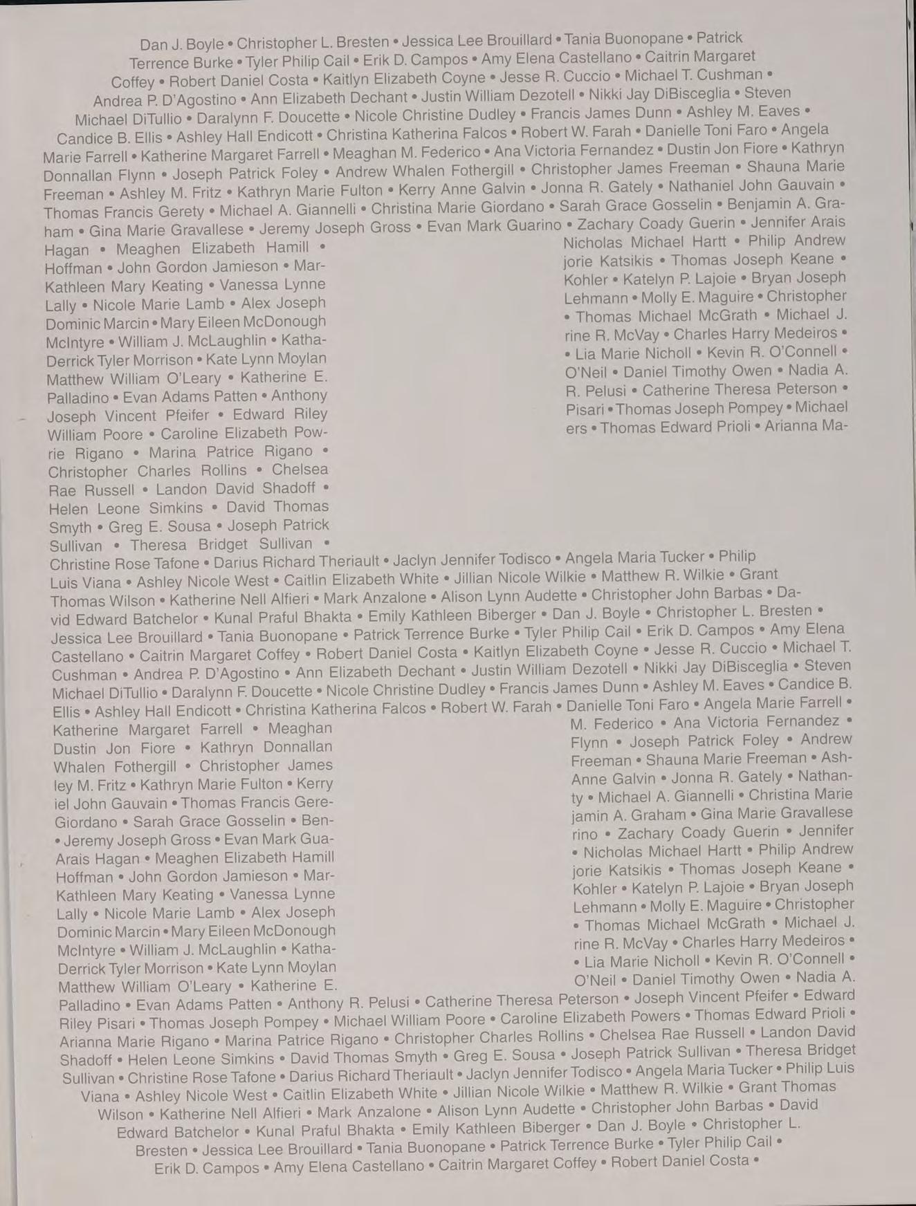 Alison Lynn Audette * Christopher John Praful Bhakta * Emily Kathleen Biberger » sica Lee Brouillard * Tania Buonopane * Erik D. Campos * Amy Elena Castellano Costa * Kaitlyn Elizabeth Coyne ¢ Jesse R. D'Agostino * Ann Elizabeth Dechant JusSteven Michael DiTullio Daralynn F. DouJames Dunn ¢ Ashley M. Eaves * Candice Katherina Falcos * Robert W. Farah ¢ Danierine Margaret Farrell Meaghan M. FedFiore « Kathryn Donnallan Flynn * Joseph Christopher James Freeman ¢ Shauna Marie Fulton ¢ Kerry Anne Galvin ¢ Jonna R. as Francis Gerety * Michael A. Giannelli * Gosselin * Benjamin A. Graham ¢ Gina Ma¢ Evan Mark Guarino * Zachary Coady Elizabeth Hamill Nicholas Michael Hartt ¢ mieson * Marjorie Katsikis Thomas Joseph Lynne Kohler * Katelyn P. Lajoie * Bryan seph Lehmann ¢ Molly E. Maguire * ChristoDonough * Thomas Michael McGrath * Mi¢ Katharine R. McVay * Charles Harry Medeiros ¢ Derrick Tyler Morrison * Kate Lynn Moylan ¢ Lia Marie Nicholl Kevin R. O'Connell * Matthew William O’Leary ¢ Katherine E. O’Neil * Daniel Timothy Owen » Nadia A. Palladino Evan Adams Patten ¢ Anthony R. Pelusi * Catherine Theresa Peterson * Joseph Vincent Pfeifer Edward Riley Pisari Thomas Joseph Pompey * Michael William Poore * Caroline Elizabeth Powers Thomas Edward Prioli Arianna Marie Rigano * Marina Patrice Rigano * Christopher Charles Rollins Chelsea Rae Russell Landon David Shadoff Helen Leone Simkins * David Thomas Smyth * Greg E. Sousa * Joseph Patrick Sullivan * Theresa Bridget Sullivan * Christine Rose Tafone * Darius Richard Theriault Jaclyn Jennifer Todisco « Angela Maria Tucker ¢ Philip Luis Viana * Ashley Nicole West ¢ Caitlin Elizabeth White « Jillian Nicole Wilkie Matthew R. Wilkie Grant Thomas Wilson ¢ Katherine Nell Alfieri Mark Anzalone ¢ Alison Lynn Audette * Christopher John Barbas * David Edward Batchelor * Kunal Praful Bhakta * Emily Kathleen Biberger