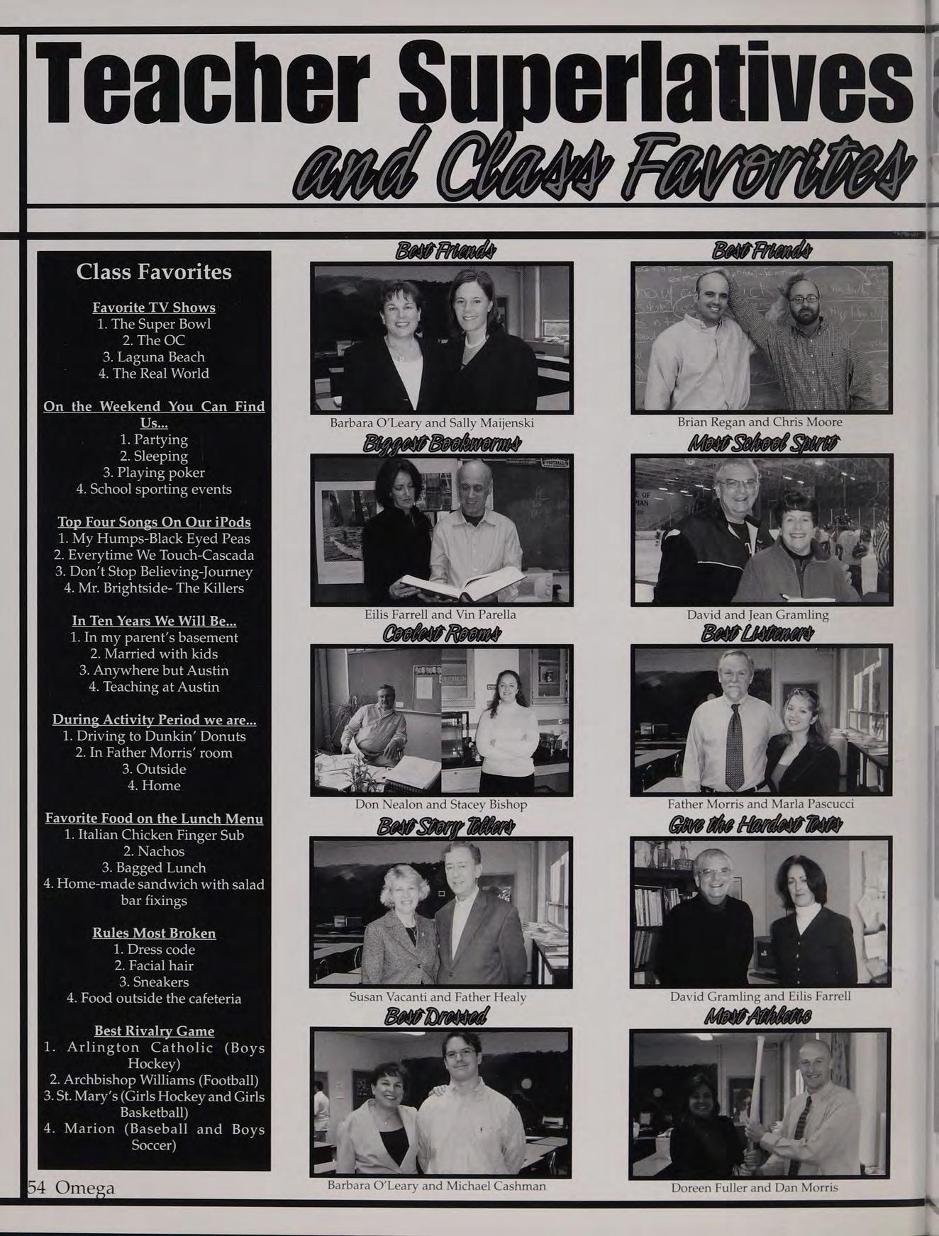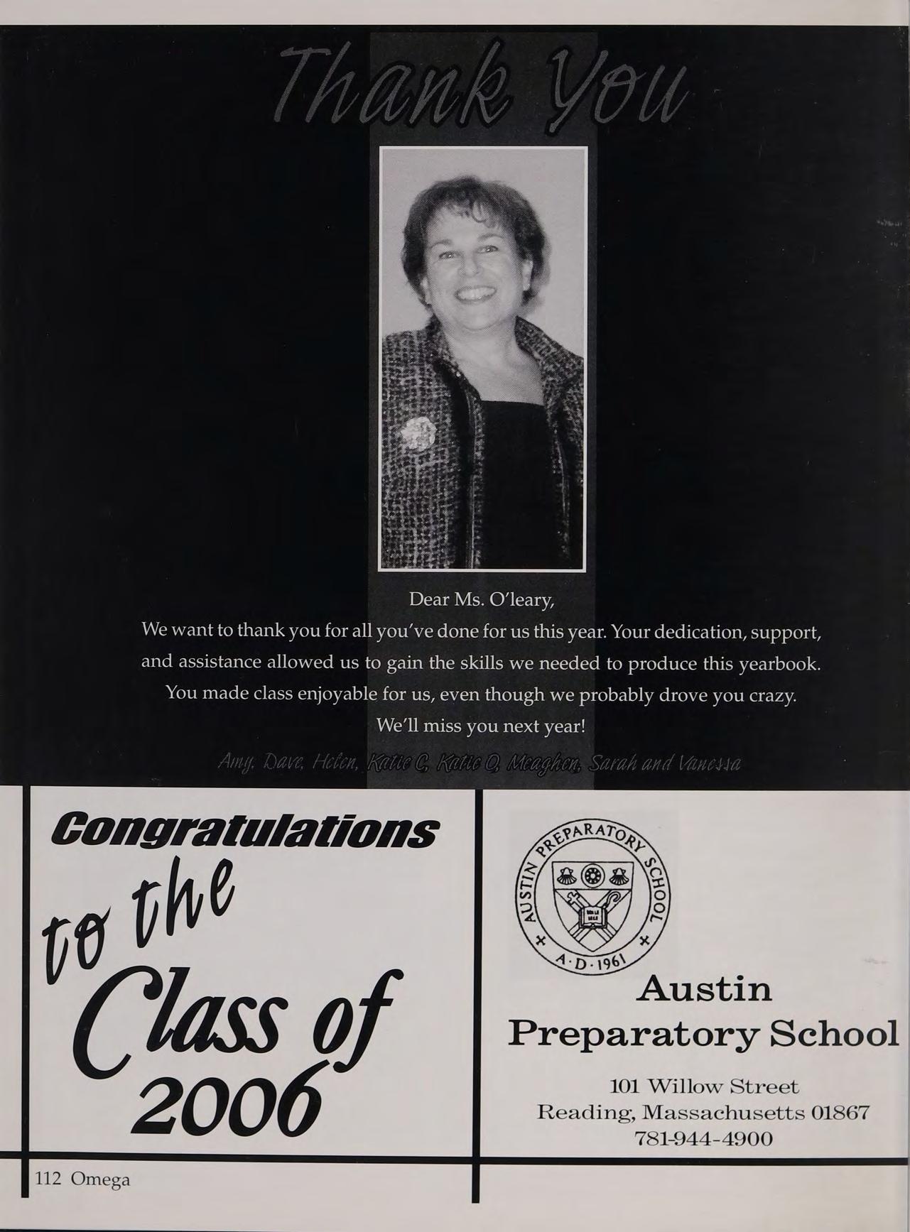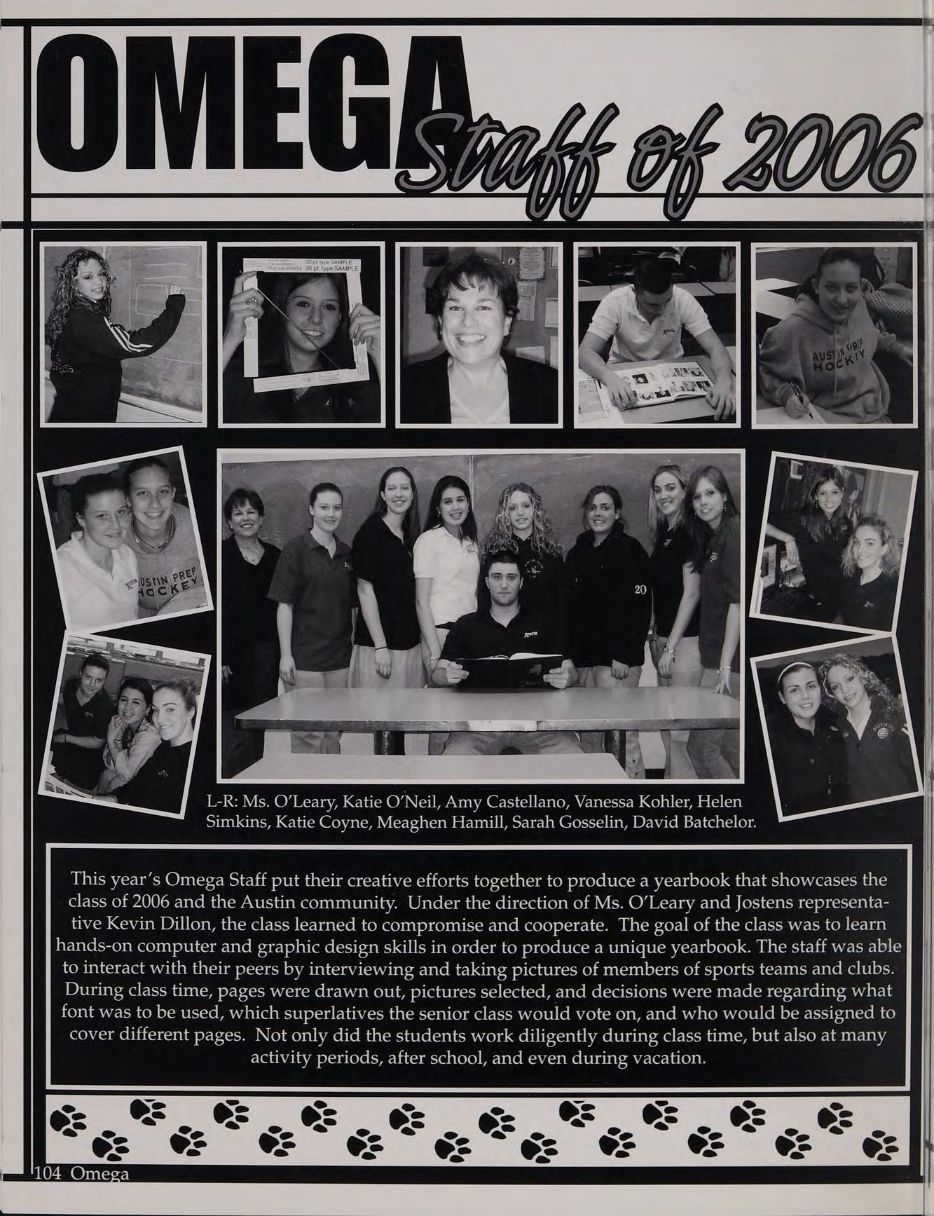 This year’s Omega Staff put their creative efforts together to produce a yearbook that showcases the class of 2006 and the Austin community. Under the direction of Ms. O’Leary and Jostens representative Kevin Dillon, the class learned to compromise and cooperate. The goal of the class was to learn hands-on computer and graphic design skills in order to produce a unique yearbook. The staff was able to interact with their peers by interviewing and taking pictures of members of sports teams and clubs. During class time, pages were drawn out, pictures selected, and decisions were made regarding what font was to be used, which superlatives the senior class would vote on, and who would be assigned to cover different pages. Not only did the students work diligently during class time, but also at many activity periods, after school, and even during vacation.