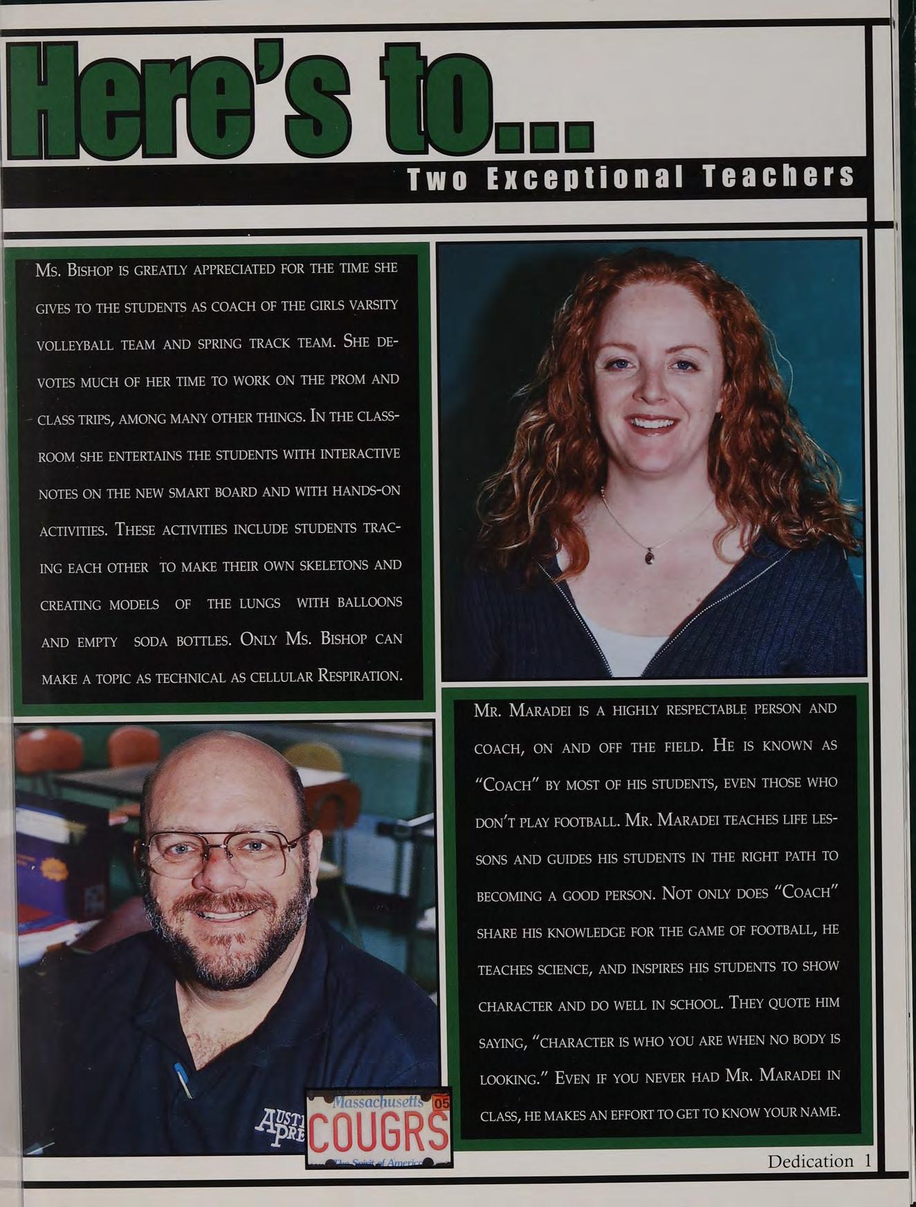 Ms. BISHOP IS GREATLY APPRECIATED FOR THE TIME SHE GIVES TO THE STUDENTS AS COACH OF THE GIRLS VARSITY VOLLEYBALL TEAM AND SPRING TRACK TEAM. SHE DEVOTES MUCH OF HER TIME TO WORK ON THE PROM AND CLASS TRIPS, AMONG MANY OTHER THINGS. IN THE CLASSROOM SHE ENTERTAINS THE STUDENTS WITH INTERACTIVE NOTES ON THE NEW SMART BOARD AND WITH HANDS-ON ACTIVITIES. THESE ACTIVITIES INCLUDE STUDENTS TRACING EACH OTHER TO MAKE THEIR OWN SKELETONS AND CREATING MODELS OF THE LUNGS WITH BALLOONS AND EMPTY SODA BOTTLES. ONLY Ms. BISHOP CAN MAKE A TOPIC AS TECHNICAL AS CELLULAR RESPIRATION.