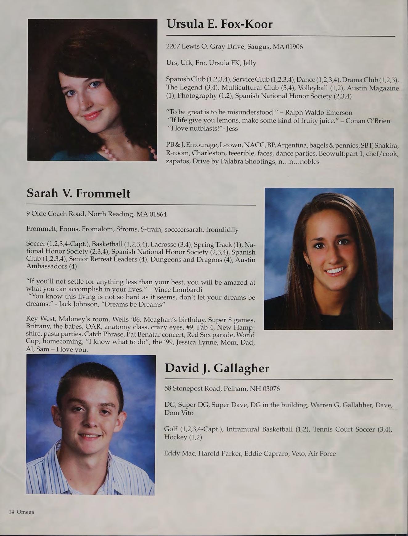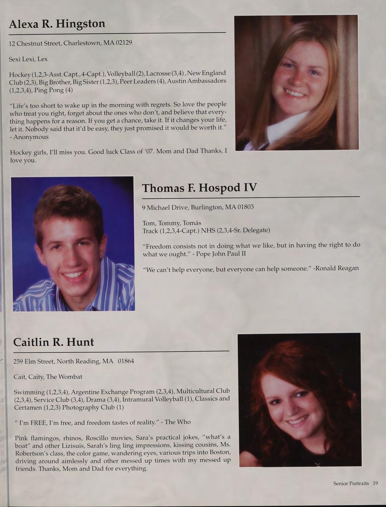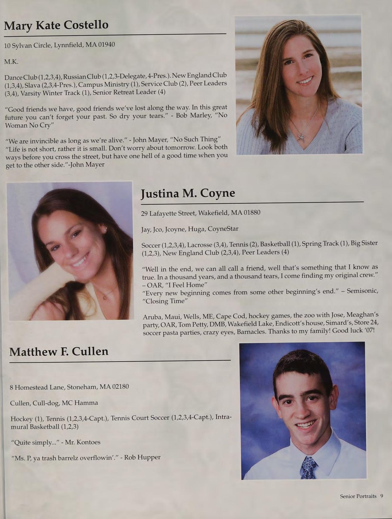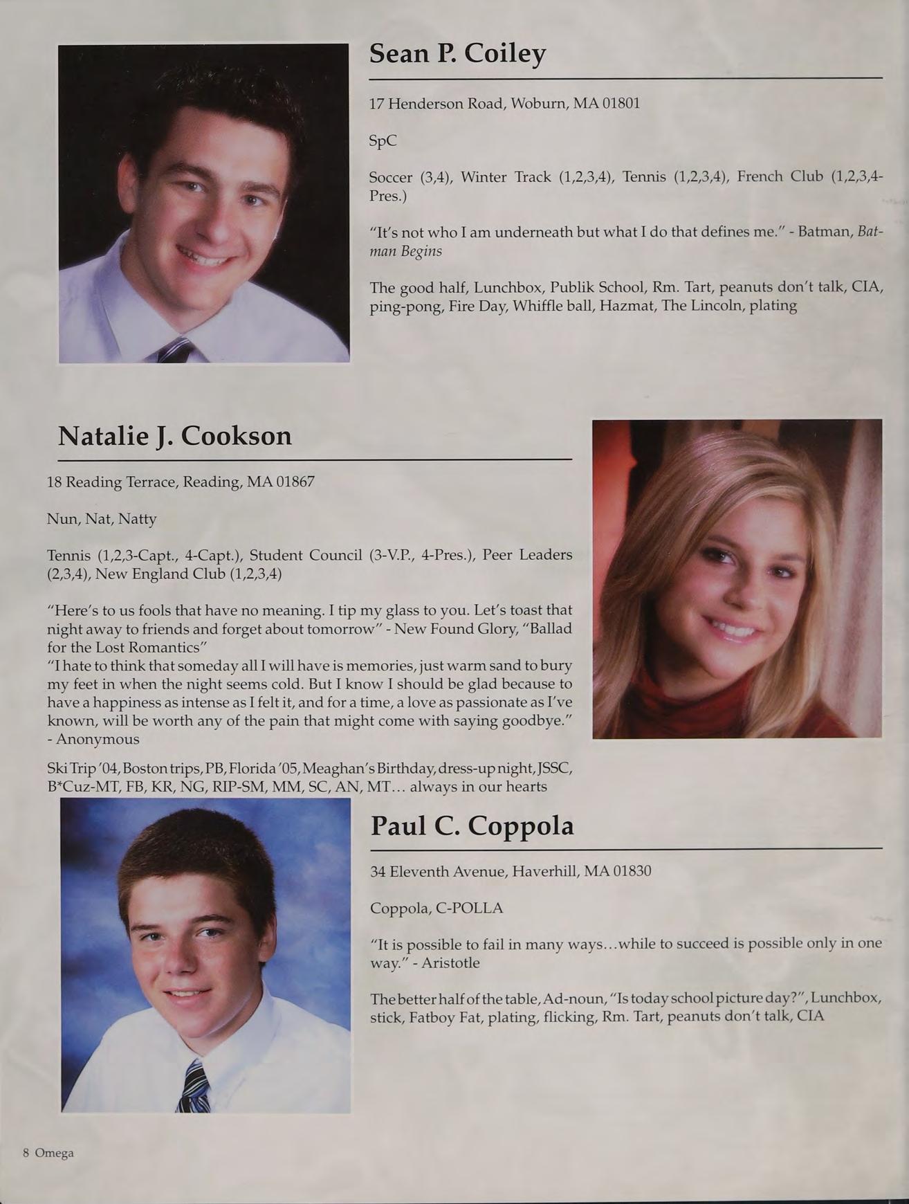 Tennis (1,2,3-Capt., 4-Capt.), Student Council (3-V.P., 4-Pres.), Peer Leaders (2,3,4), New England Club (1,2,3,4)