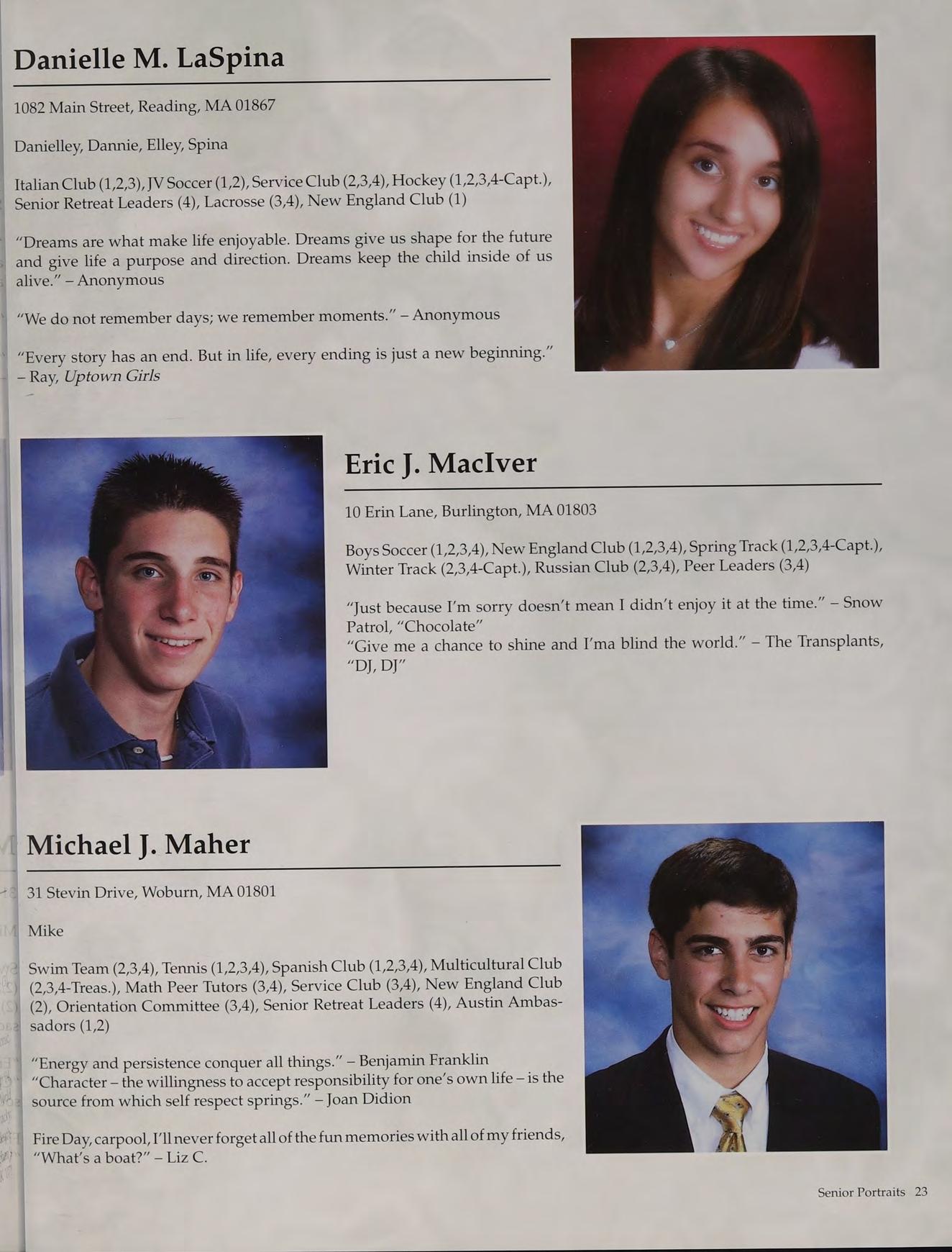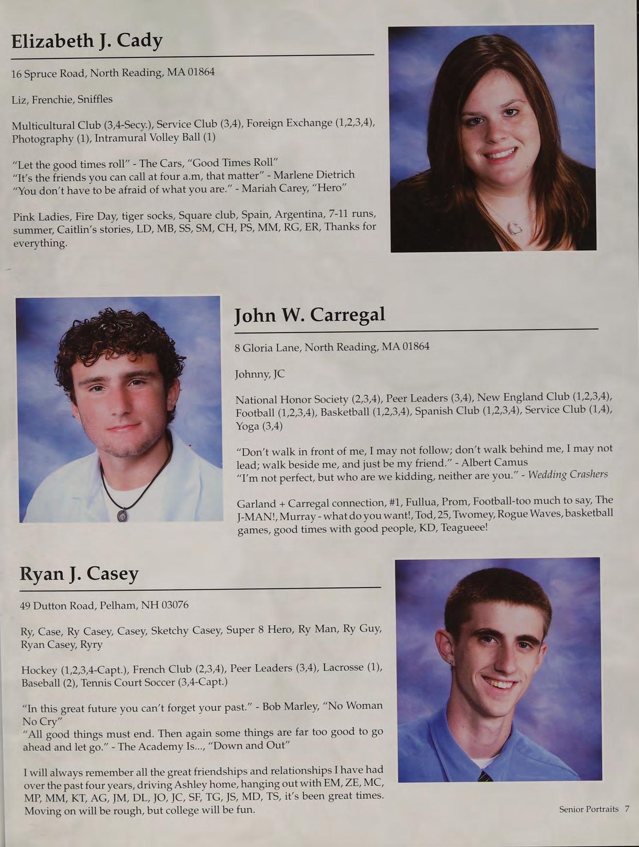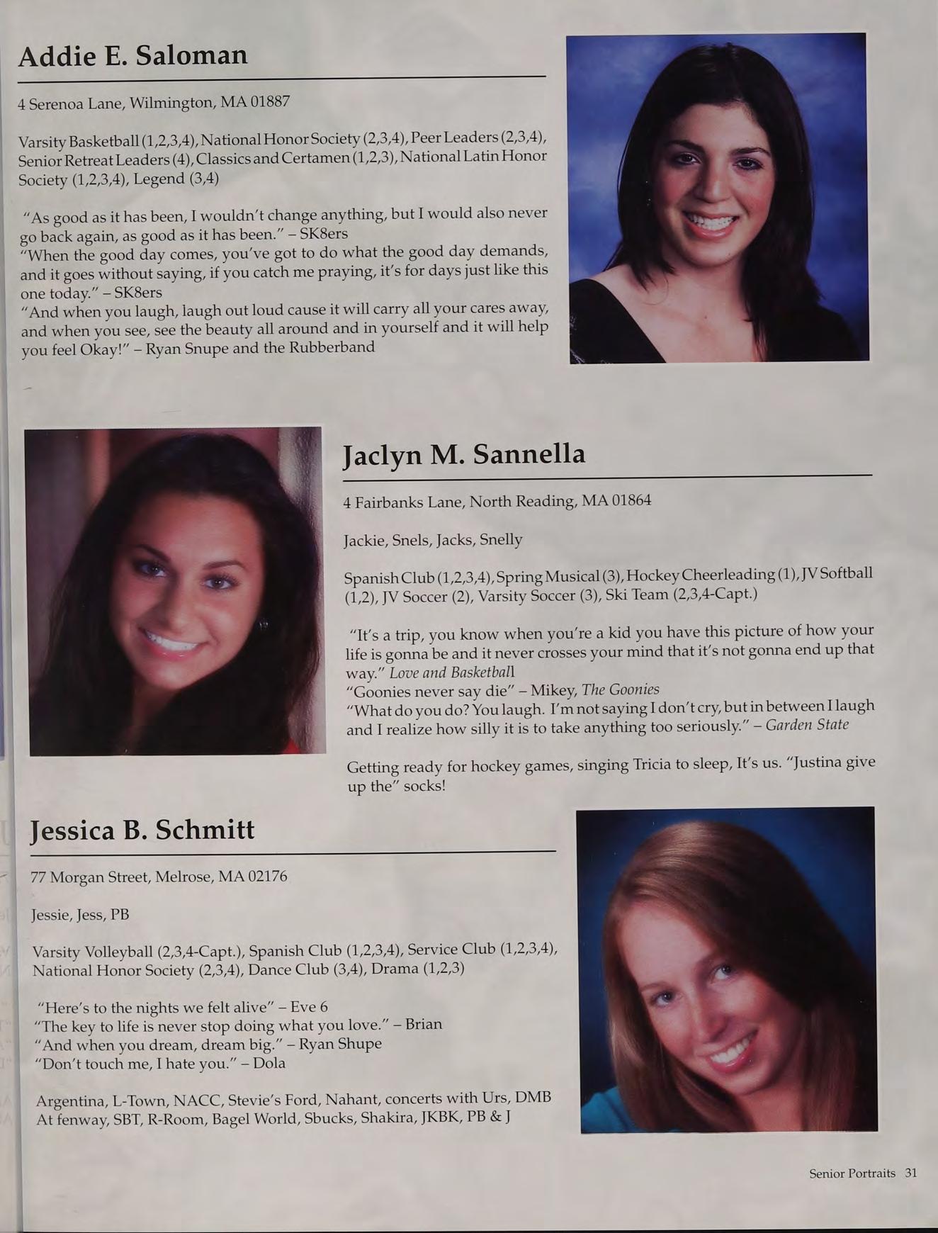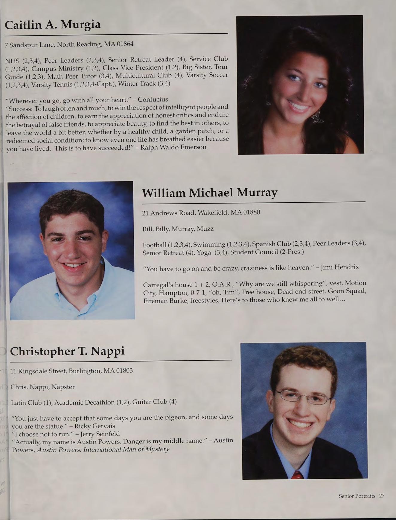 Tennis (1,2,3-Capt., 4-Capt.), Student Council (3-V.P., 4-Pres.), Peer Leaders (2,3,4), New England Club (1,2,3,4)