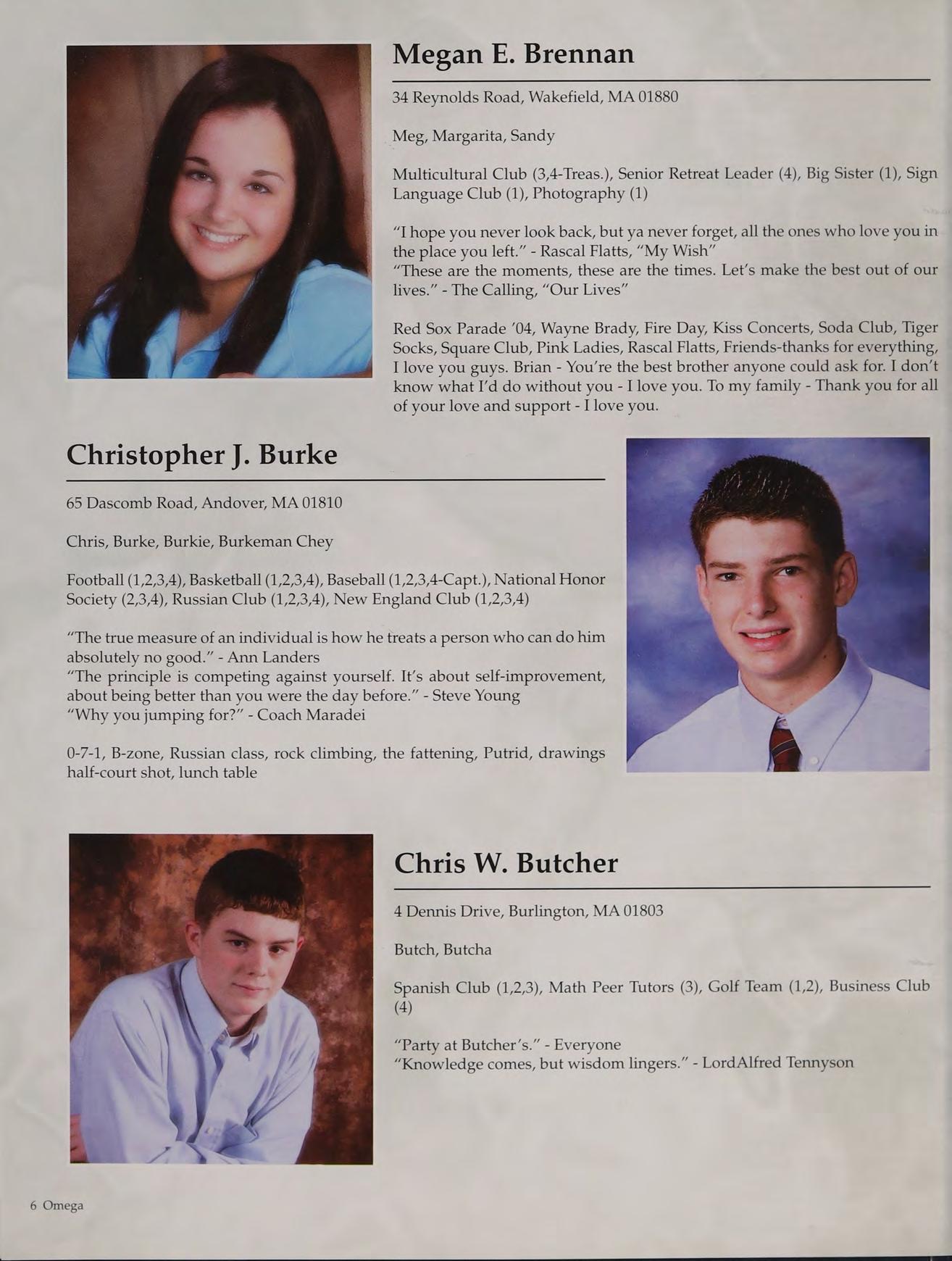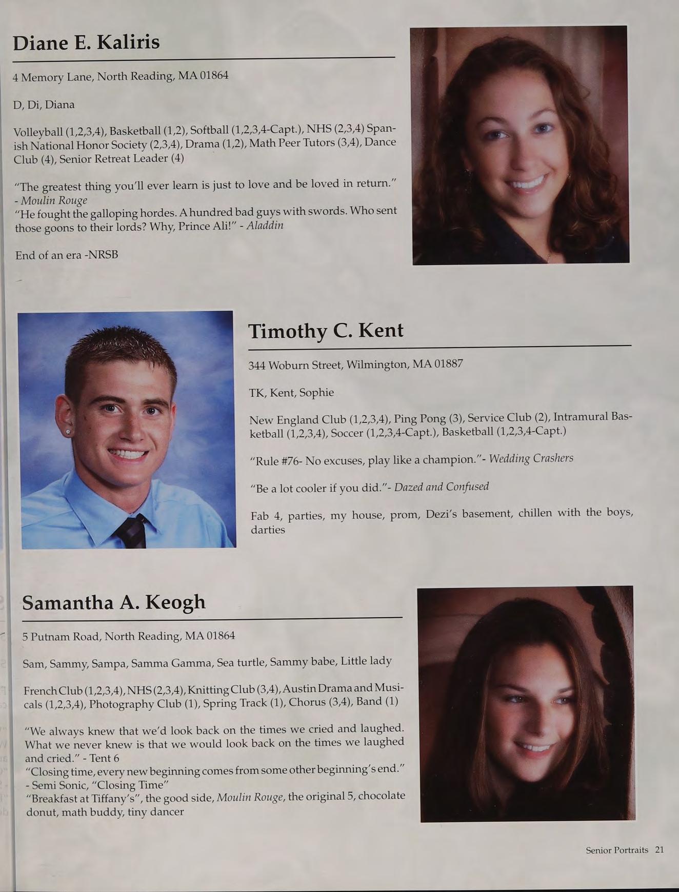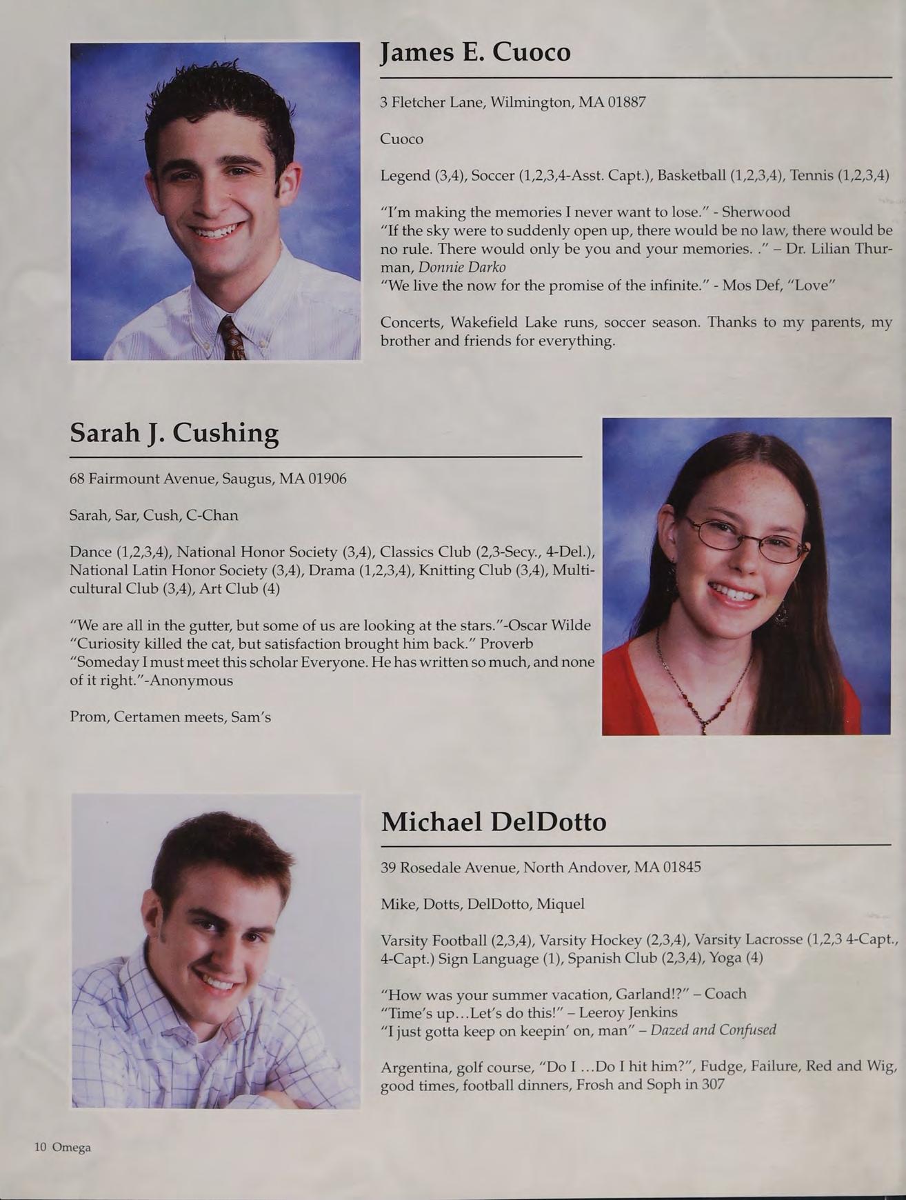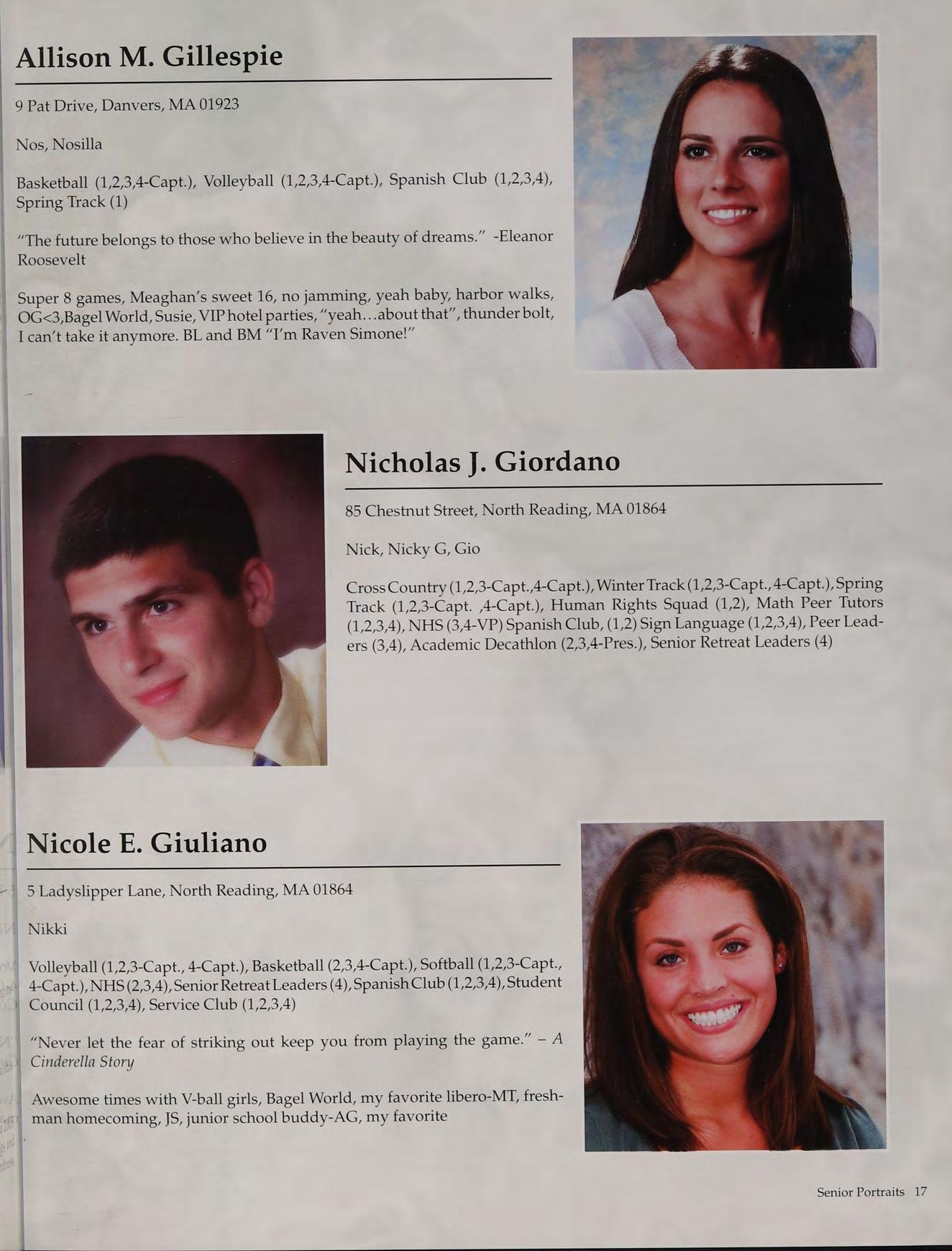Tennis (1,2,3-Capt., 4-Capt.), Student Council (3-V.P., 4-Pres.), Peer Leaders (2,3,4), New England Club (1,2,3,4)