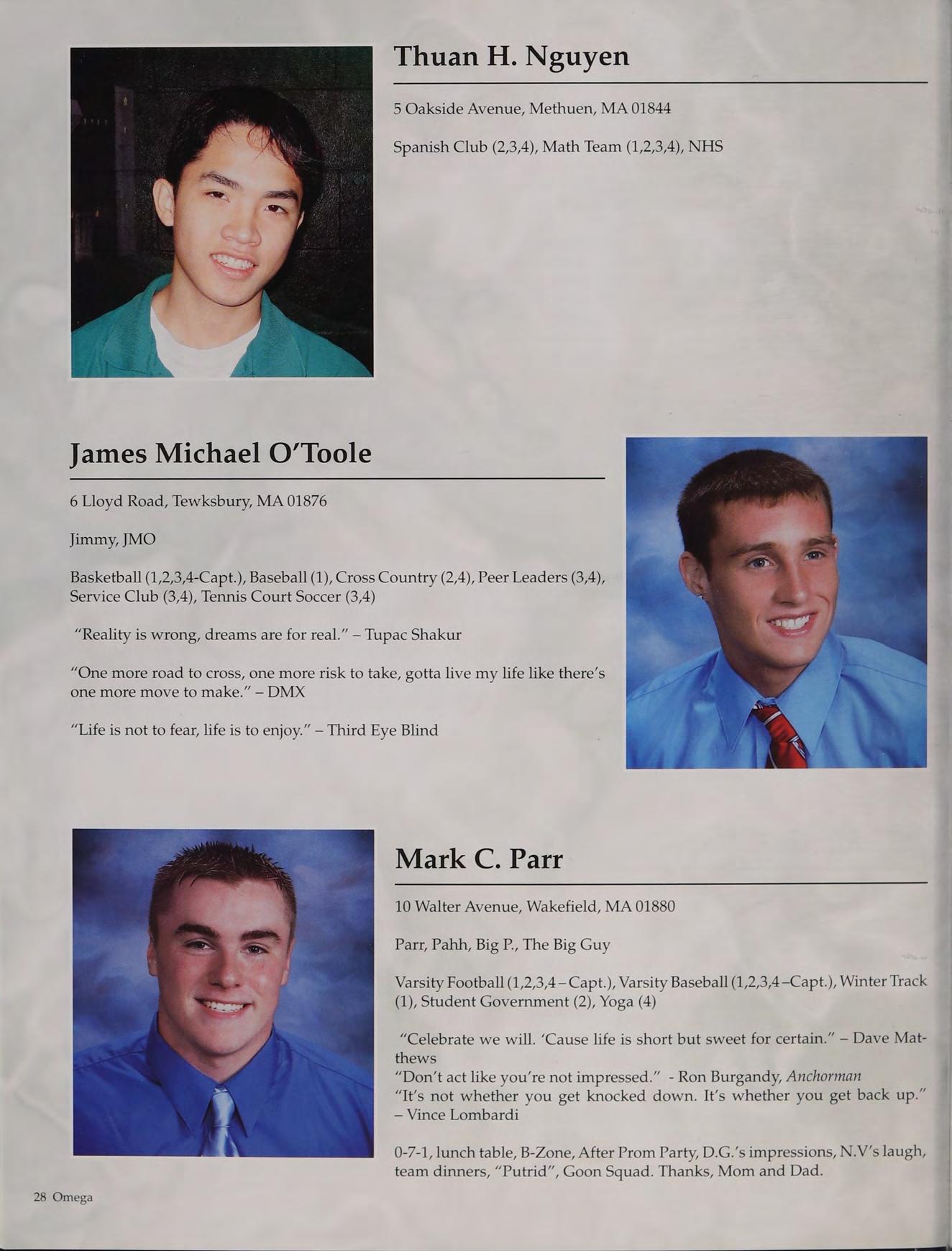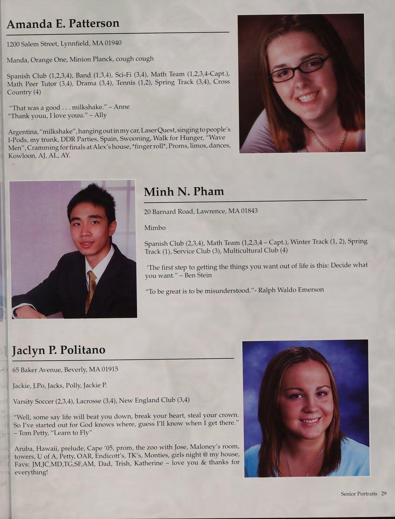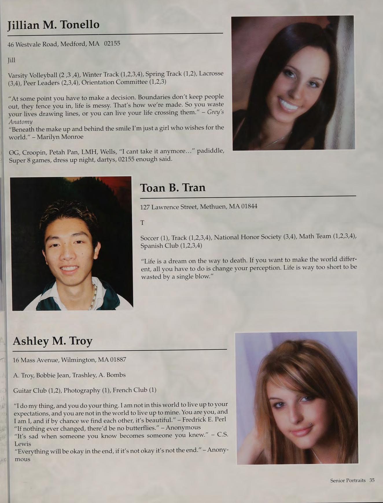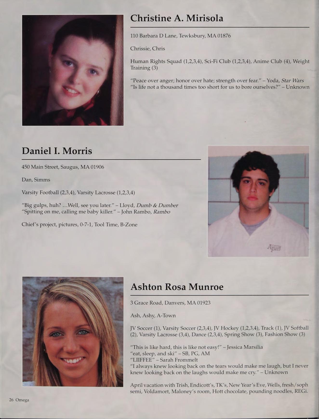 Tennis (1,2,3-Capt., 4-Capt.), Student Council (3-V.P., 4-Pres.), Peer Leaders (2,3,4), New England Club (1,2,3,4)
