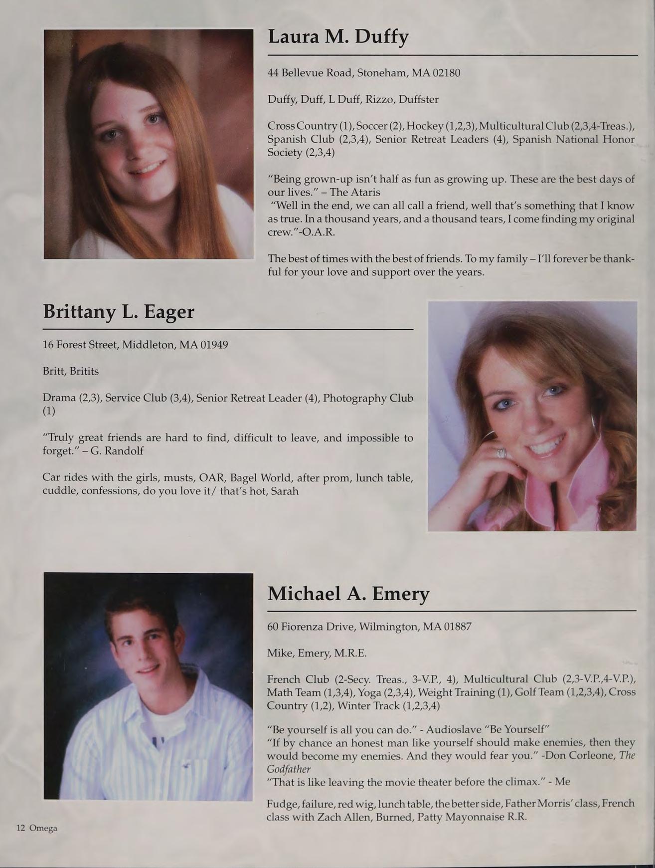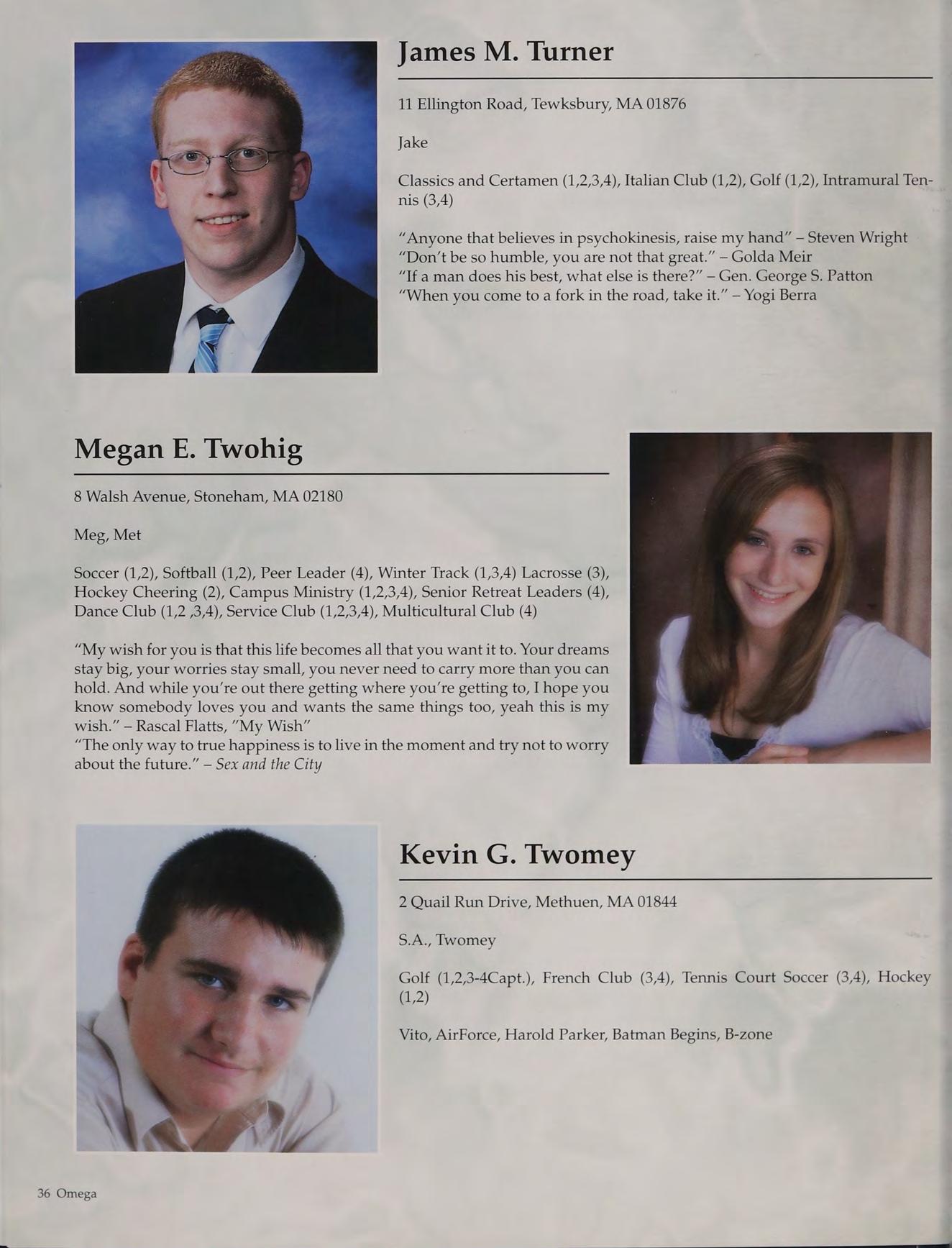 Dance Club (1,2,3,4), Russian Club (1,2,3-Delegate, 4-Pres.). New England Club (1,3,4), Slava (2,3,4-Pres.), Campus Ministry (1), Service Club (2), Peer Leaders (3,4), Varsity Winter Track (1), Senior Retreat Leader (4)