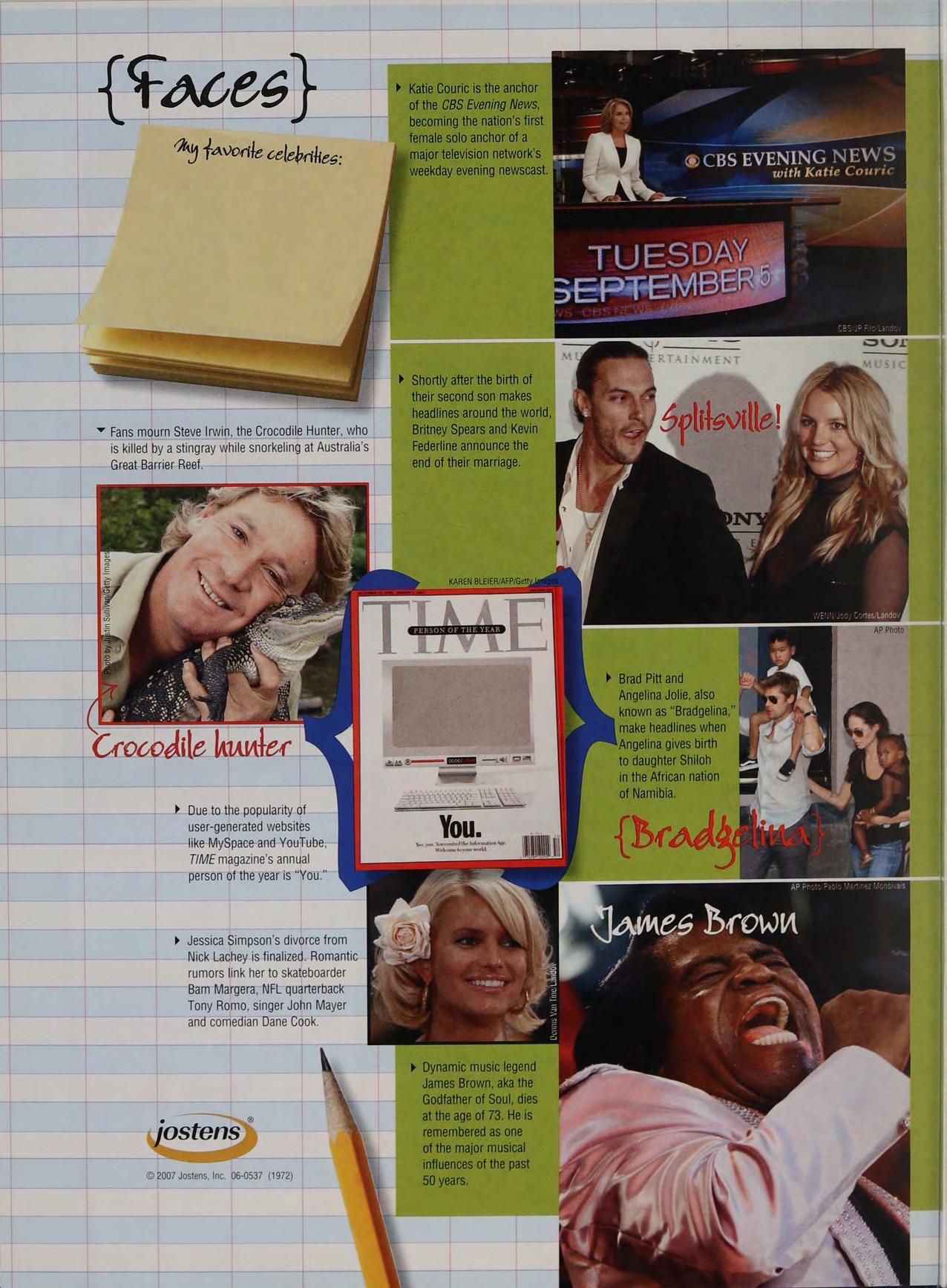 Y Fans mourn Steve Irwin, the Crocodile Hunter, who Britney Spears and Kevin is killed by a stingray while snorkeling at Australia’s Federline announce the Great Barrier Reef. end of their marriage.