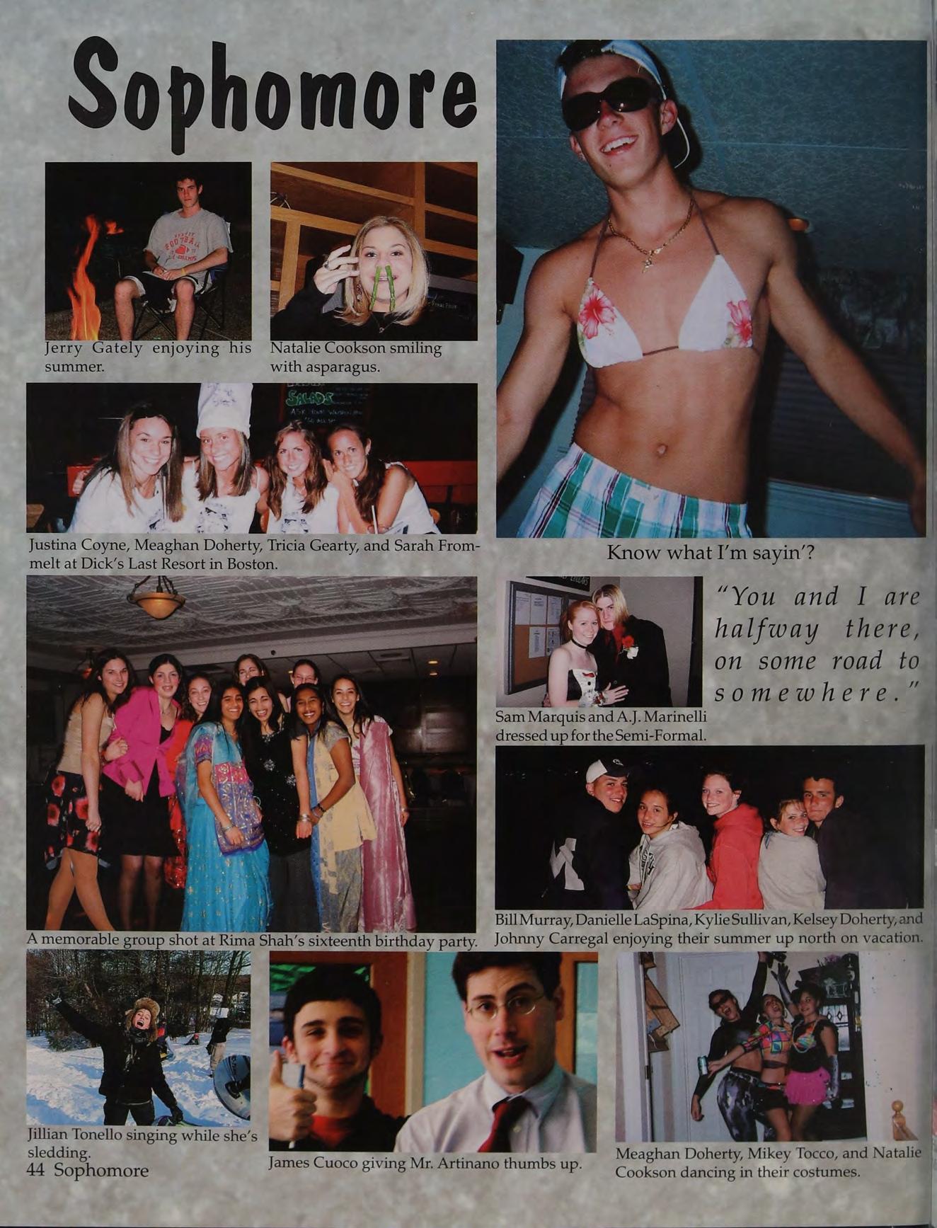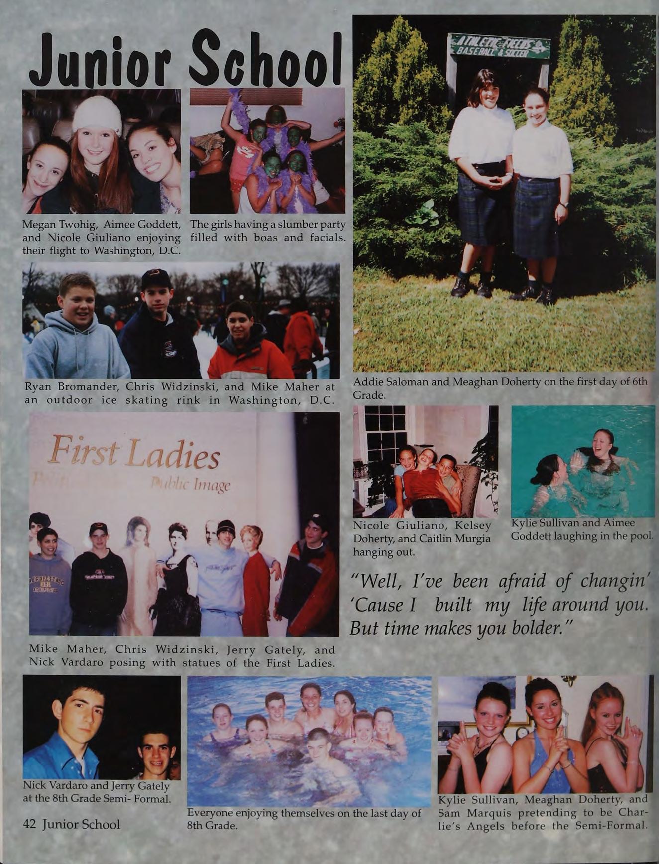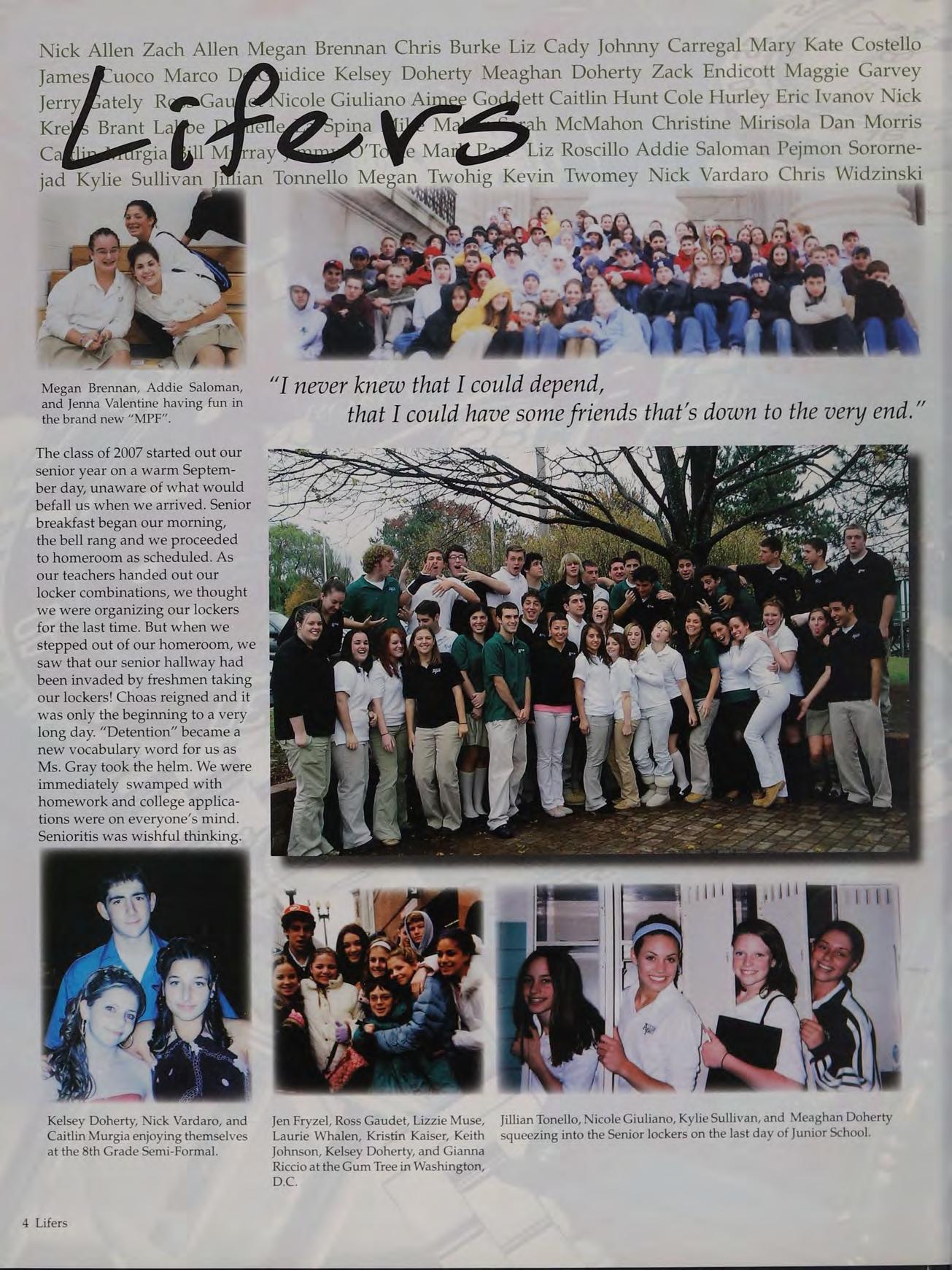 Kelsey Doherty, Nick Vardaro, and Jen Fryzel, Ross Gaudet, Lizzie Muse, _ Jillian Tonello, Nicole Giuliano, Kylie Sullivan, and Meaghan Doherty Caitlin Murgia enjoying themselves Laurie Whalen, Kristin Kaiser, Keith squeezing into the Senior lockers on the last day of Junior School. at the 8th Grade Semi-Formal. Johnson, Kelsey Doherty, and Gianna Riccio at the Gum Tree in Washington, DiC.