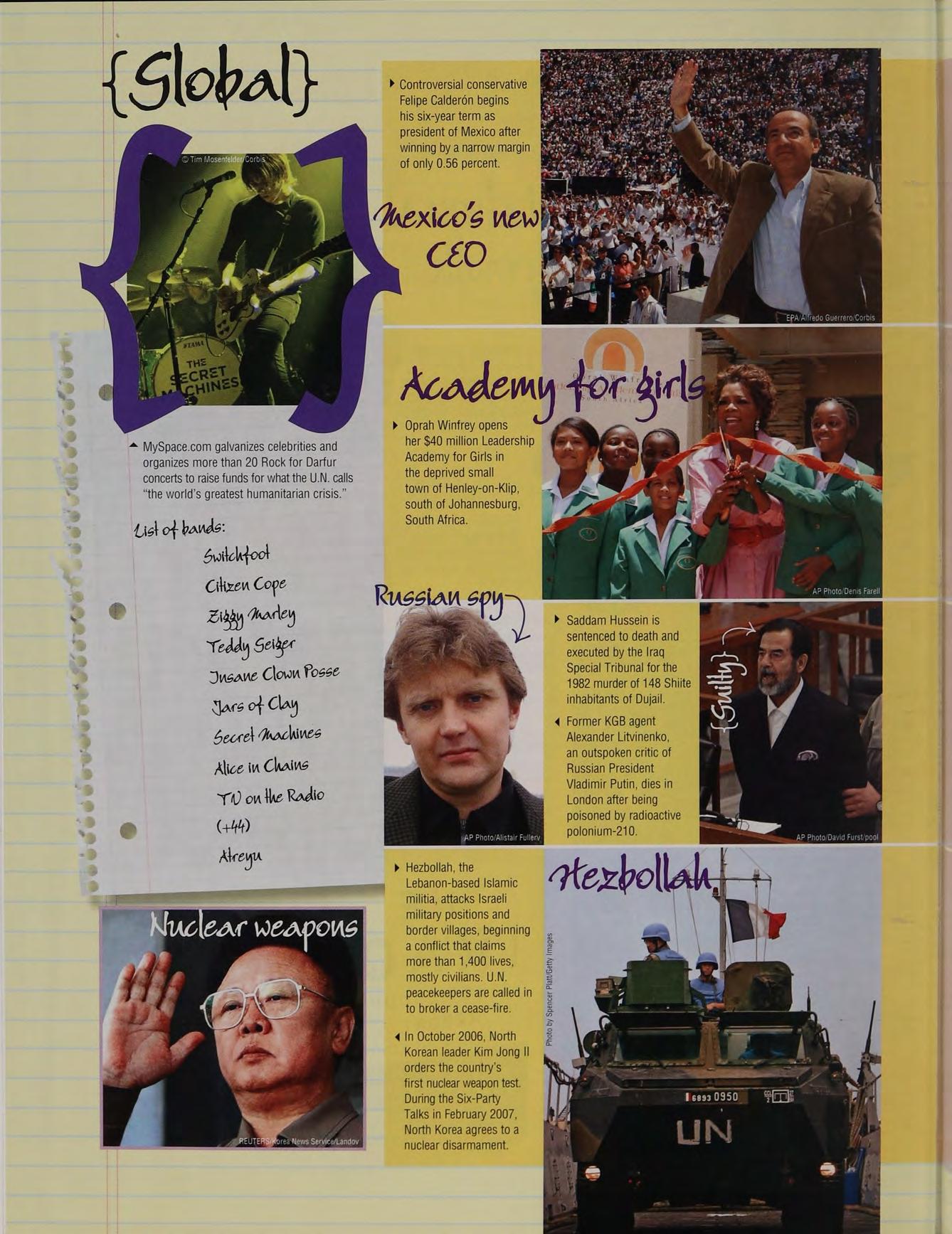 > Saddam Hussein is sentenced to death and executed by the Iraq Special Tribunal for the 1982 murder of 148 Shiite inhabitants of Dujail. = a~ Former KGB agent Alexander Litvinenko, an outspoken critic of Russian President Vladimir Putin, dies in London after being poisoned by radioactive polonium-210.
