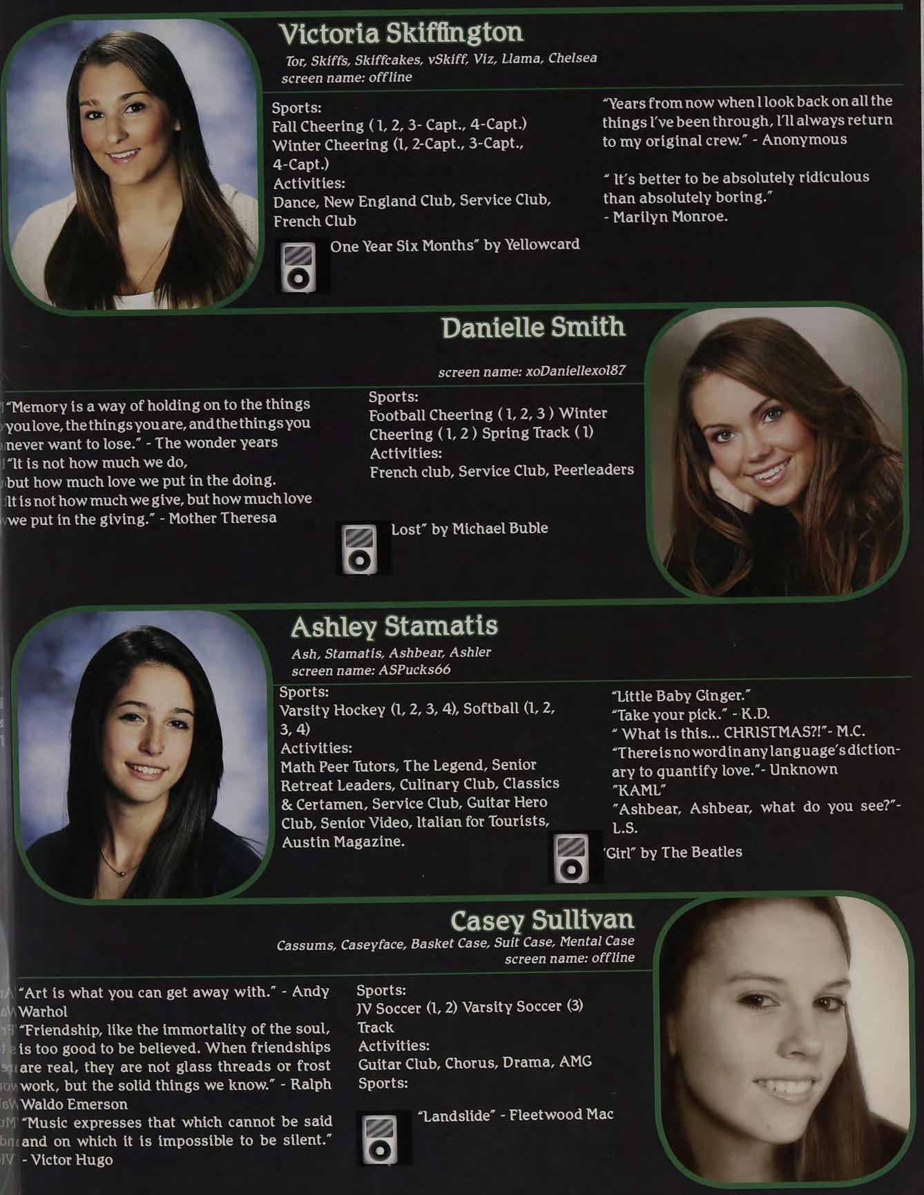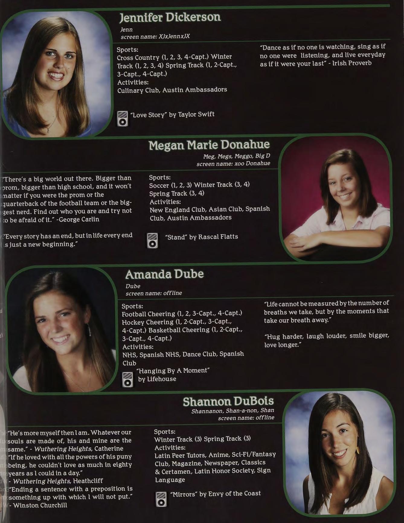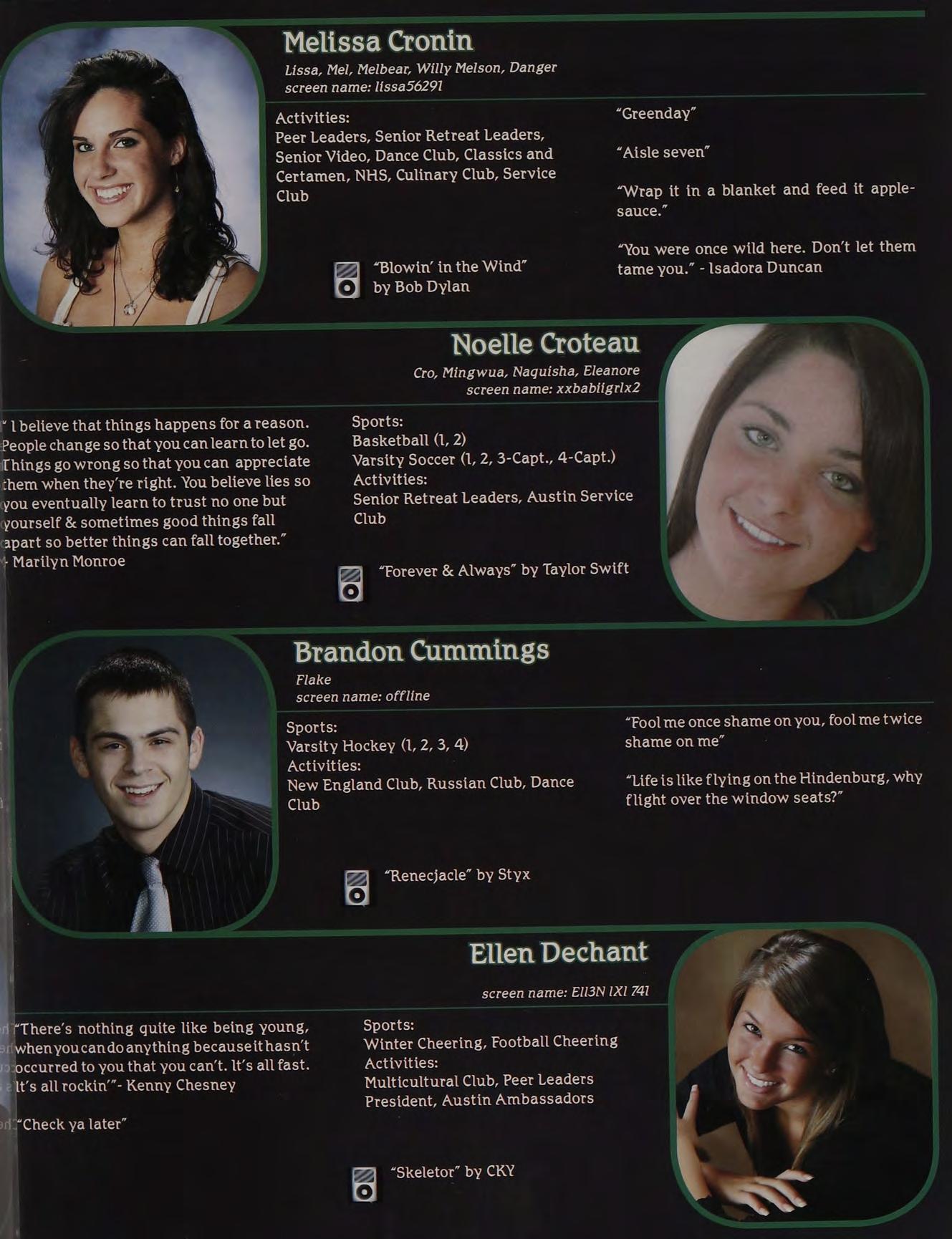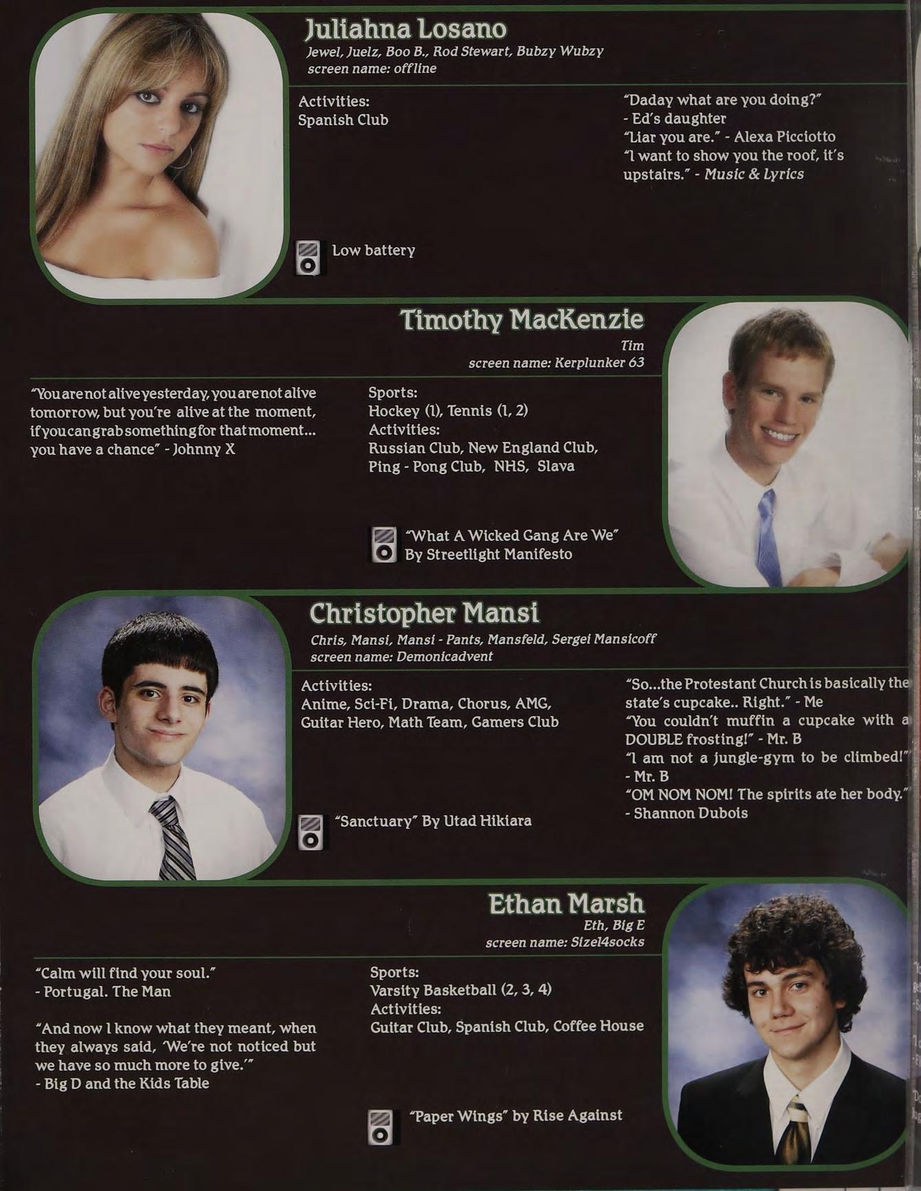 “Yeah, | called her up, she gave me a bunch of Intramural Sports, Peer Leaders, Senior crapabout menotlisteningtoher orsomething. Retreat Leaders, New England Club ldon’t know, l wasn’t really paying attention.”