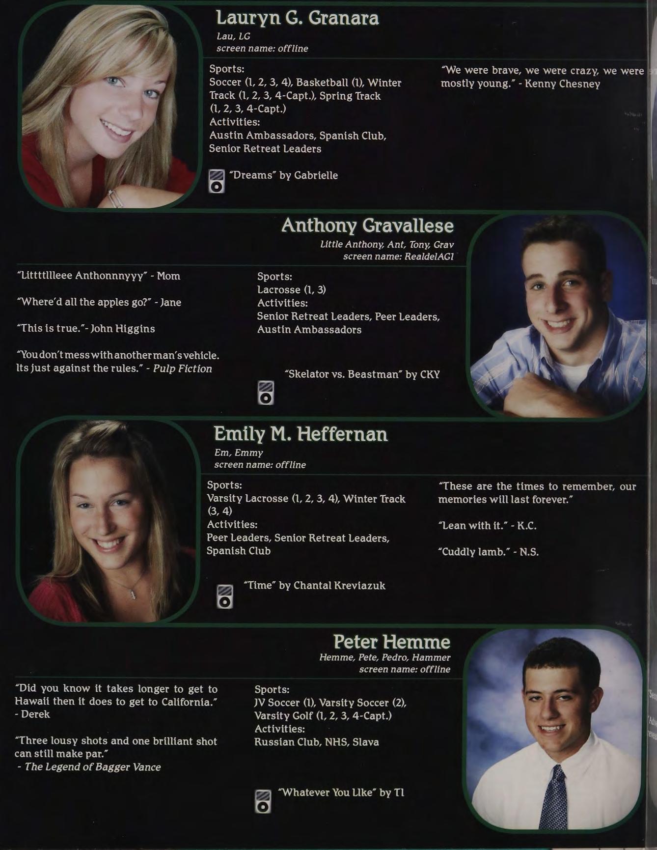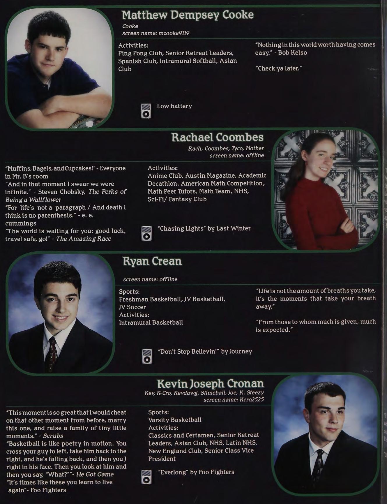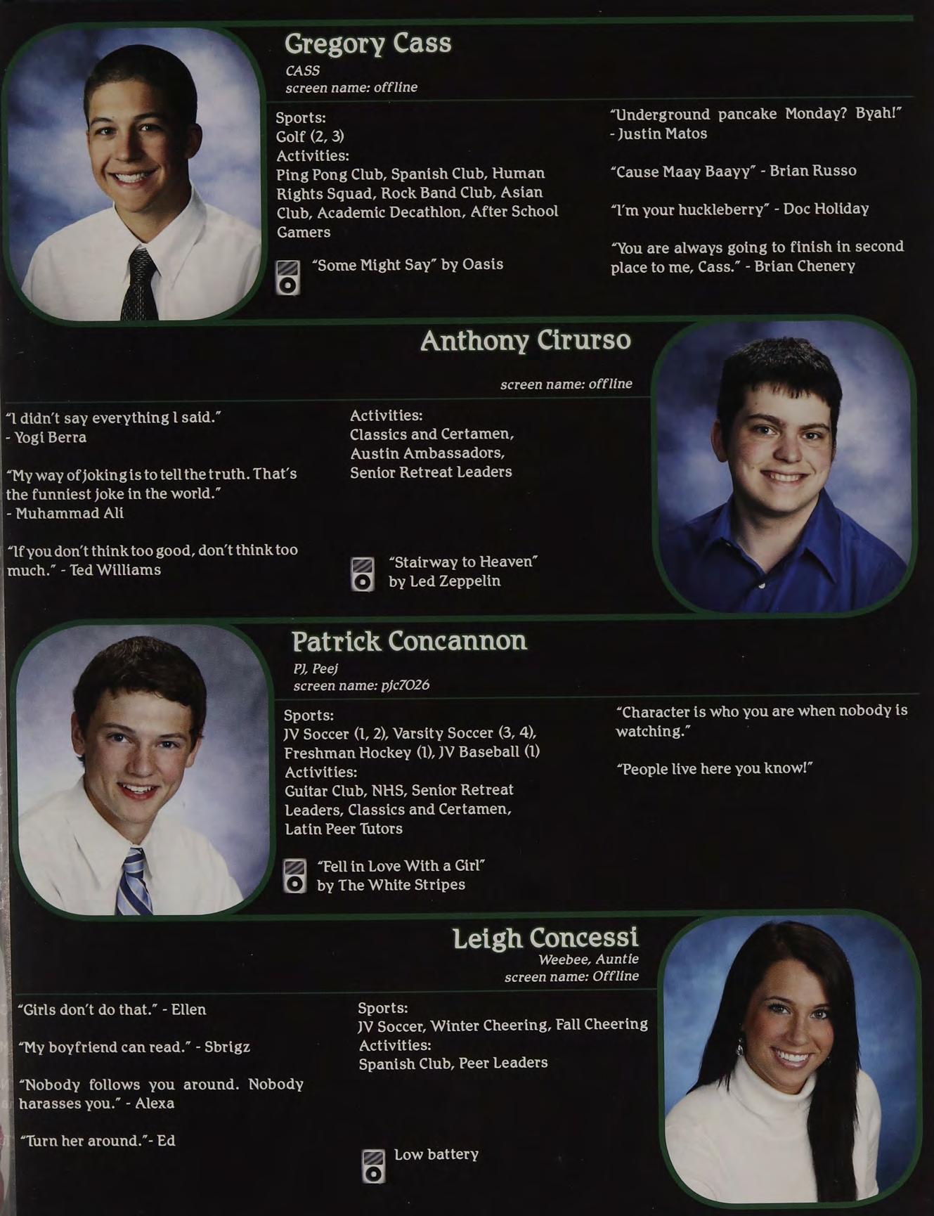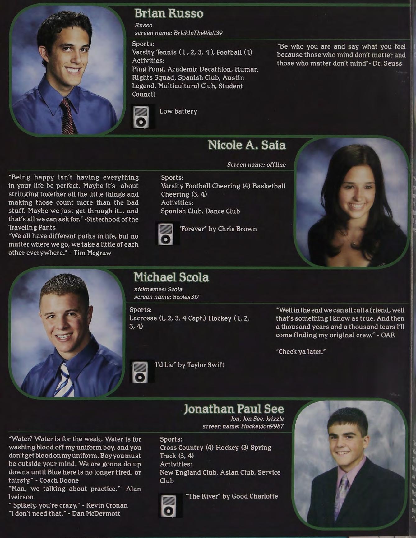“Yeah, | called her up, she gave me a bunch of Intramural Sports, Peer Leaders, Senior crapabout menotlisteningtoher orsomething. Retreat Leaders, New England Club ldon’t know, l wasn’t really paying attention.”