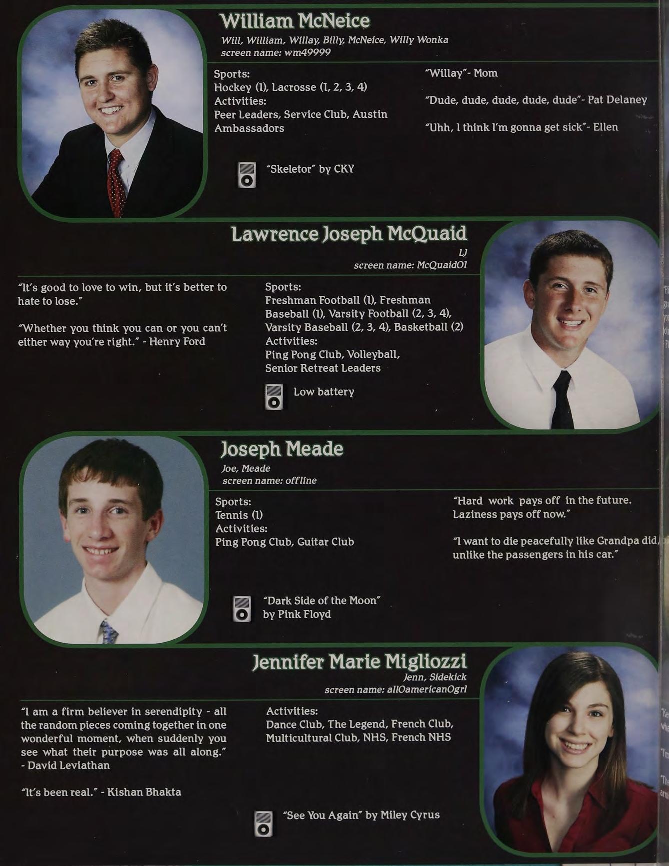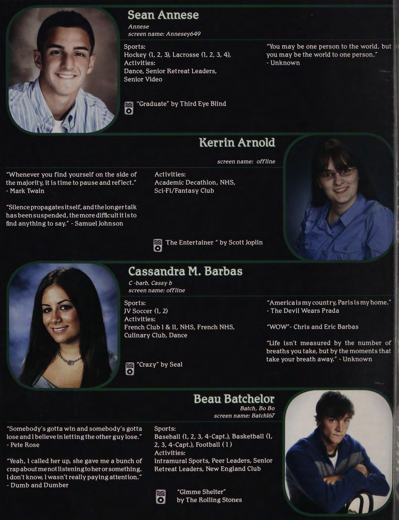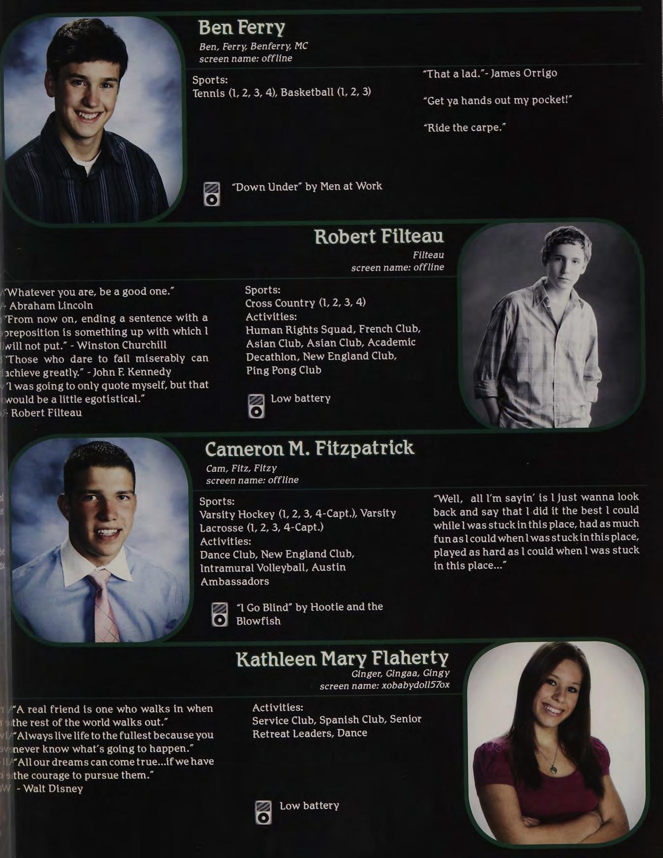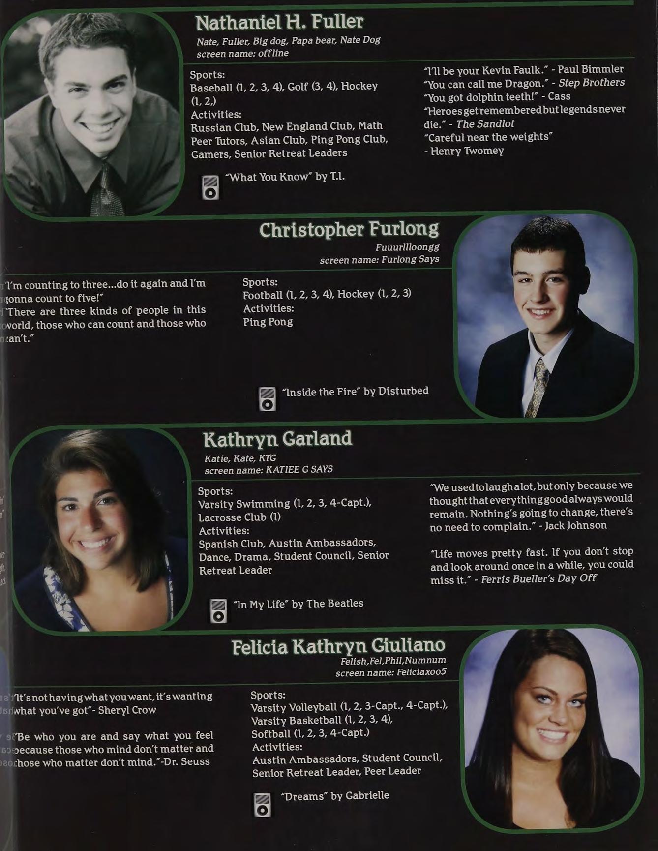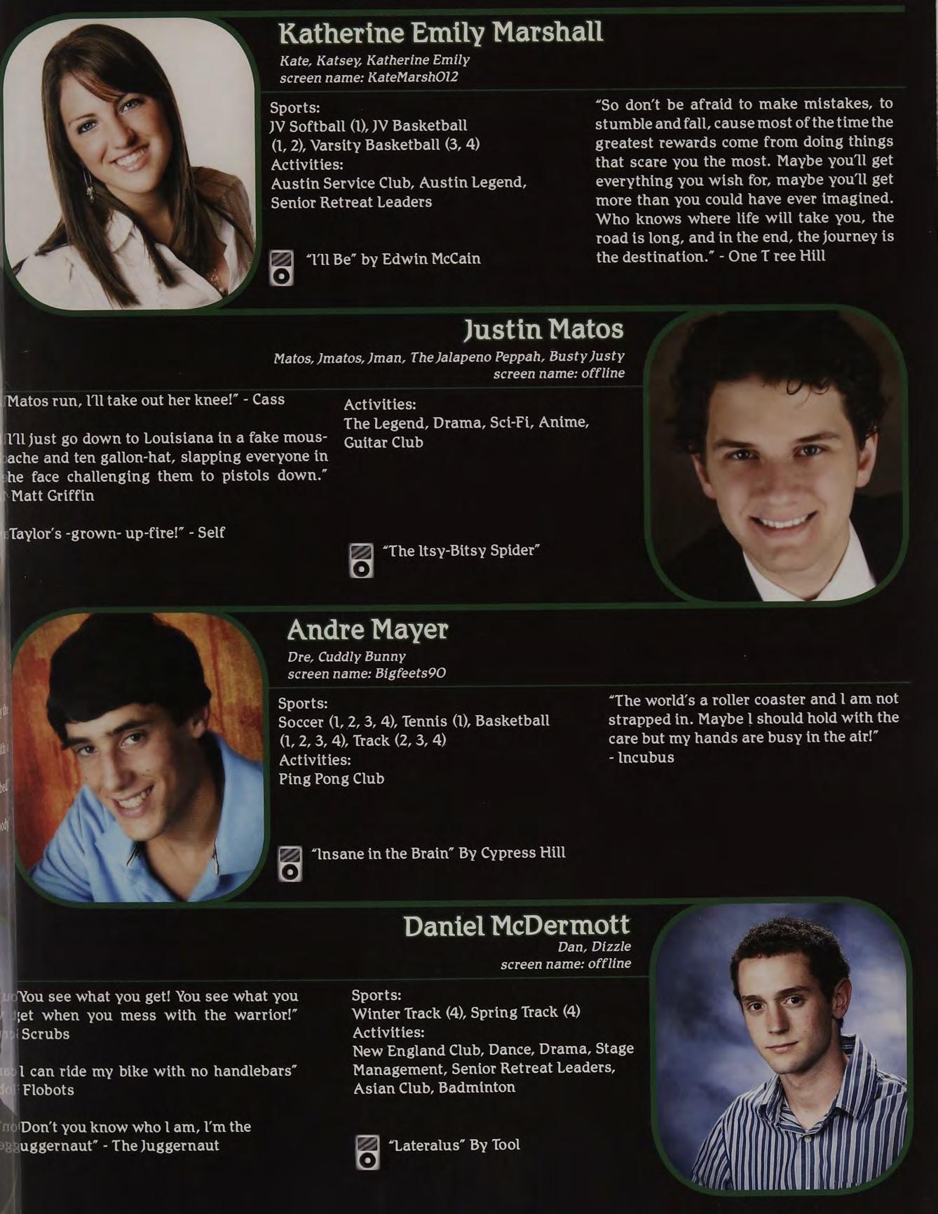 “Yeah, | called her up, she gave me a bunch of Intramural Sports, Peer Leaders, Senior crapabout menotlisteningtoher orsomething. Retreat Leaders, New England Club ldon’t know, l wasn’t really paying attention.”